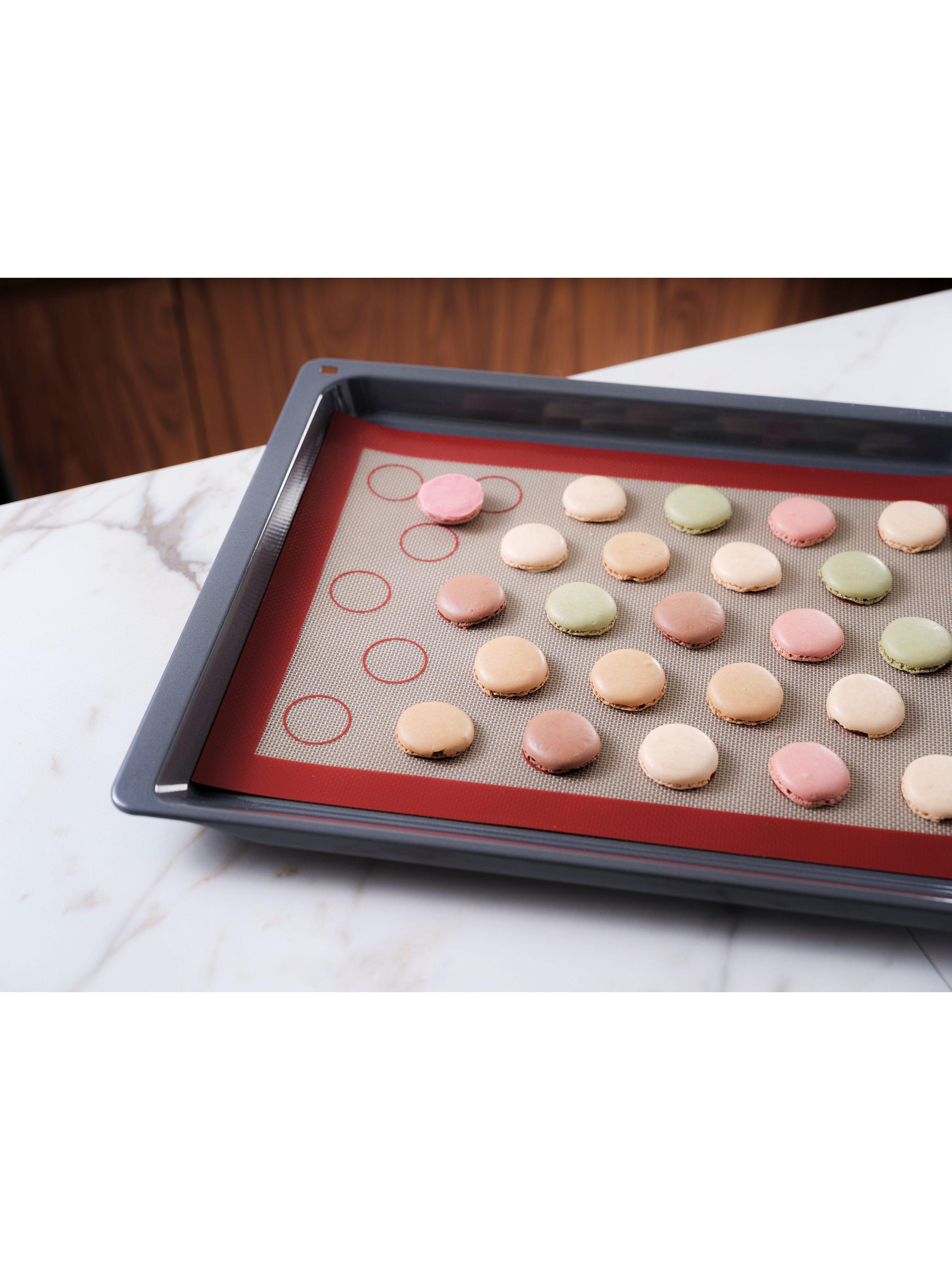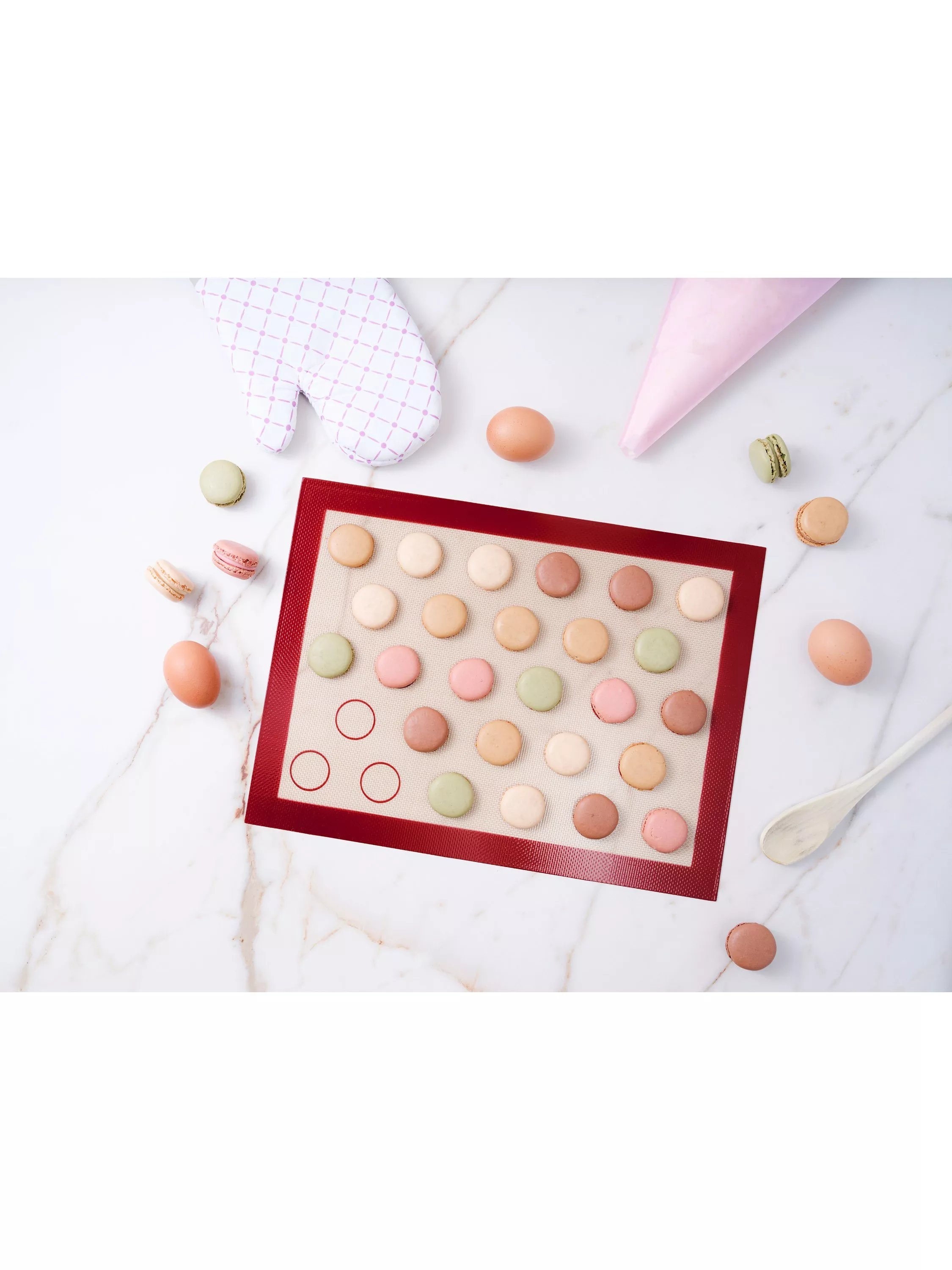 The NoStik® silicone macaron mat has 28 preprinted circles for perfectly placed macarons. It can also be used to bake any other kind of pastries and doubles as an anti-slip work surface for kneading, mixing, preparing and rolling out dough, pasta and patties.