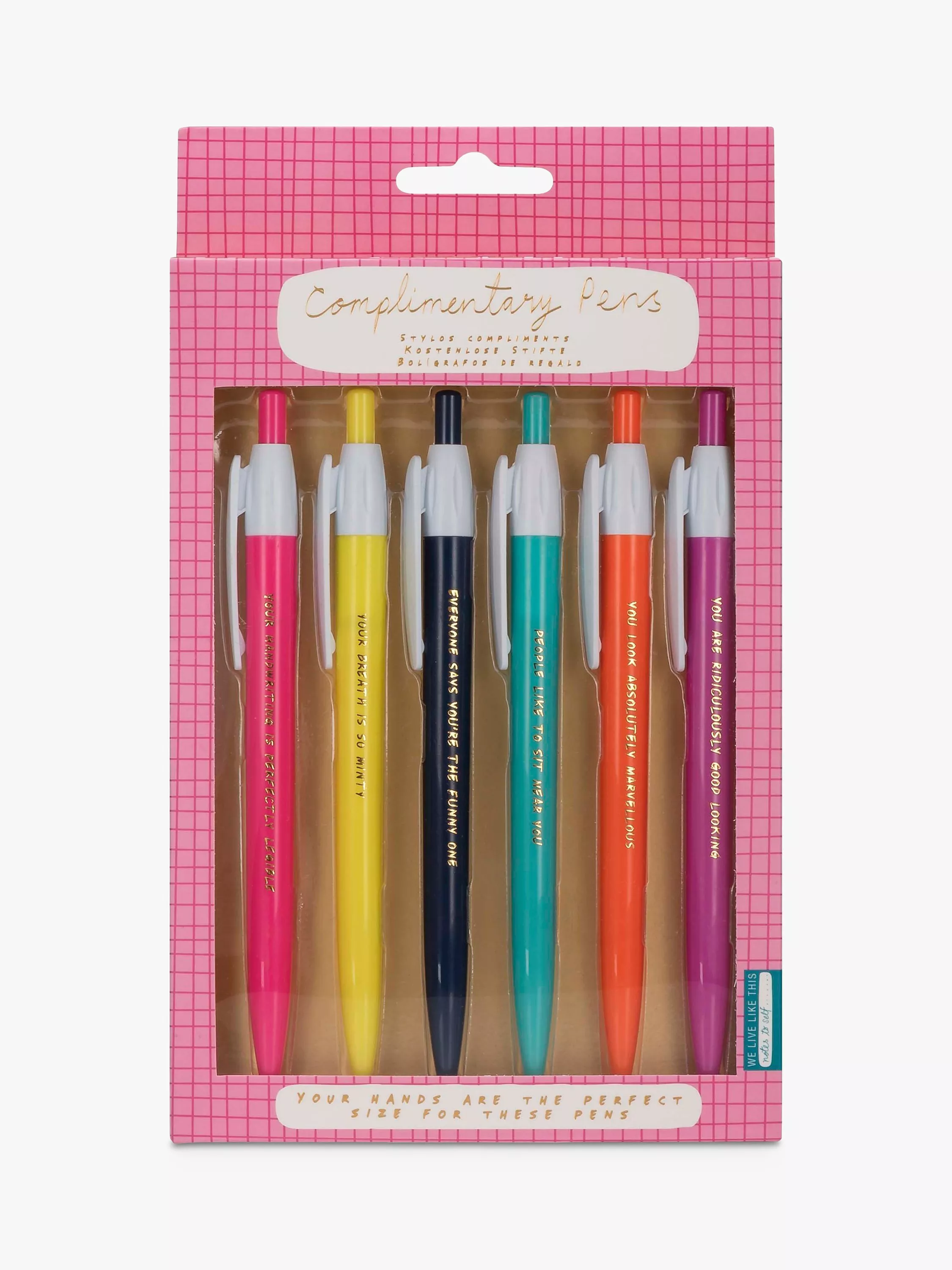 6 Bright coloured pens each with a quirky compliment. There’s nothing nicer than a cheeky compliment and these pens are guaranteed to make you smile. In tonal bright colours with a positive statement embossed in gold, take your pick from six mood boosting quirky compliments and write happy.