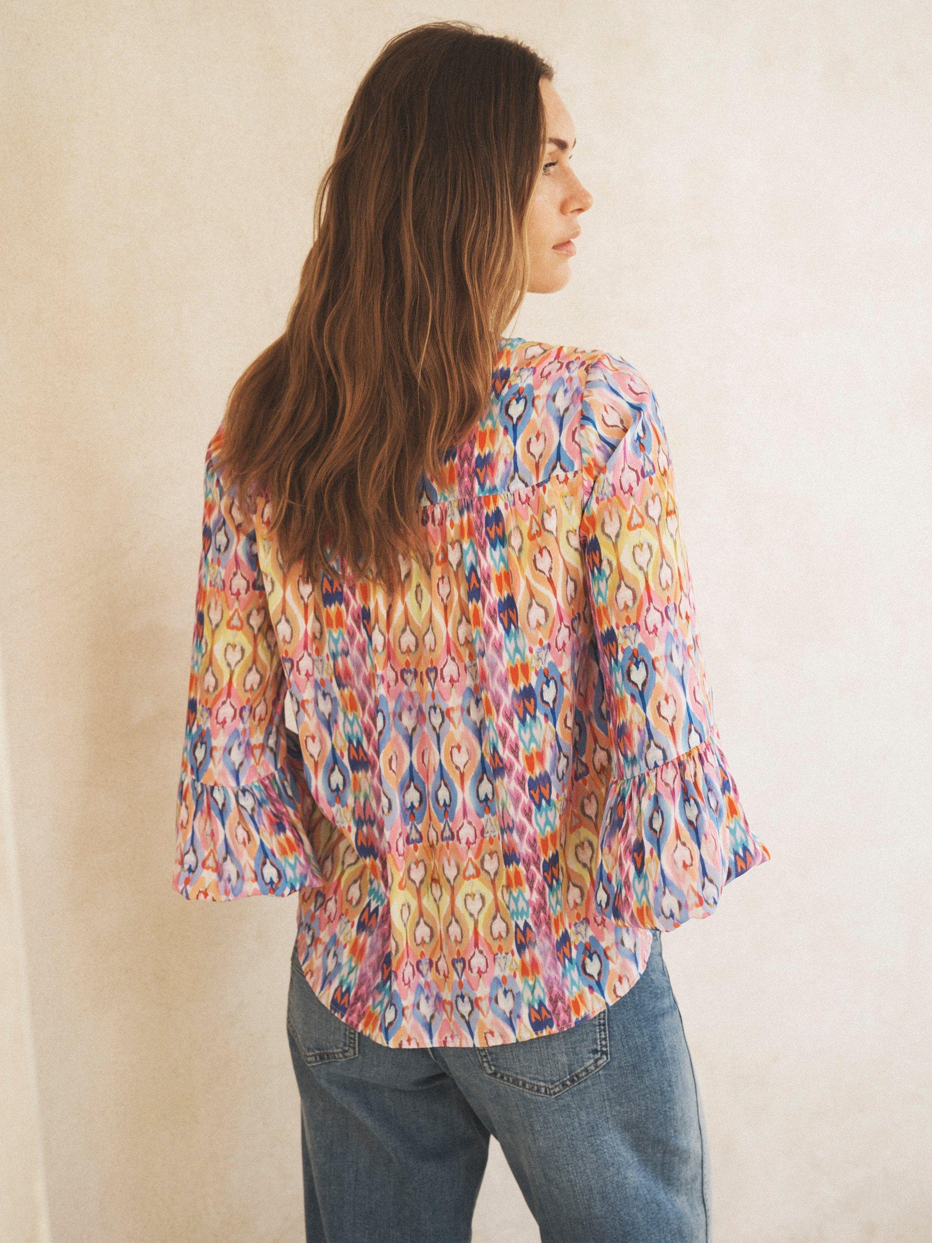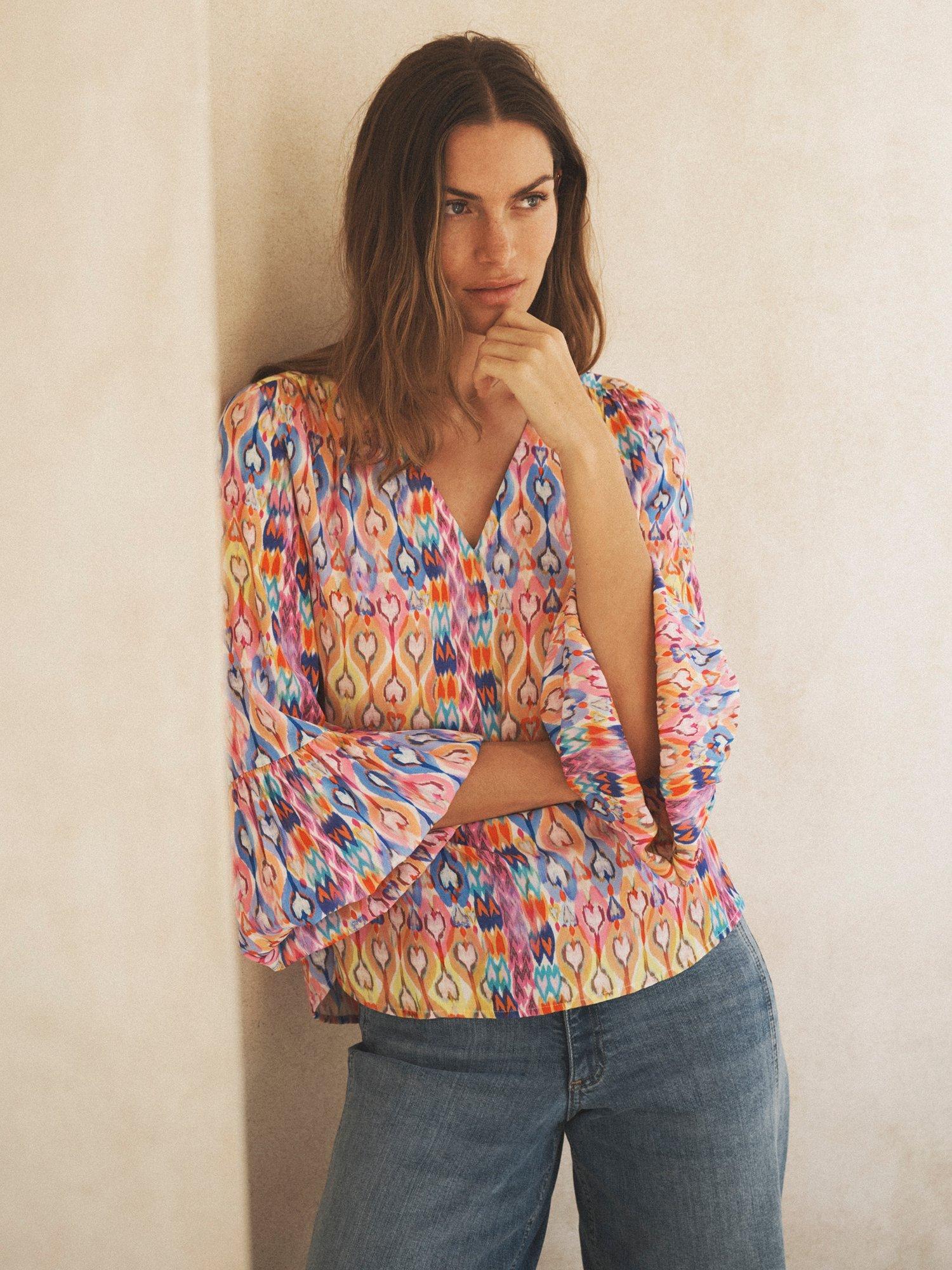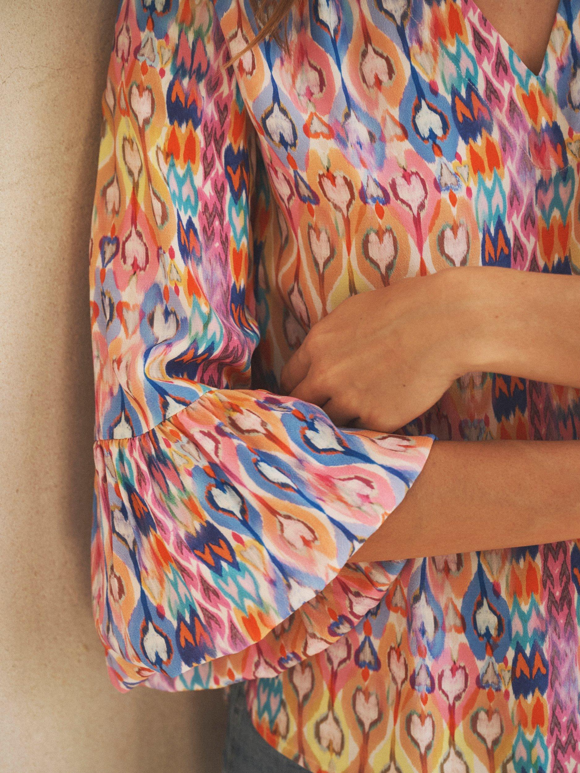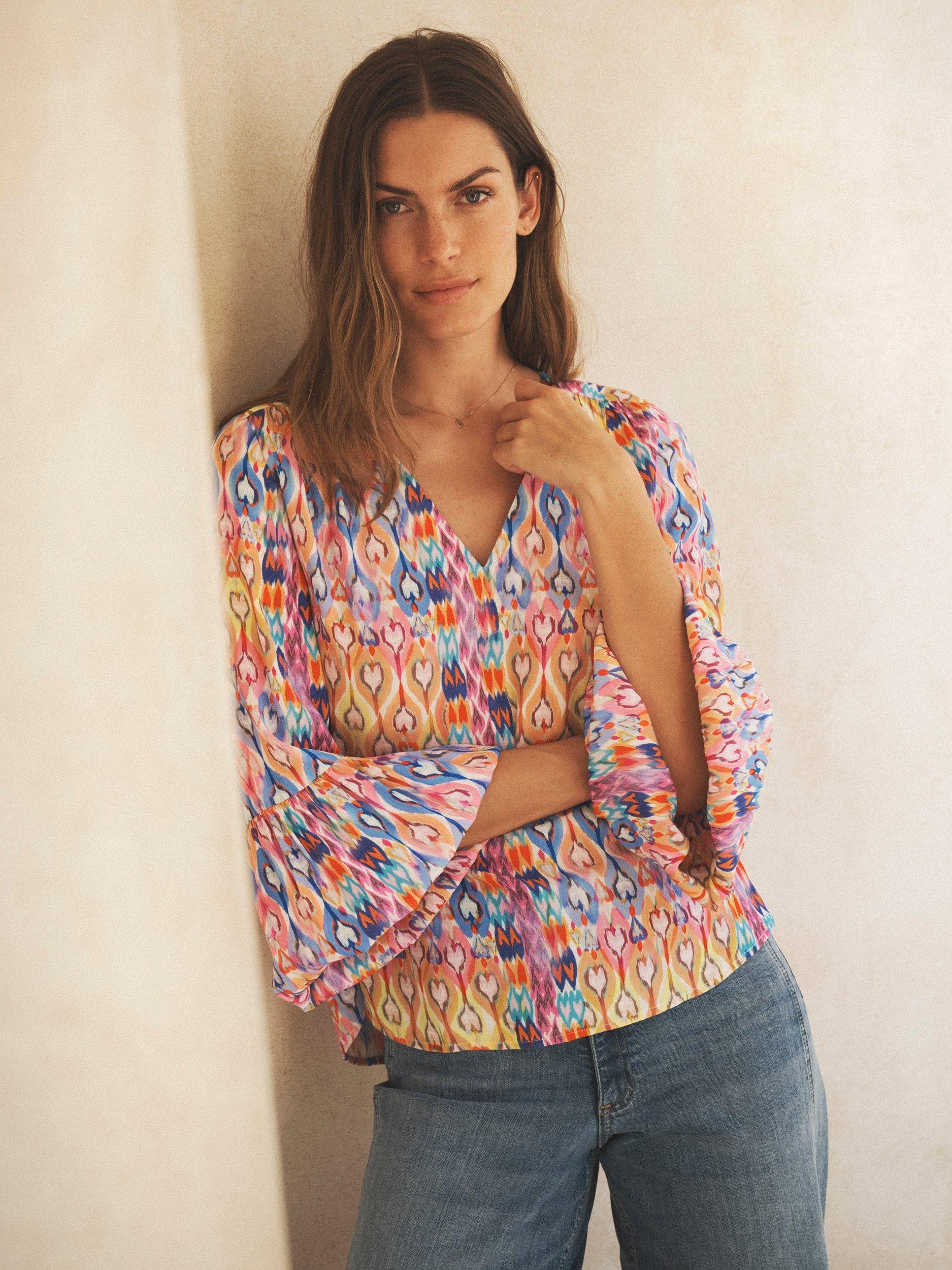Effortless elegance meets playful charm with the Amala viscose top. Crafted from soft viscose, this versatile piece features a flattering V-neck and heart print that adds a touch of romance to your everyday wardrobe. Elasticated, adjustable sleeves let you customise the fit, while gathers at the back create beautiful movement and dimension.