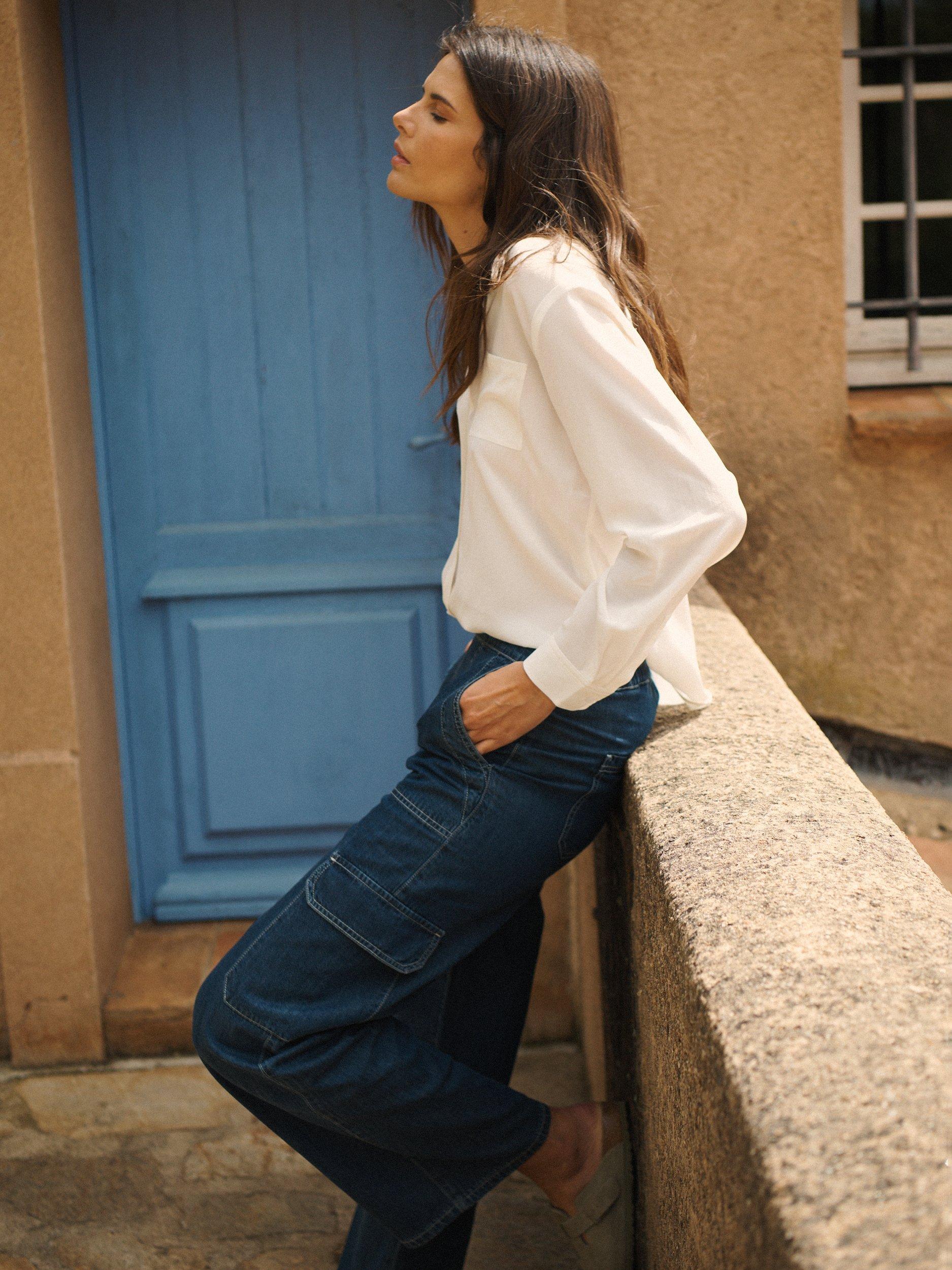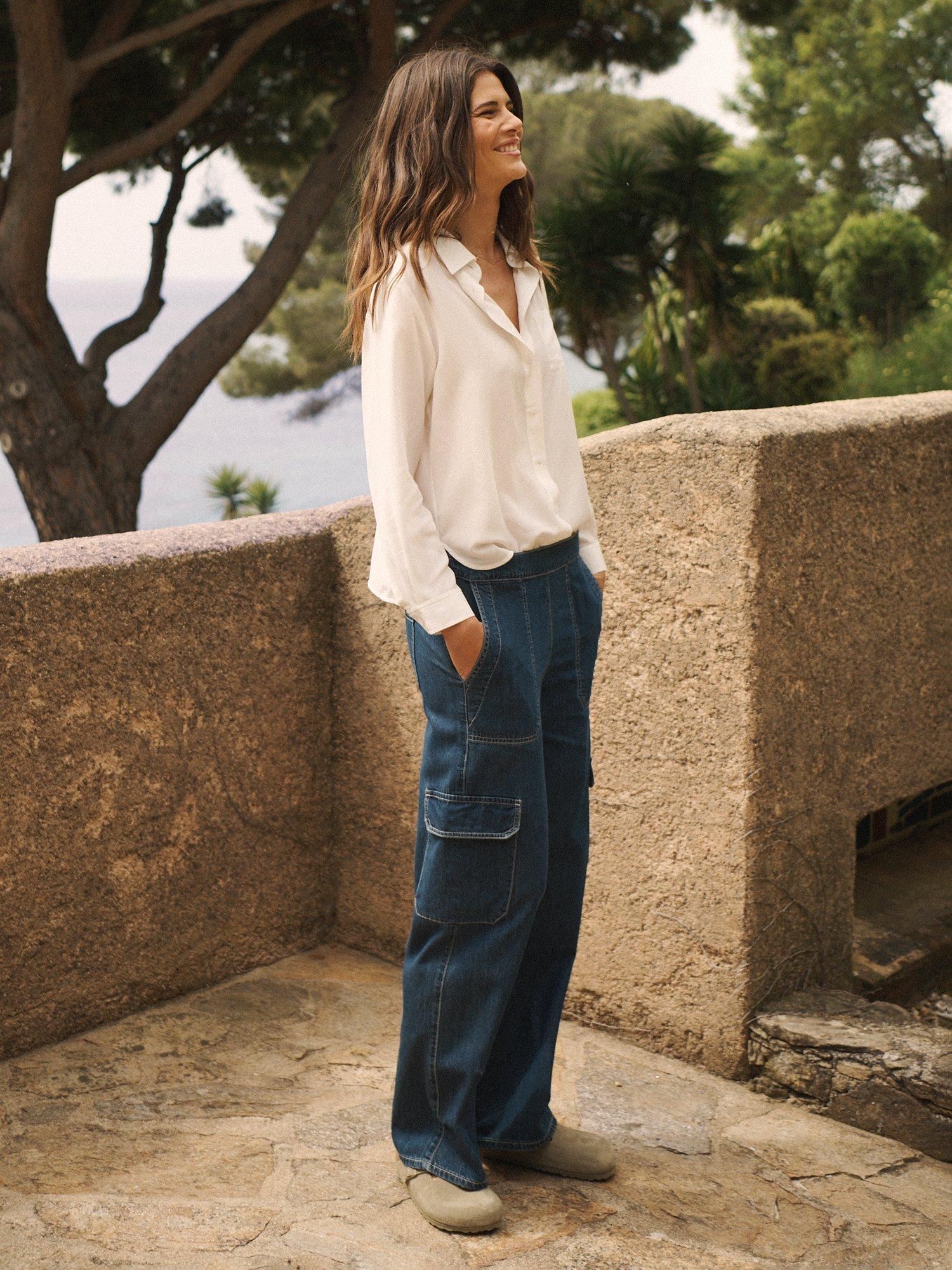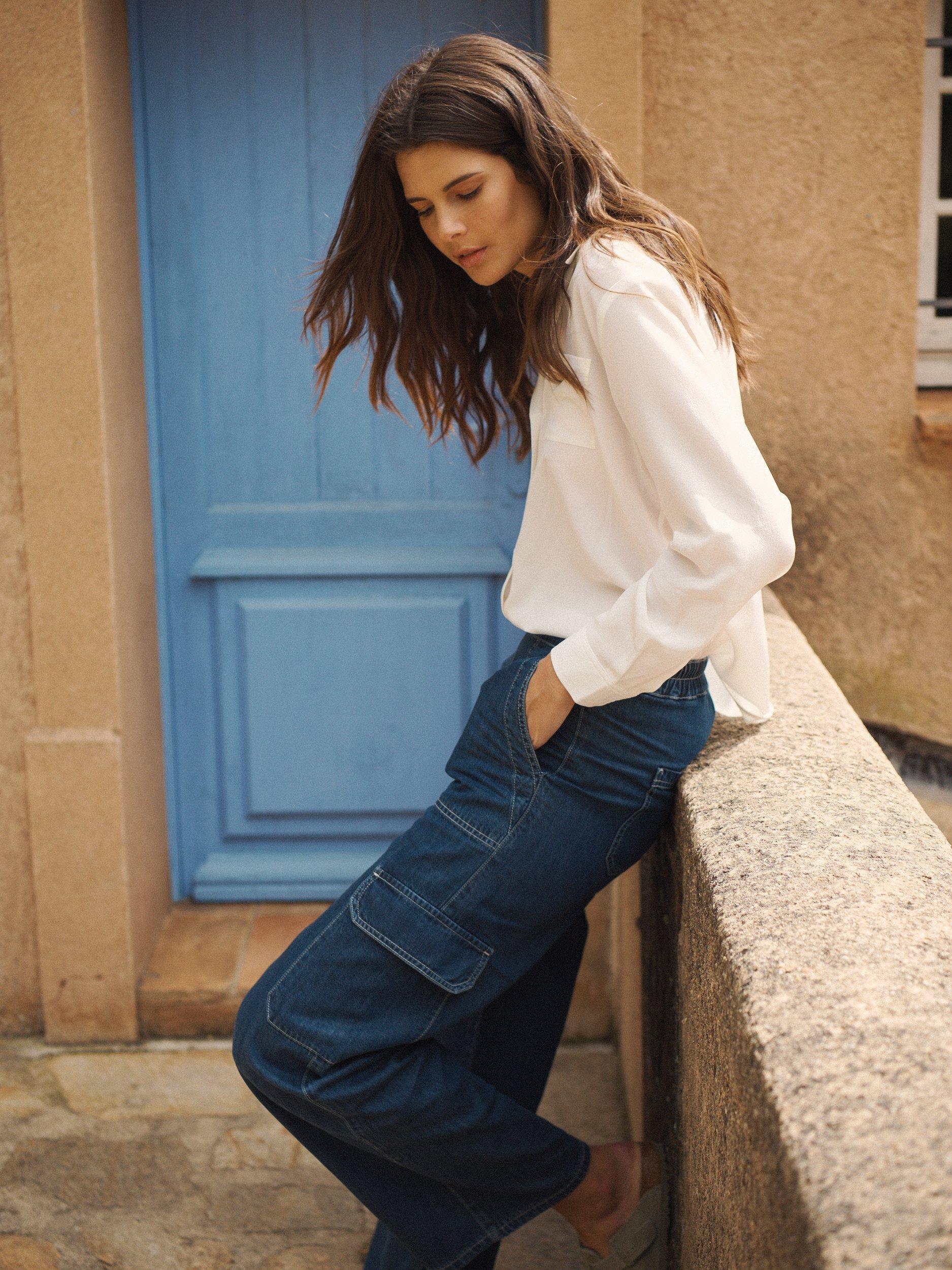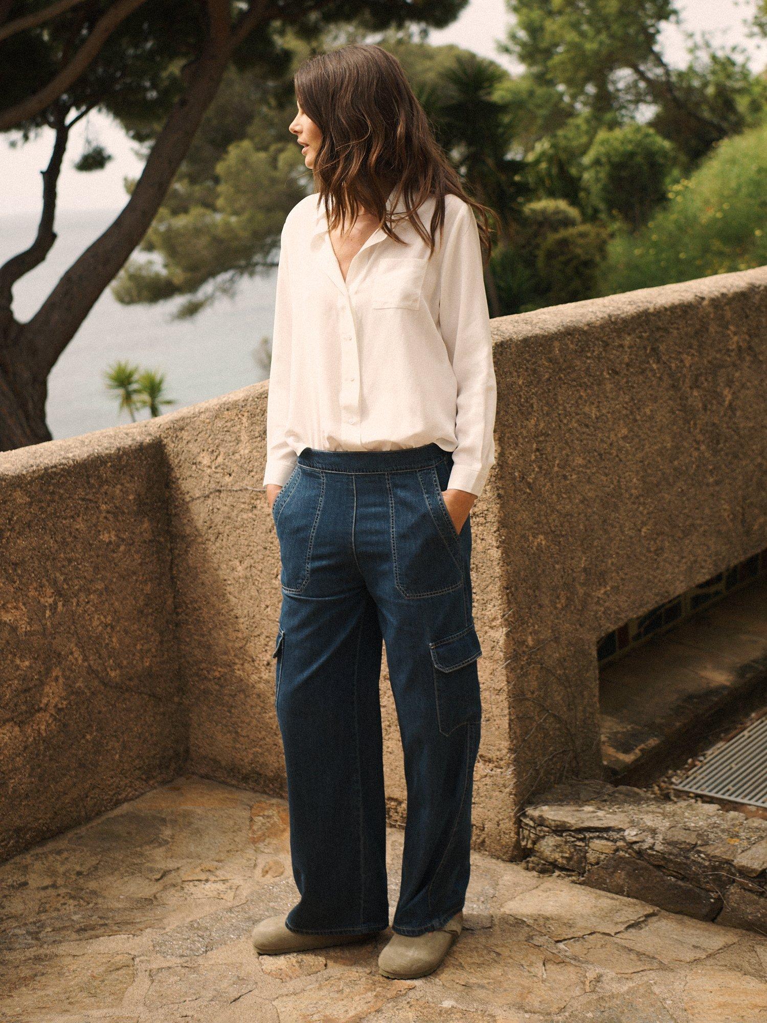 NRBY's Camilla cargo trousers now come in luxurious denim tencel - a modern twist on utilitarian styling, in a relaxed silhouette with side pockets, cargo pockets and elasticated waist. Perfect for every day, team with a t-shirt and trainers, or add a touch of sophistication with a silk shirt.