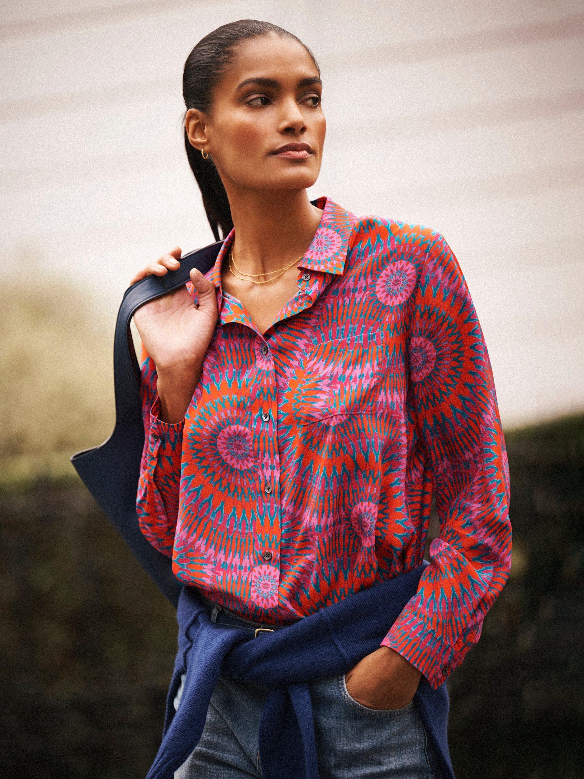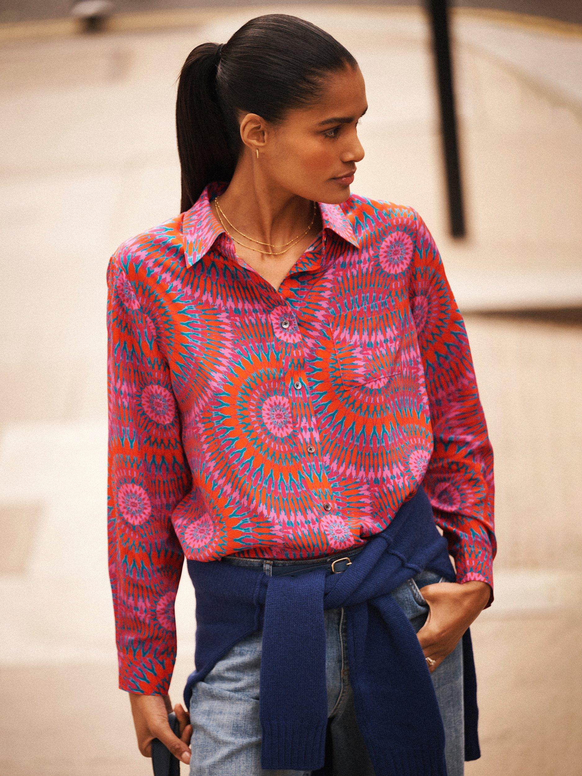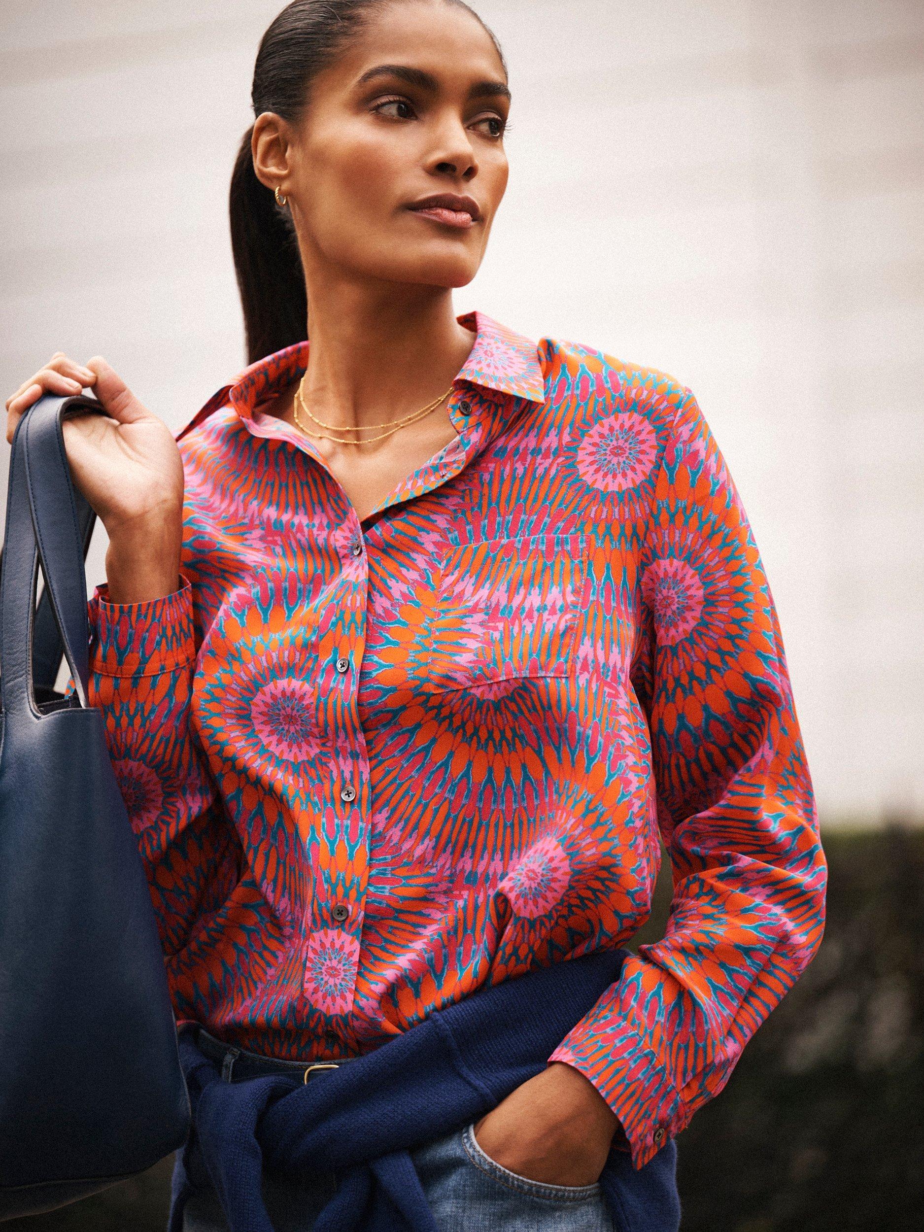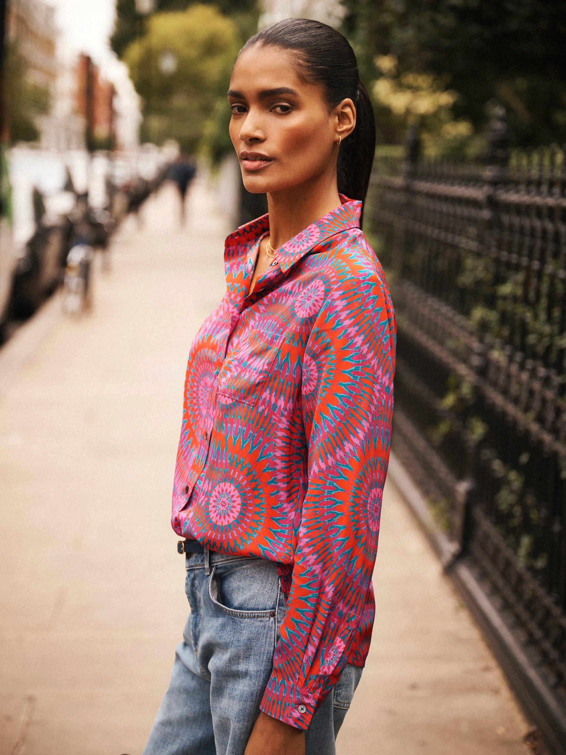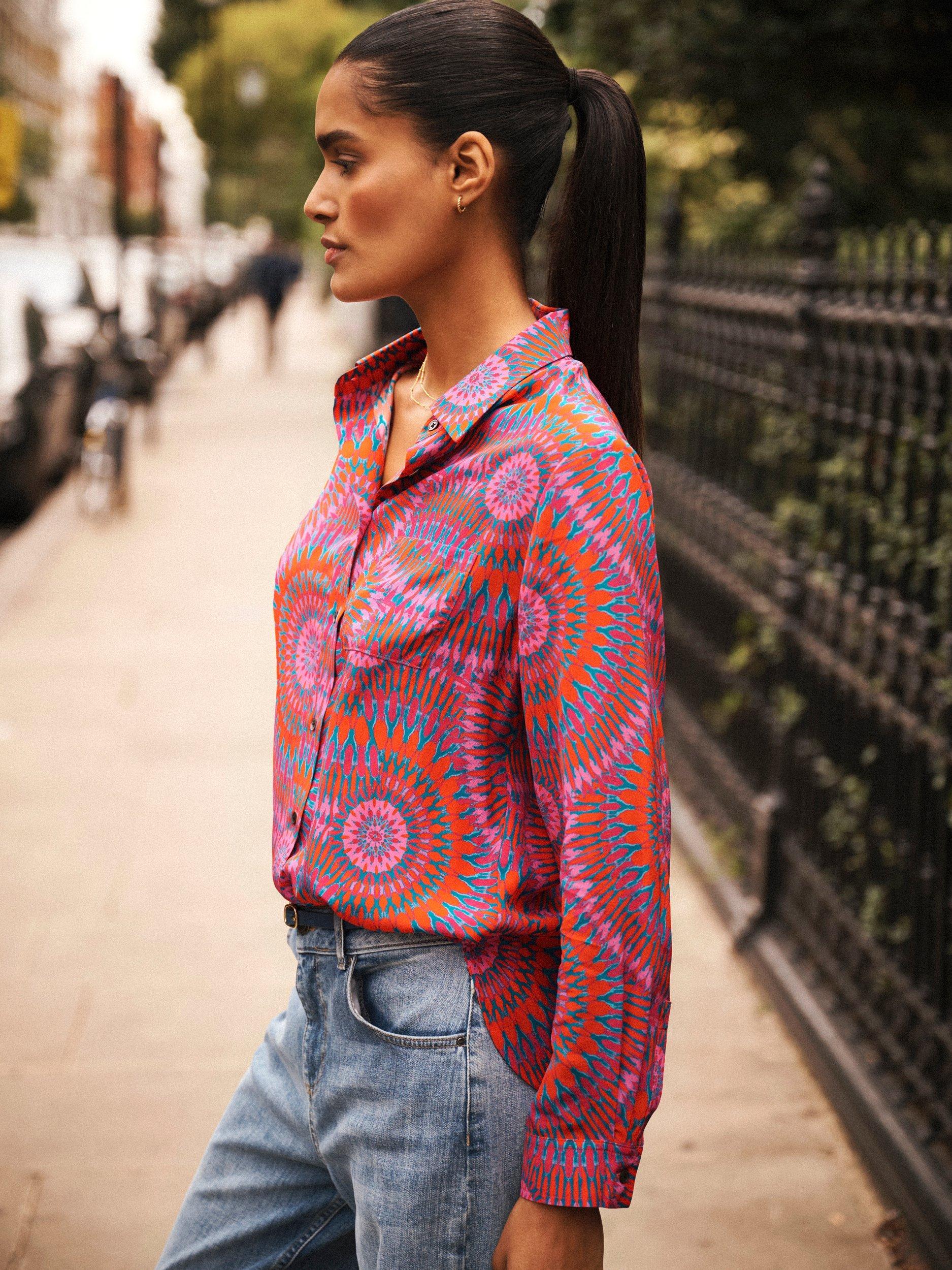 An everyday shirt from NRBY, made in pure silk. Featuring a collar and long sleeves, it's designed with an abstract print. Casual, comfortable, and effortlessly chic.