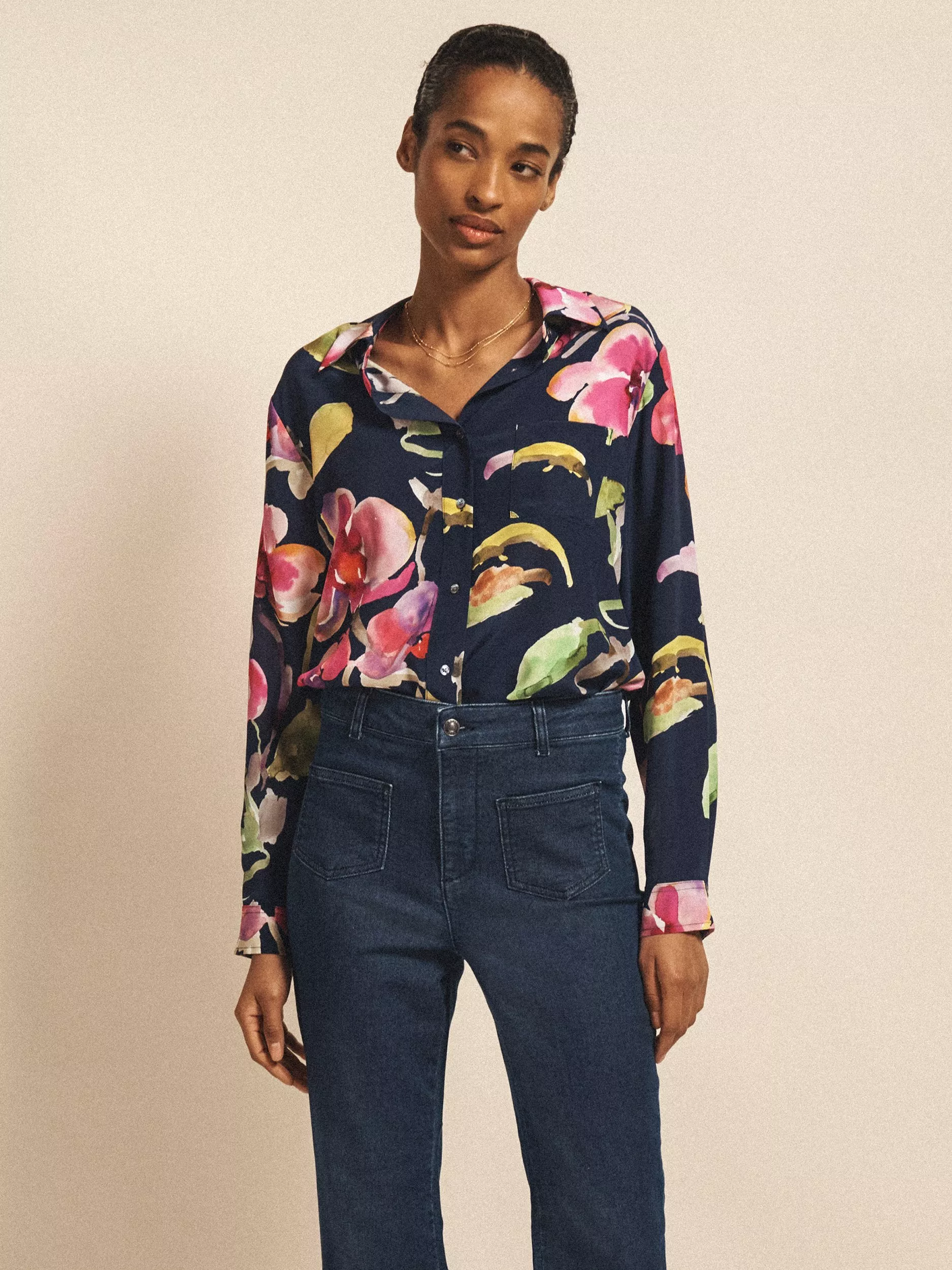 The Chiara shirt is a beautiful and timeless piece, crafted with exquisite 100% silk fabric in a button-through style - reimagined in a brand new orchid print.