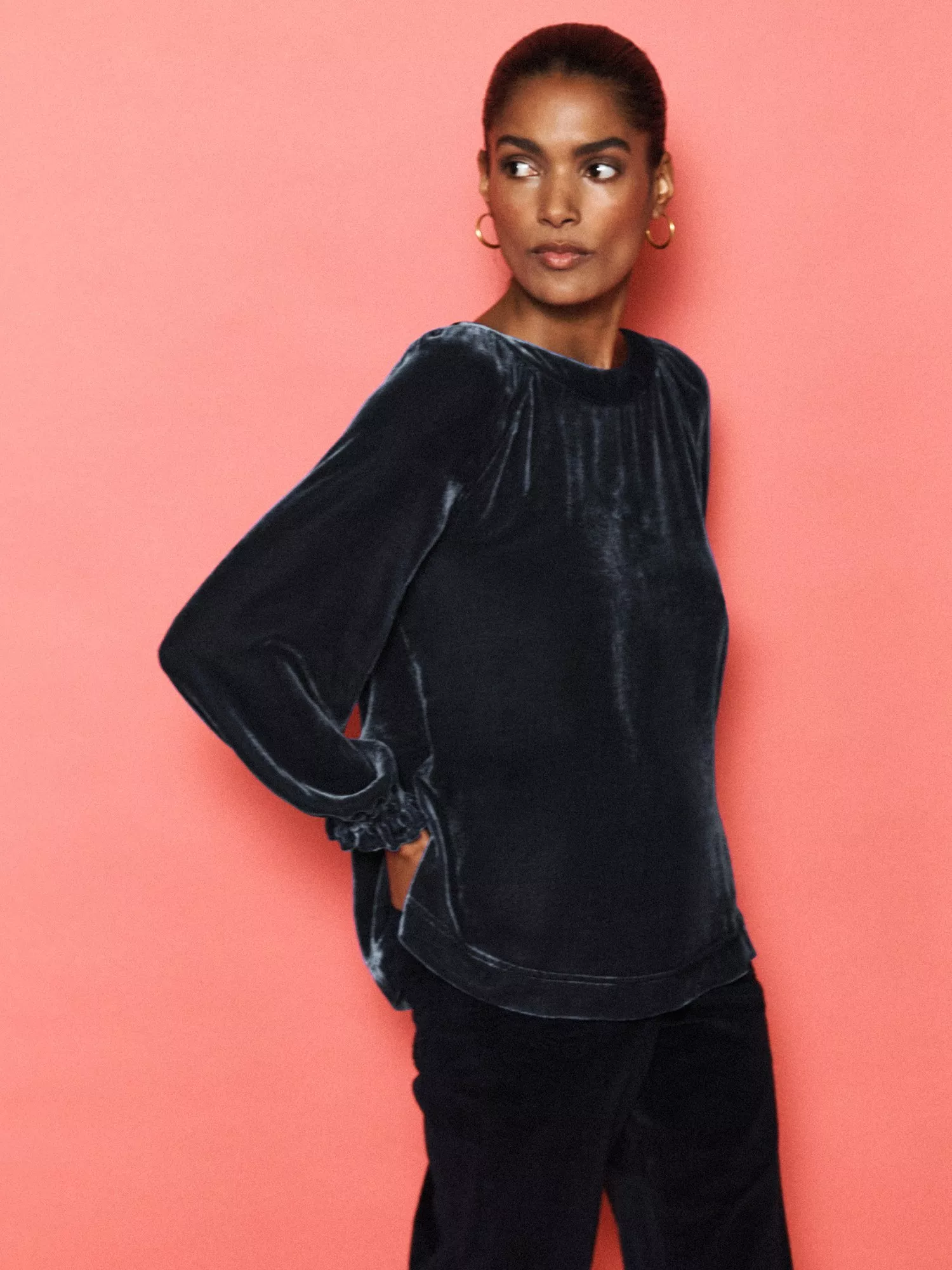 Say hello to Daphne. A velvet top made for the party season. With a wide boat neckline and shirred cuffs, this piece balances elegance with ease.