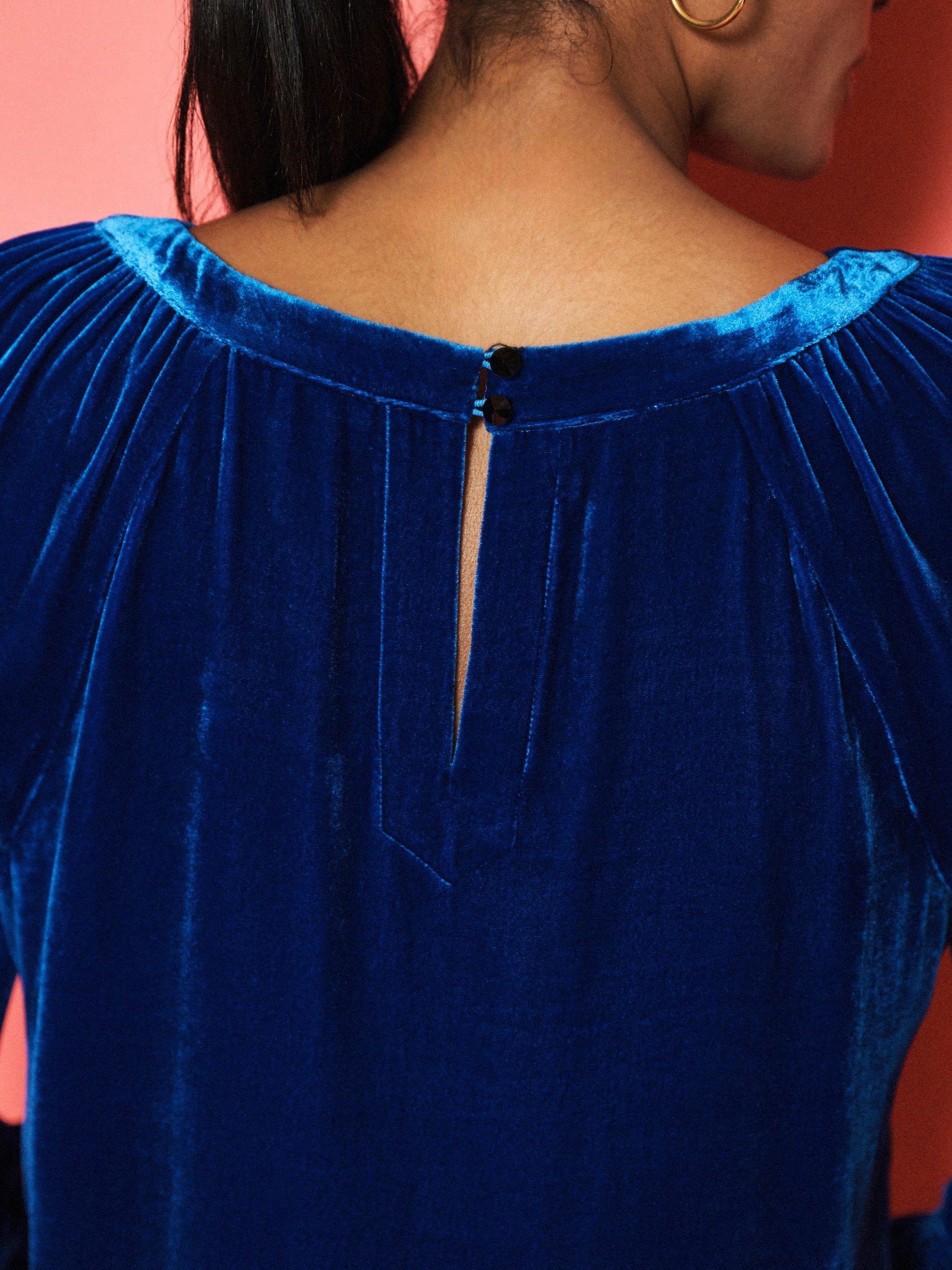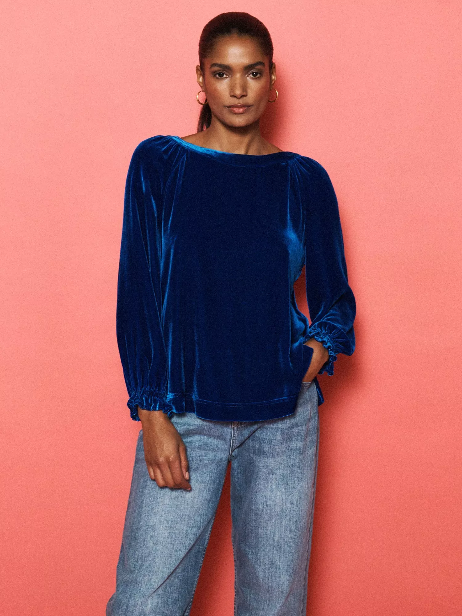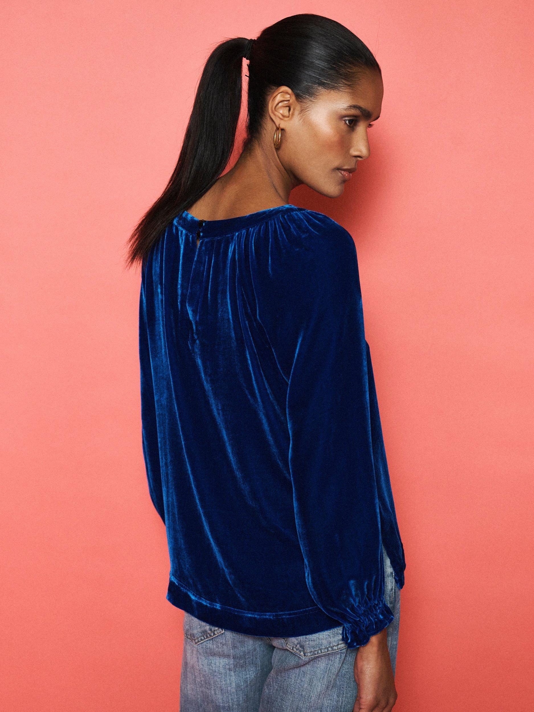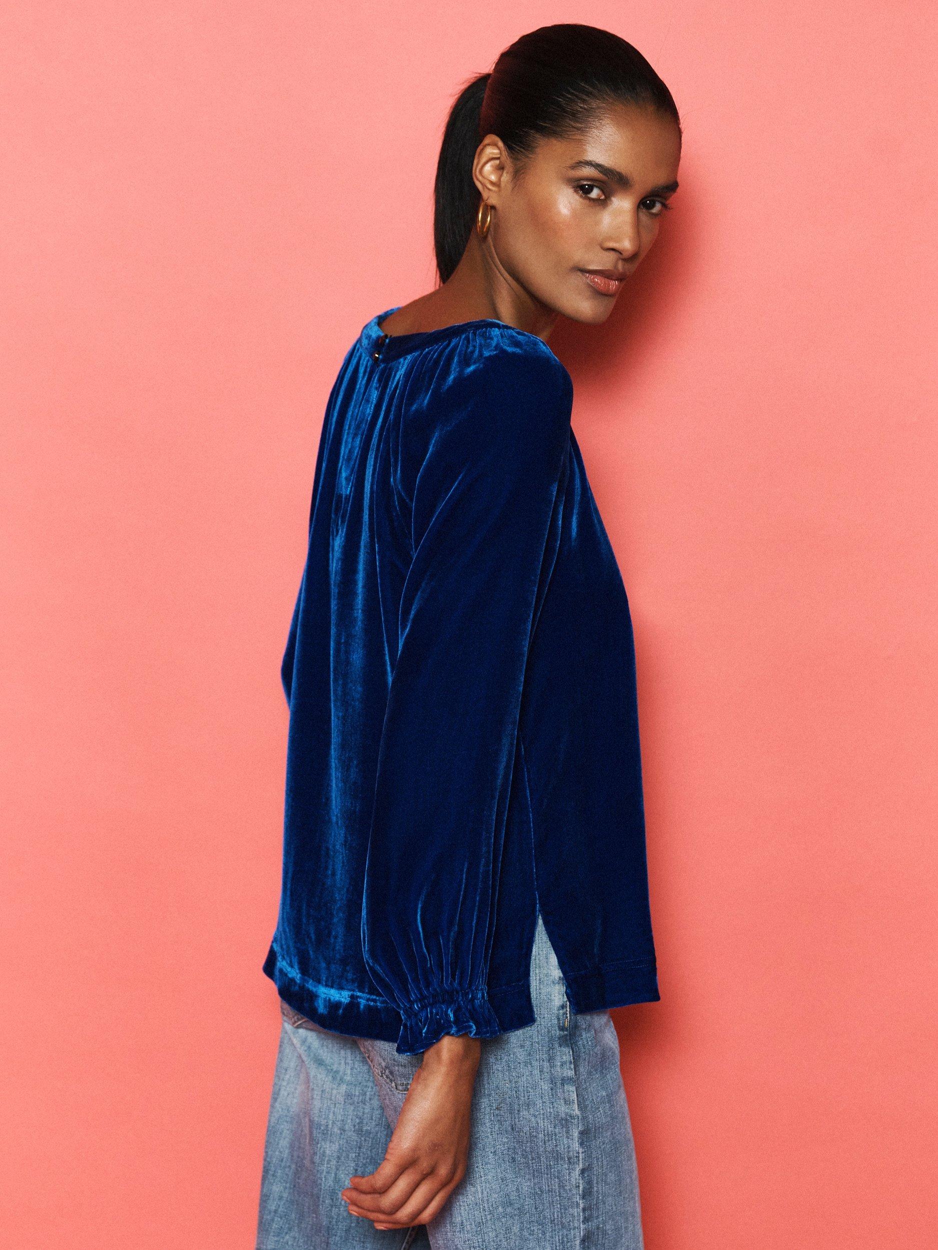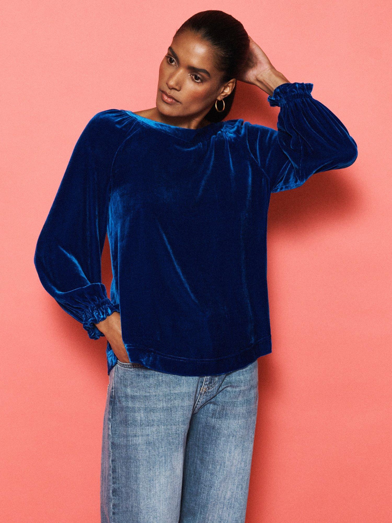 Say hello to Daphne. A velvet top made for the party season. With a wide boat neckline and shirred cuffs, this piece balances elegance with ease.