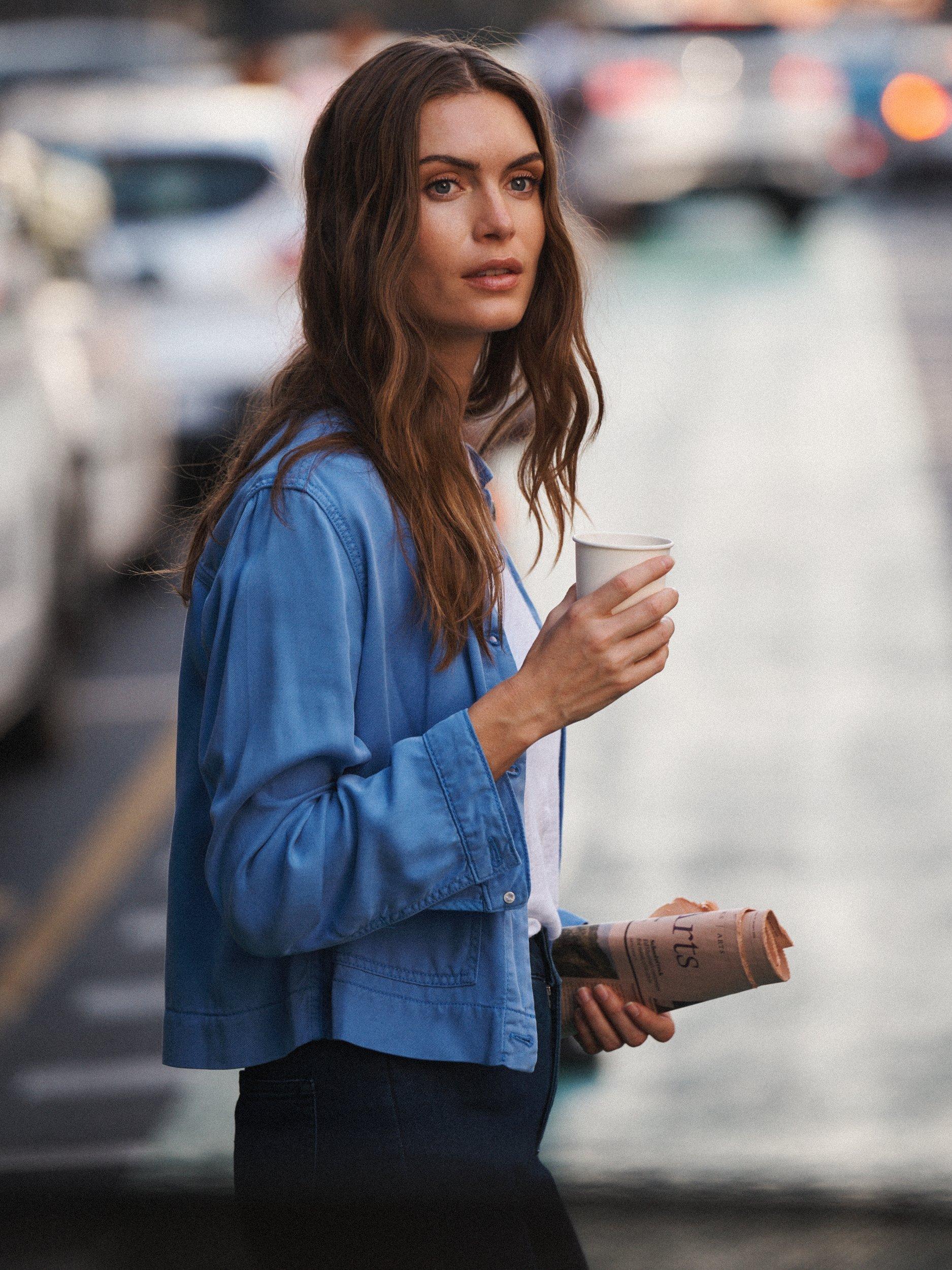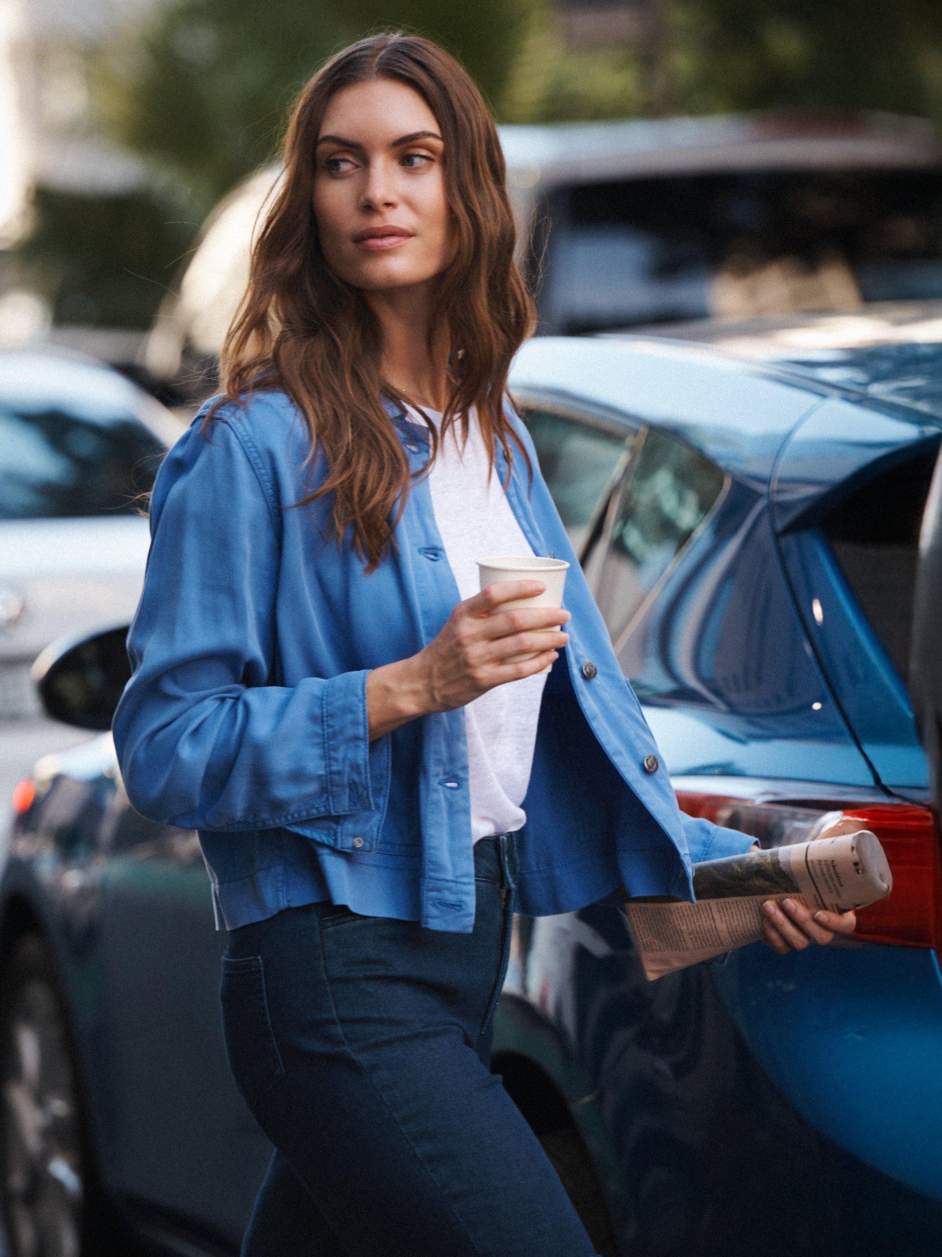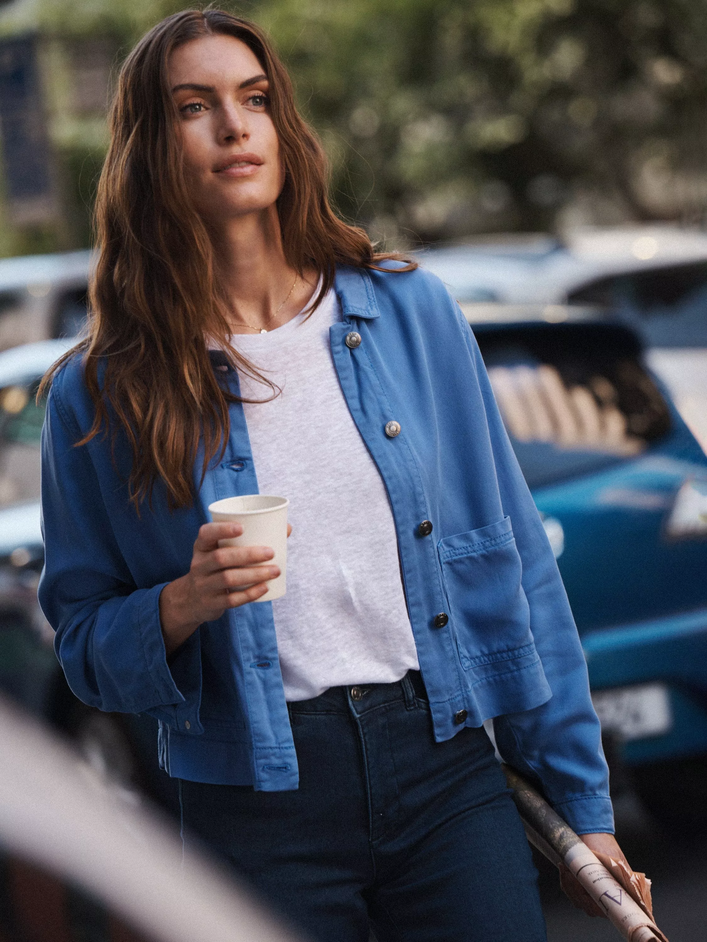 Elodie has been updated this season in 100% buttery soft Tencel. Detailed with 2 patch pockets and a centre front metal fastening. This timeless jacket, will pair with just about everything. Pair with combats, or throw over a silk dress.