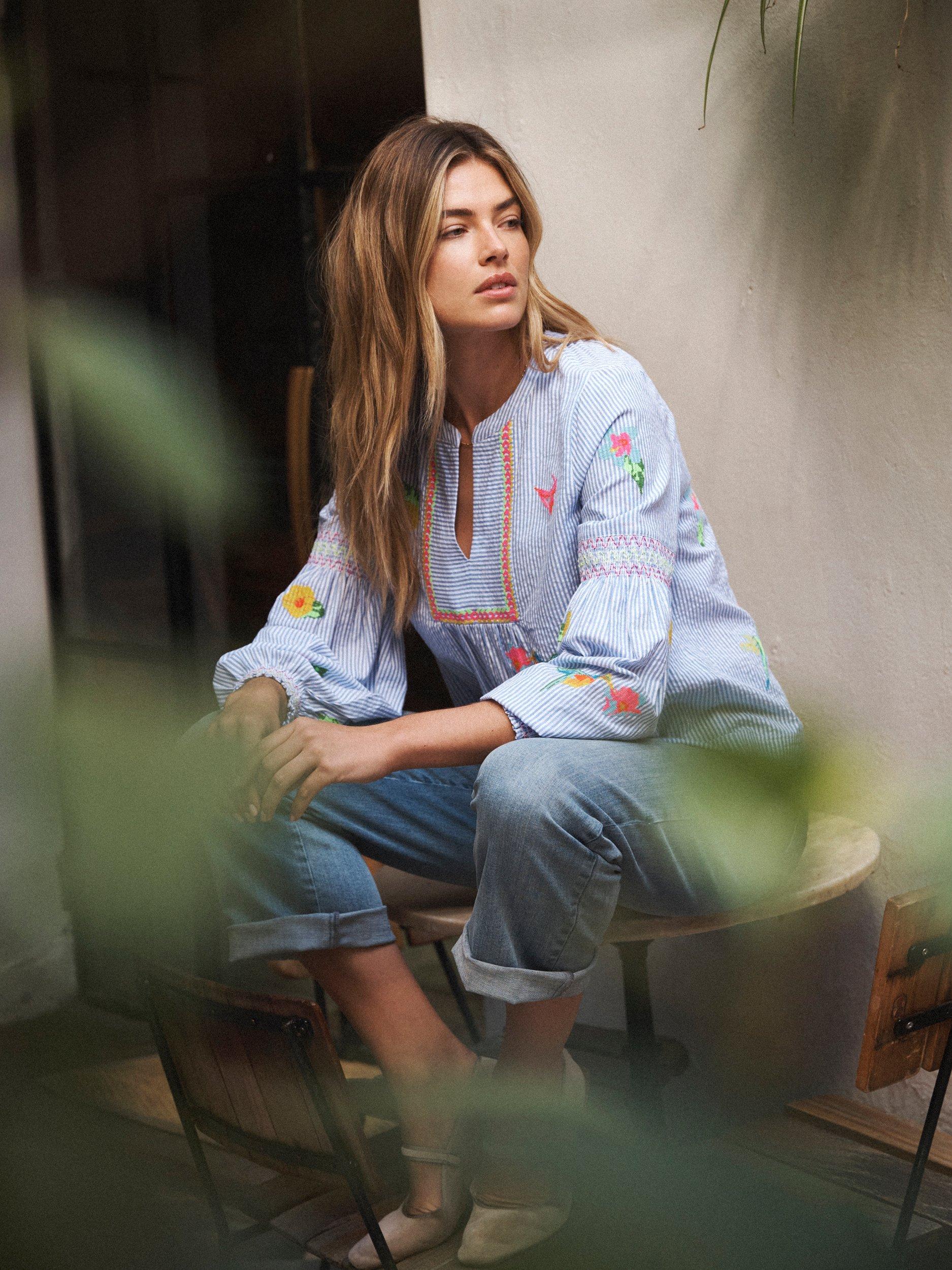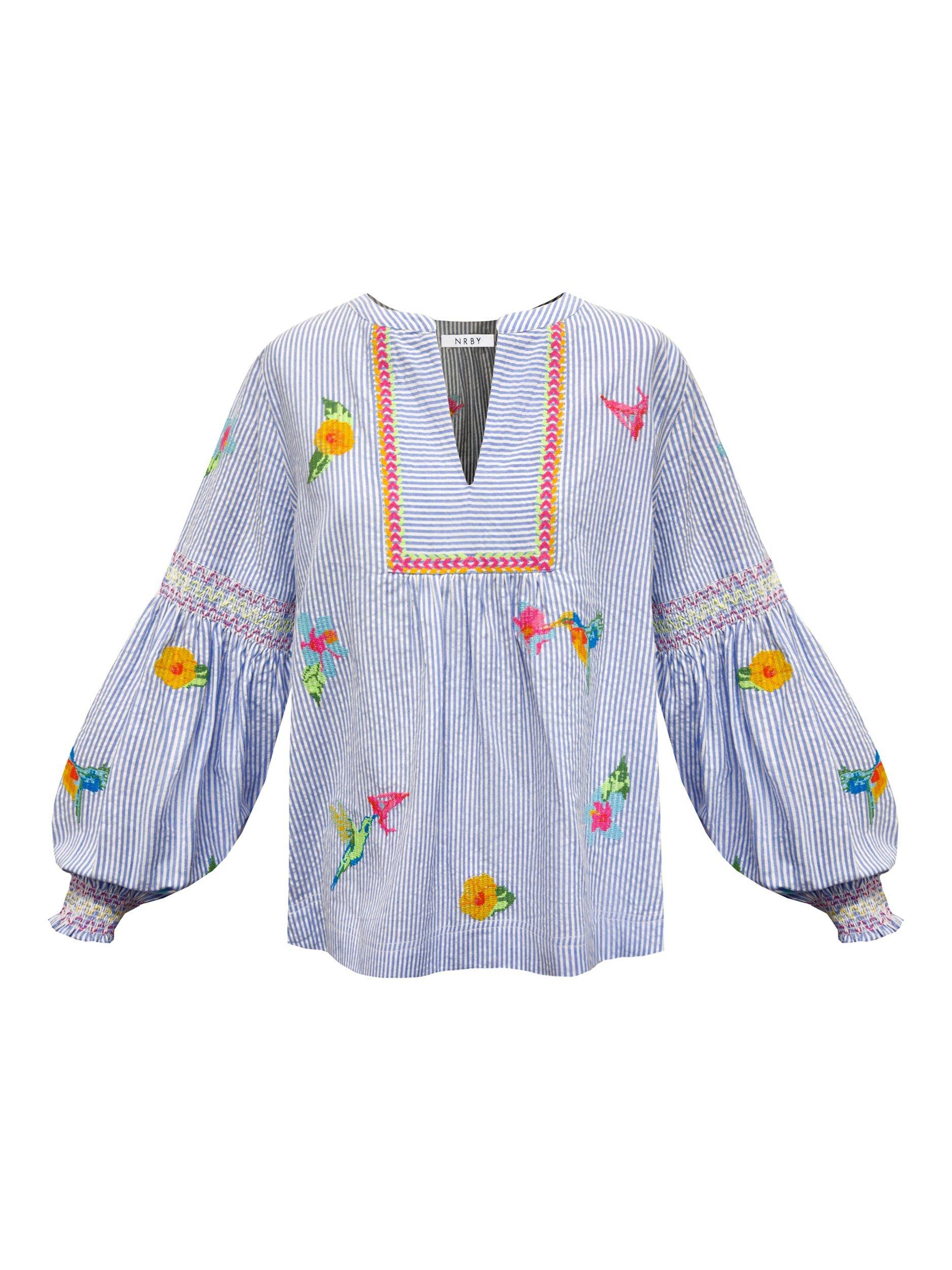 Crafted from cotton for a luxuriously comfortable feel, this shirt features detailed embroidery and a flattering neckline for a chic and stylish look. Lantern sleeves, ruched elasticated cuffs and charming bird and floral motif embroidery make this a perfect shirt for all occasions!