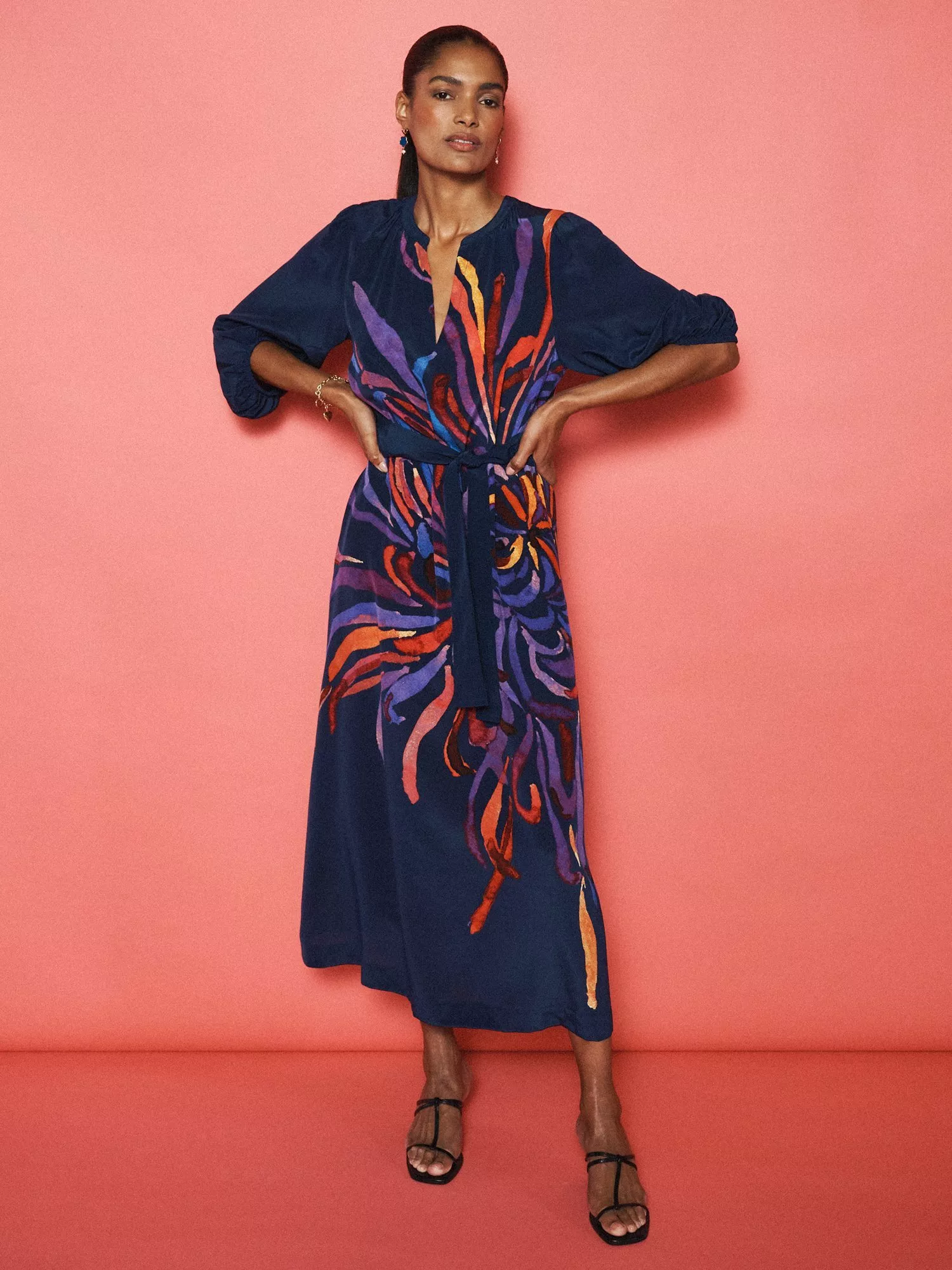 A new and exclusive firework placement print in a stunning silk silhouette. Where comfort meets chic, the Ines features an airy silhouette and a flattering v-neck and gathered elbow-length sleeves.