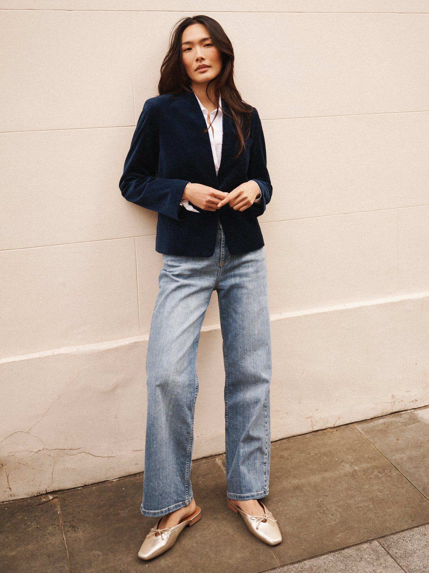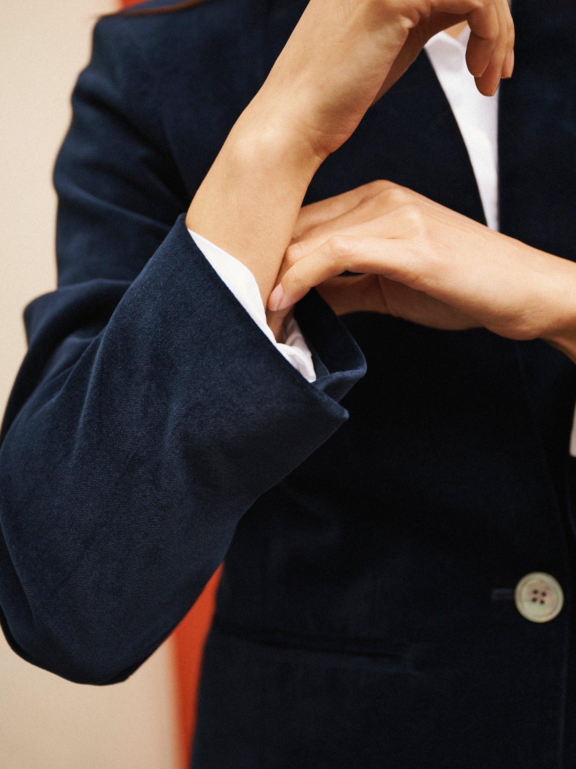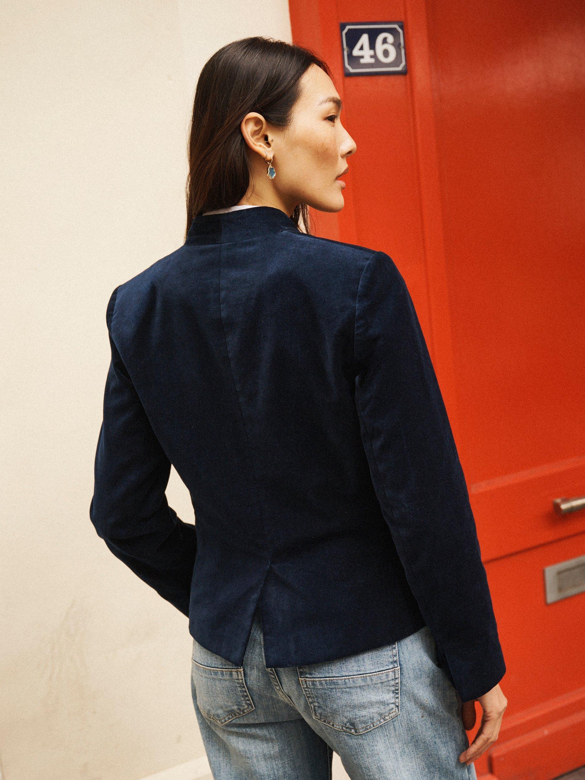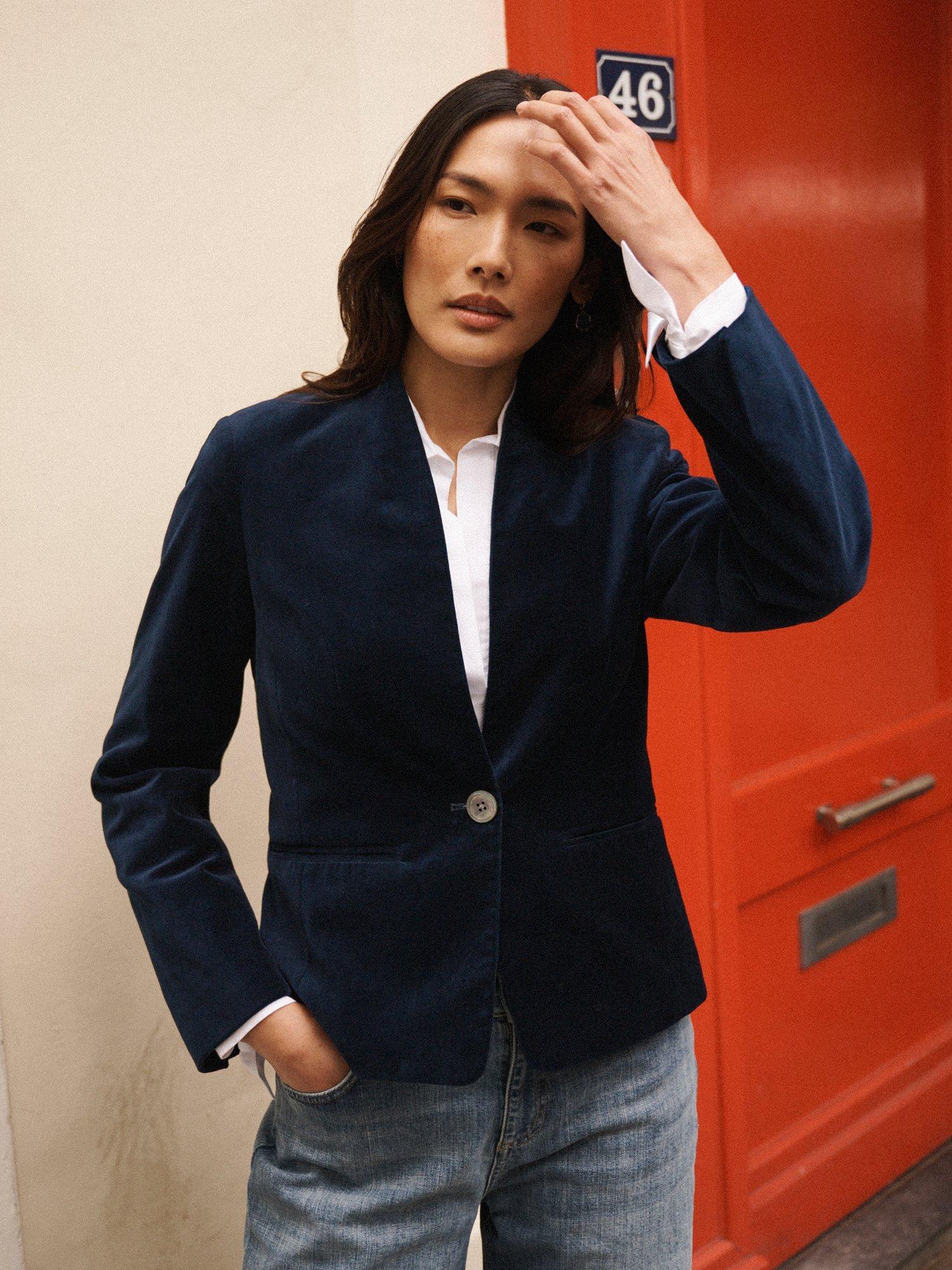 Crafted from luxurious cotton velvet, the Jay jacket features a collarless, fitted silhouette with clean, structured shoulders and elegant shell button fastenings. Its waist-length design is tailored to provide a polished, versatile piece that complements both casual and formal wardrobes for everyday sophistication.