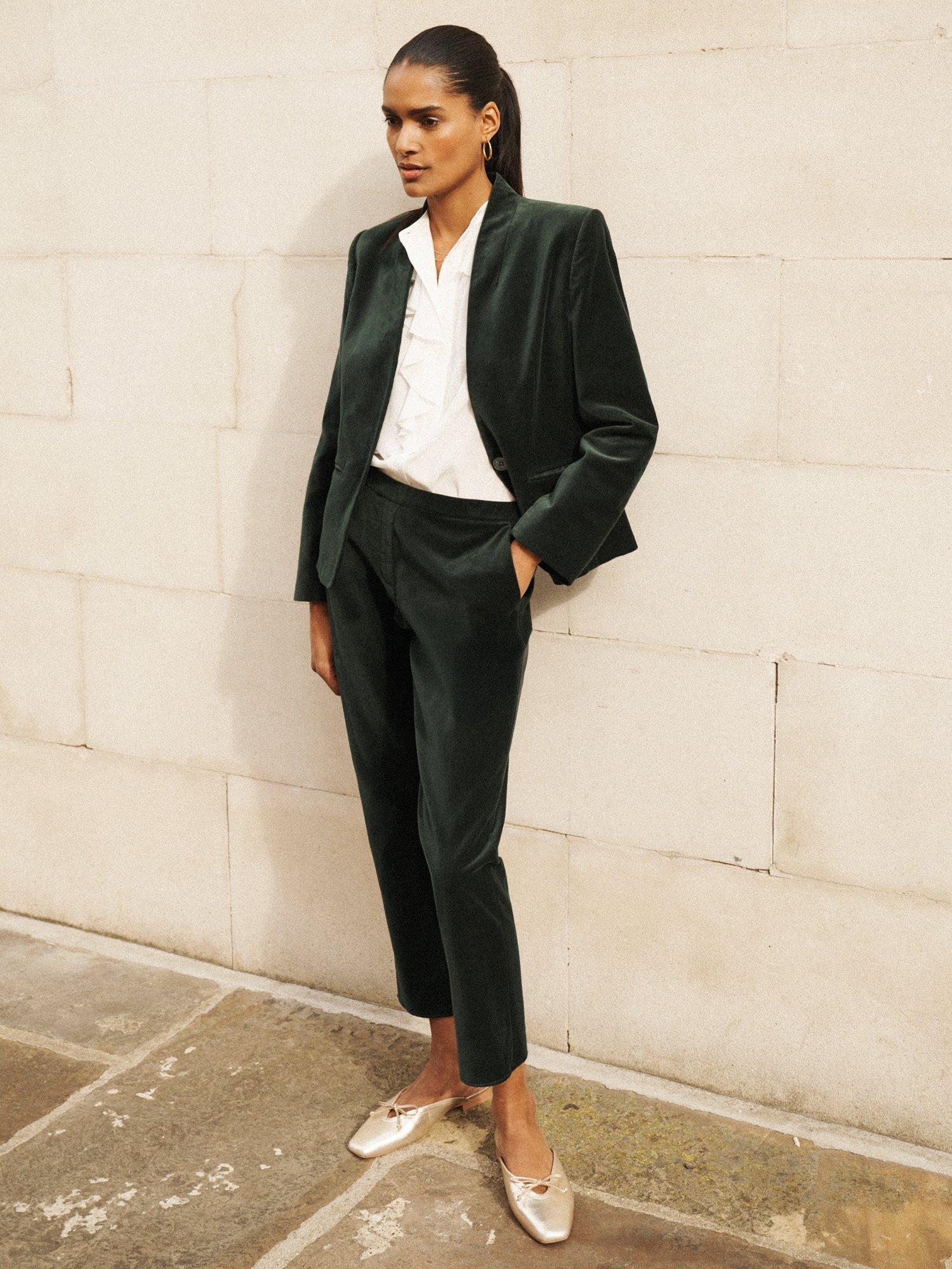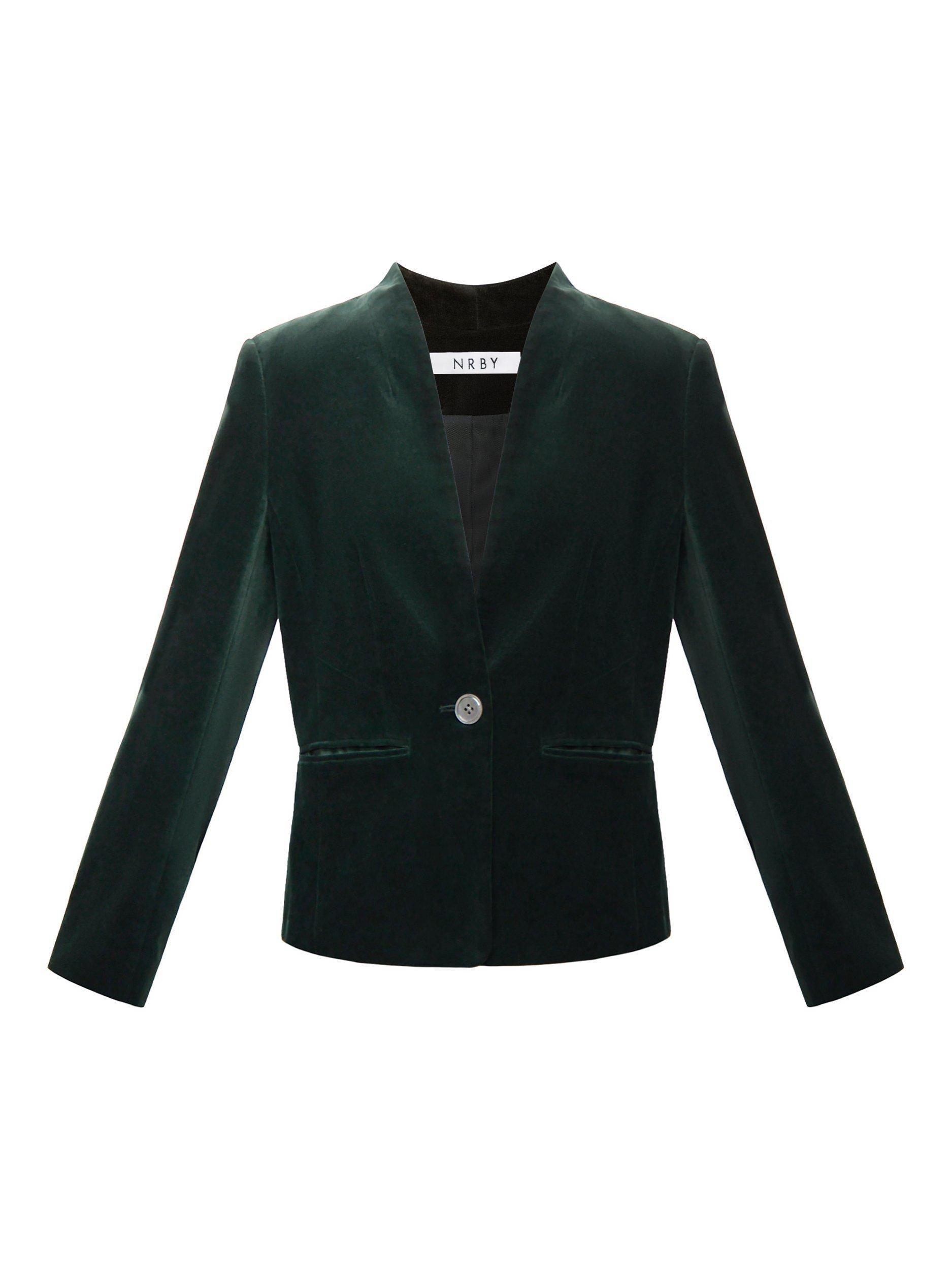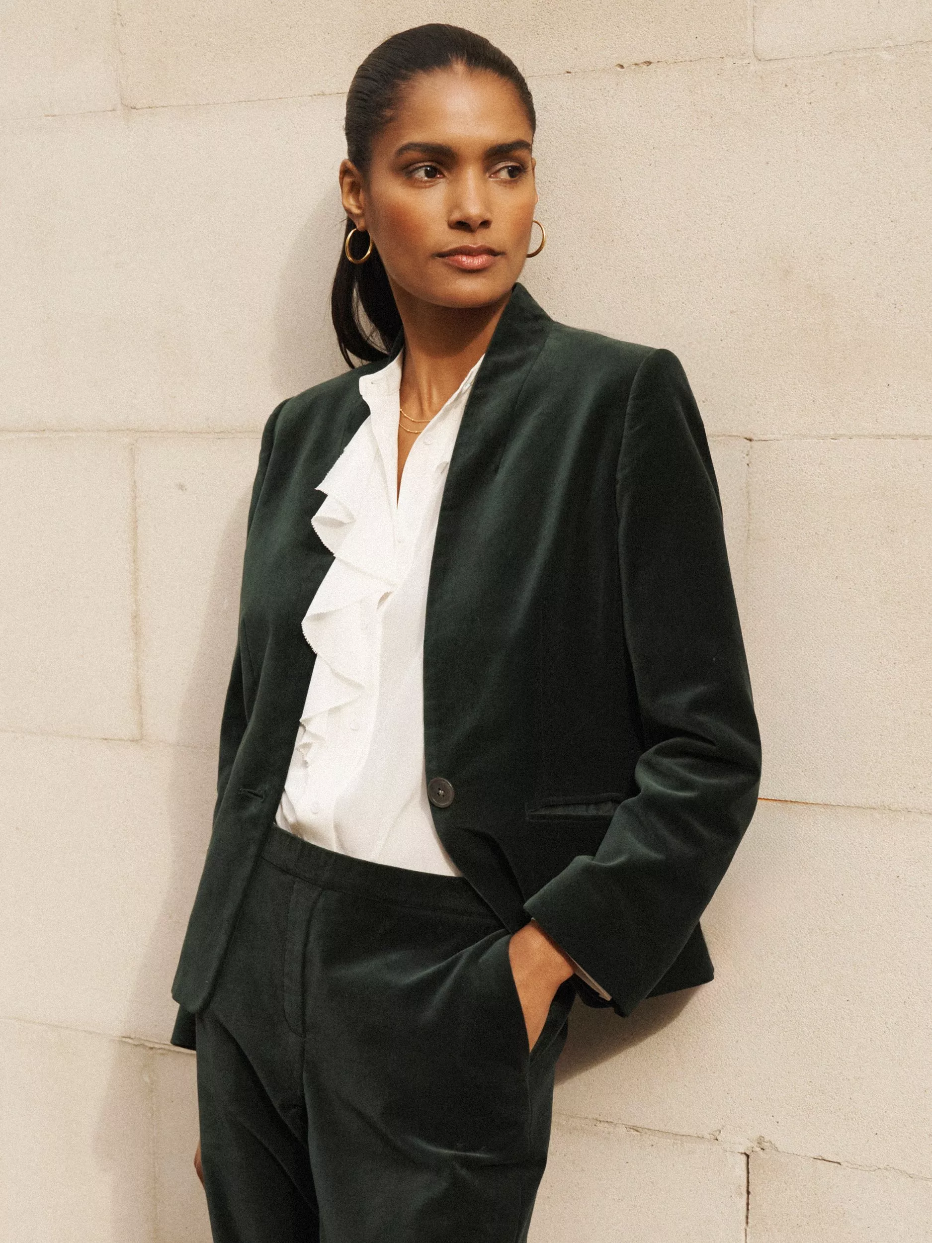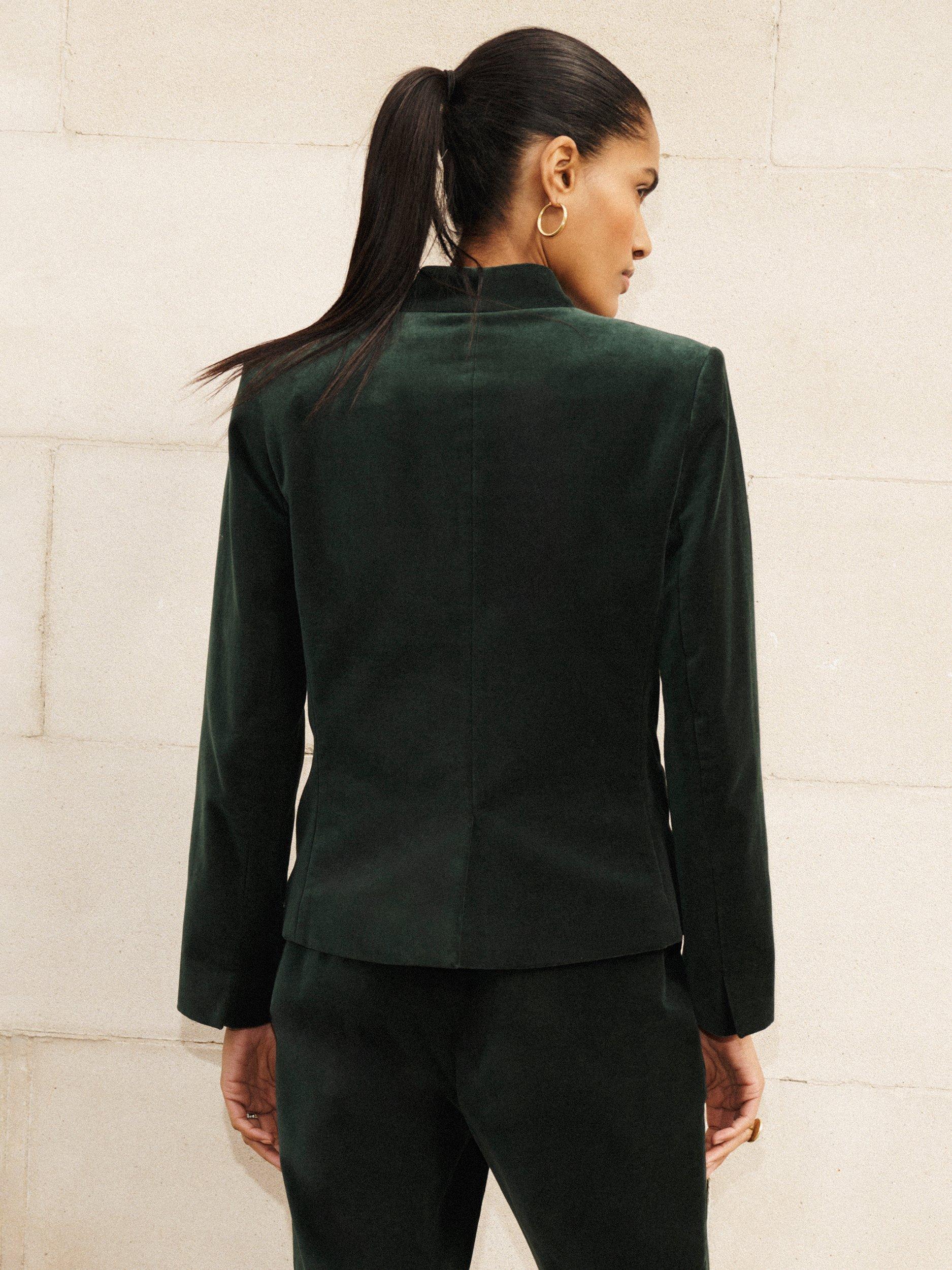 Crafted from luxurious cotton velvet, the Jay jacket features a collarless, fitted silhouette with clean, structured shoulders and elegant shell button fastenings. Its waist-length design is tailored to provide a polished, versatile piece that complements both casual and formal wardrobes for everyday sophistication.