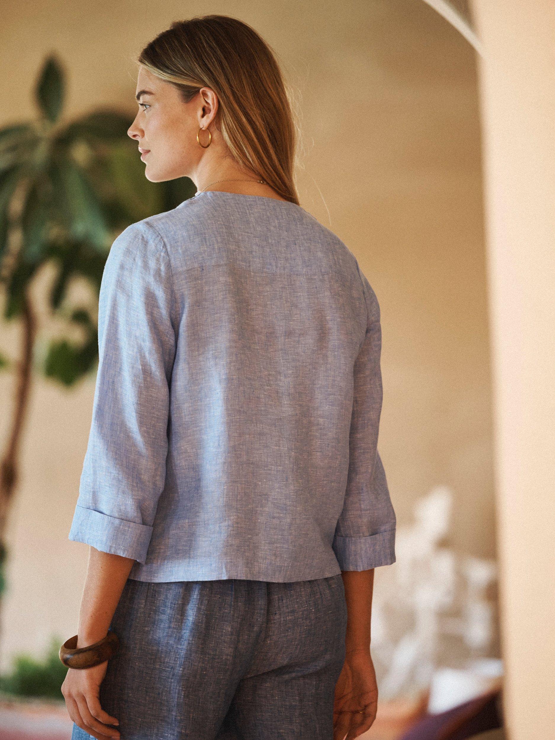 The Julie Top is a versatile staple, crafted from linen for a light, airy feel. Its ¾ length sleeves, crew neckline, and deep-faced cuffs and hem add a polished touch. Shoulder button details complete this straight-hem design, perfect for relaxed yet elevated dressing.