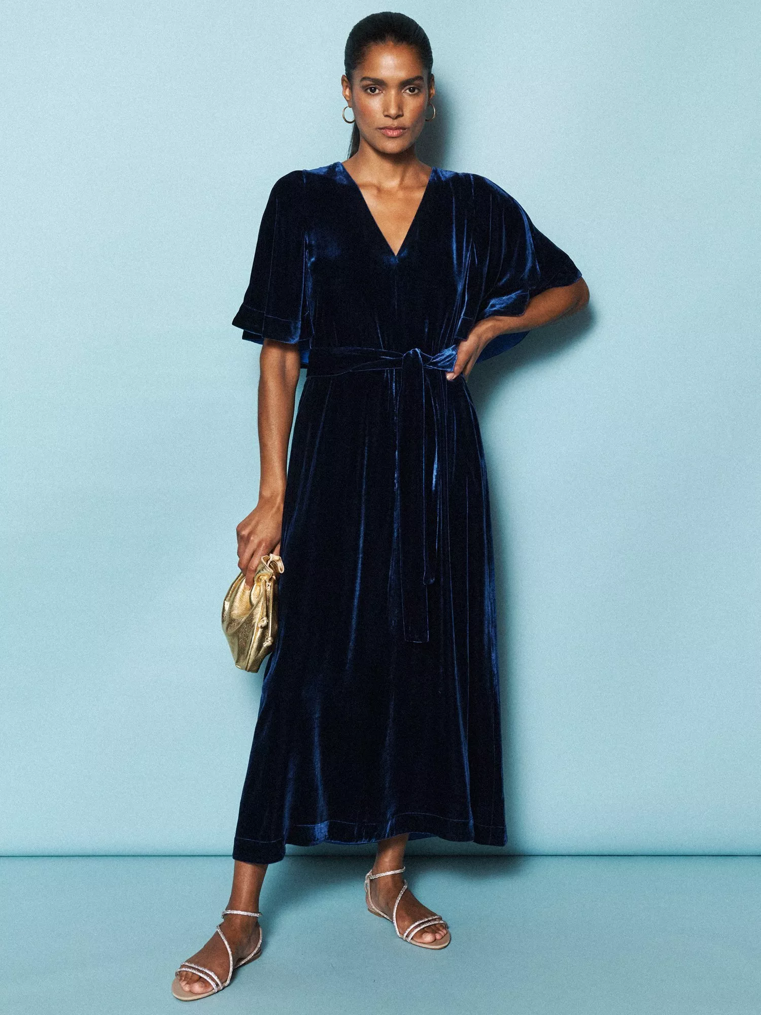 Kennedy offers a striking silhouette with its flowing cape, shoulder, and sleeve, in signature velvet. The flattering V-neckline enhances elegance, while the self-tie belt defines the waist, creating a dramatic yet refined look.