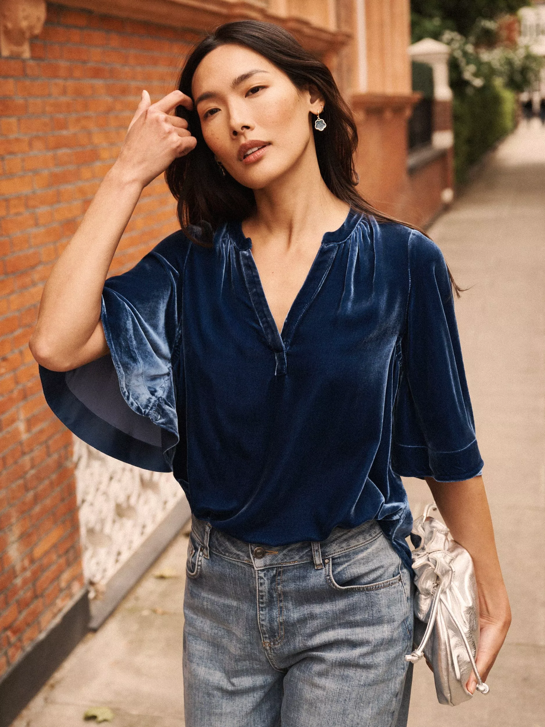 Crafted from rich velvet, this new silhouette features a flattering V-neckline, flowing cape-style sleeves, and a curved hem for an elegant drape. Effortlessly versatile, it pairs perfectly with jeans for dressed-up everyday style.