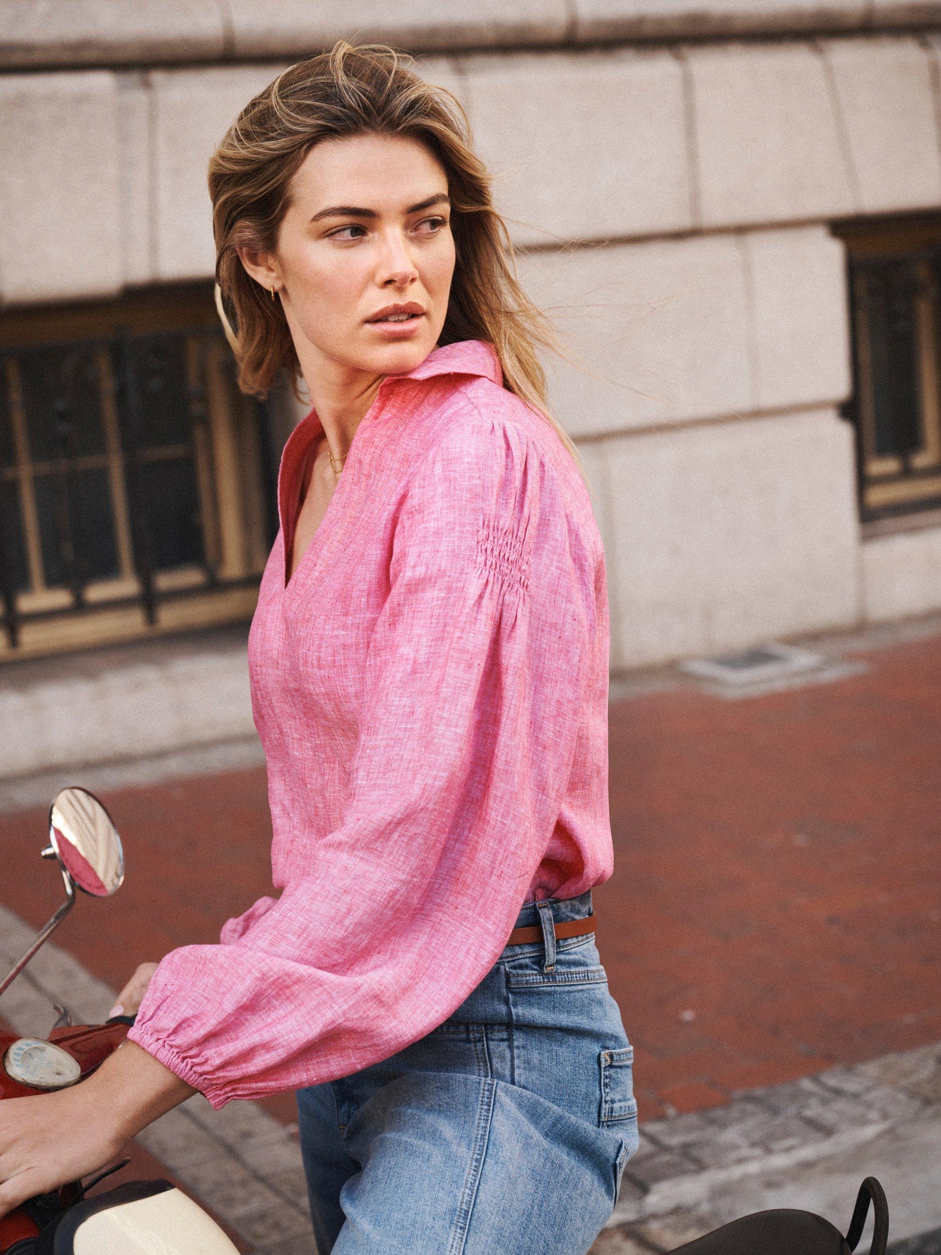 Say hello to Mara, a fresh shirt crafted in lightweight linen. Designed with a classic collar and soft V-neckline, she features full-length sleeves with elasticated cuffs and shirring detail on the sleeve. Gentle gathers at the back add ease and movement.