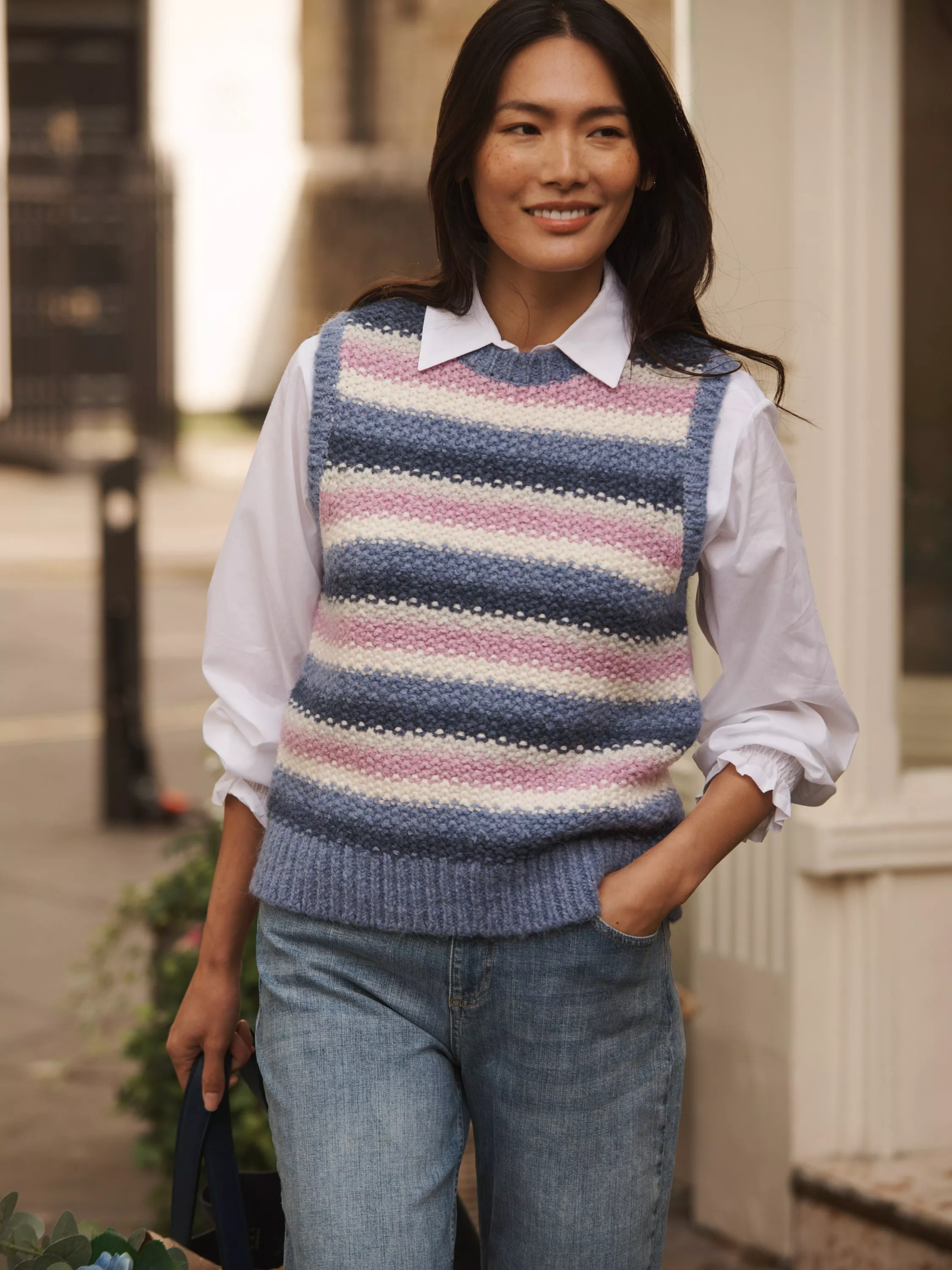 Crafted from a soft knit blend, this tank features a moss stitch, giving it a charming hand-knit feel. Perfect for layering, pair it with a classic shirt and jeans for a stylish autumn look.