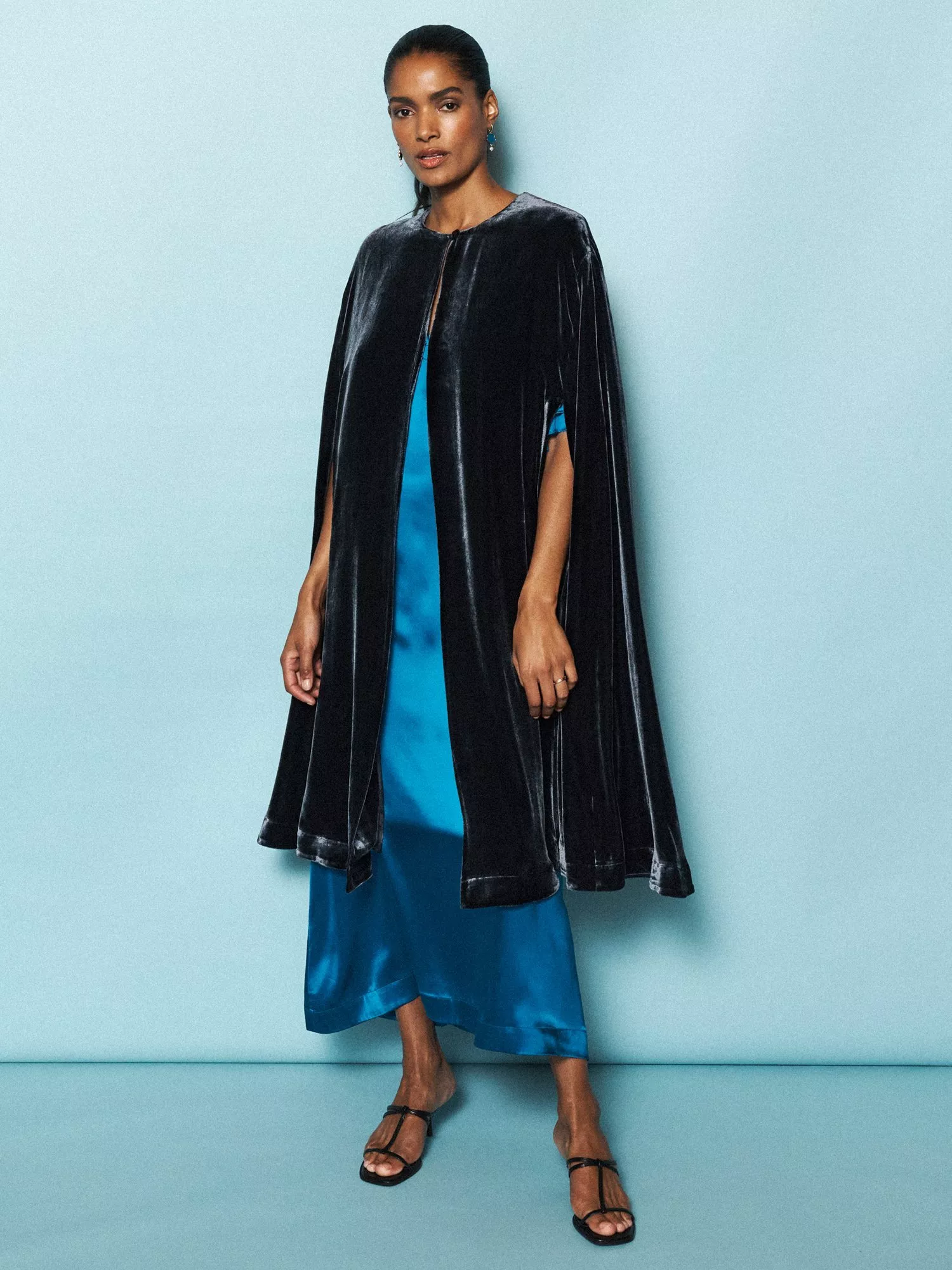 Make an entrance in the Marion Cape. A statement layer crafted in lustrous silk velvet, this evening piece adds instant drama to every look. Cut to a sweeping silhouette with a simple button loop fastening, it slips effortlessly over dresses or tailoring, elevating your evening attire in an instant.