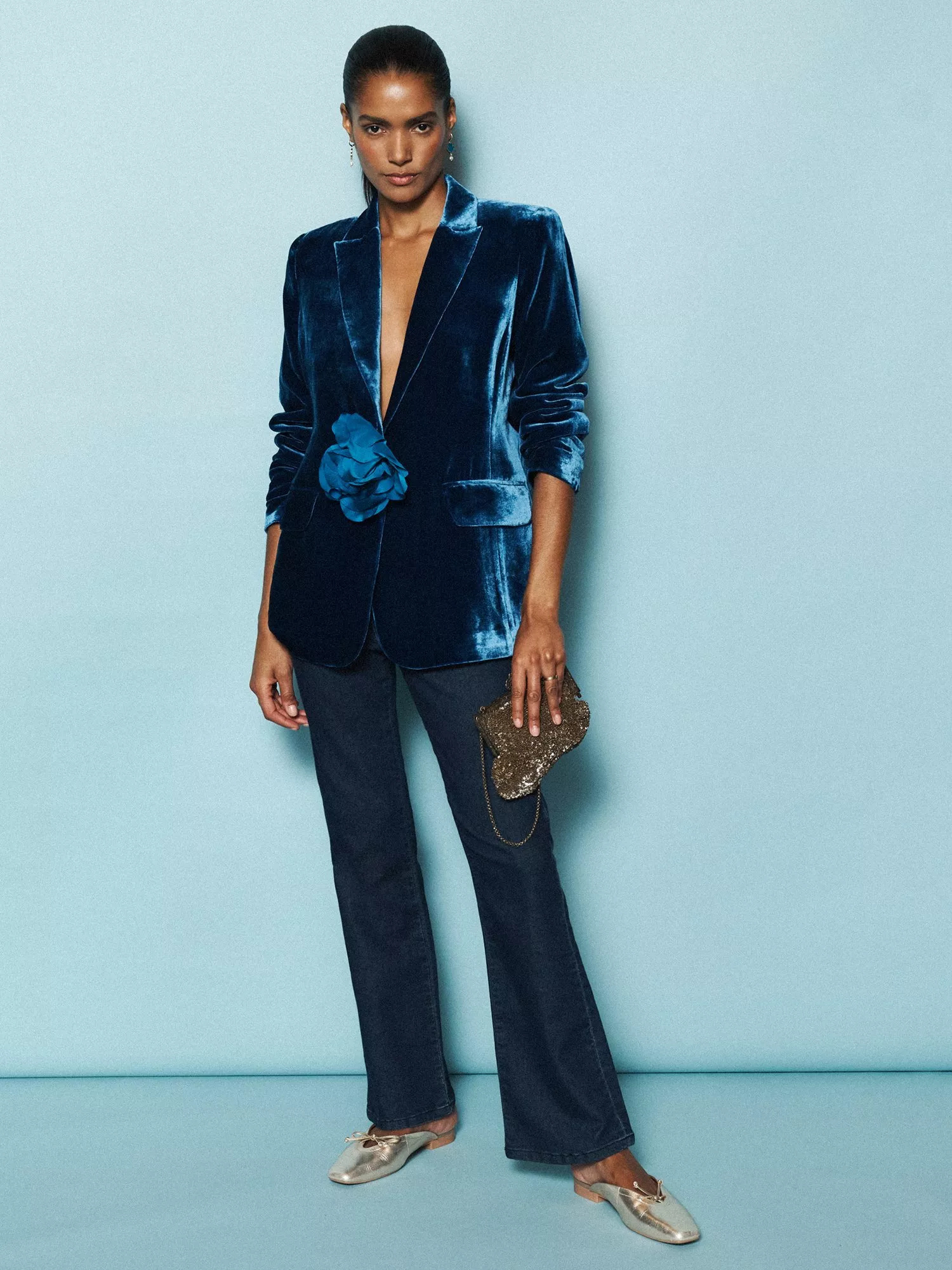 In sumptuous velvet mix, May is cut to a relaxed-fit silhouette with peak lapels and a single-breasted front that opens to a satin-lined interior.