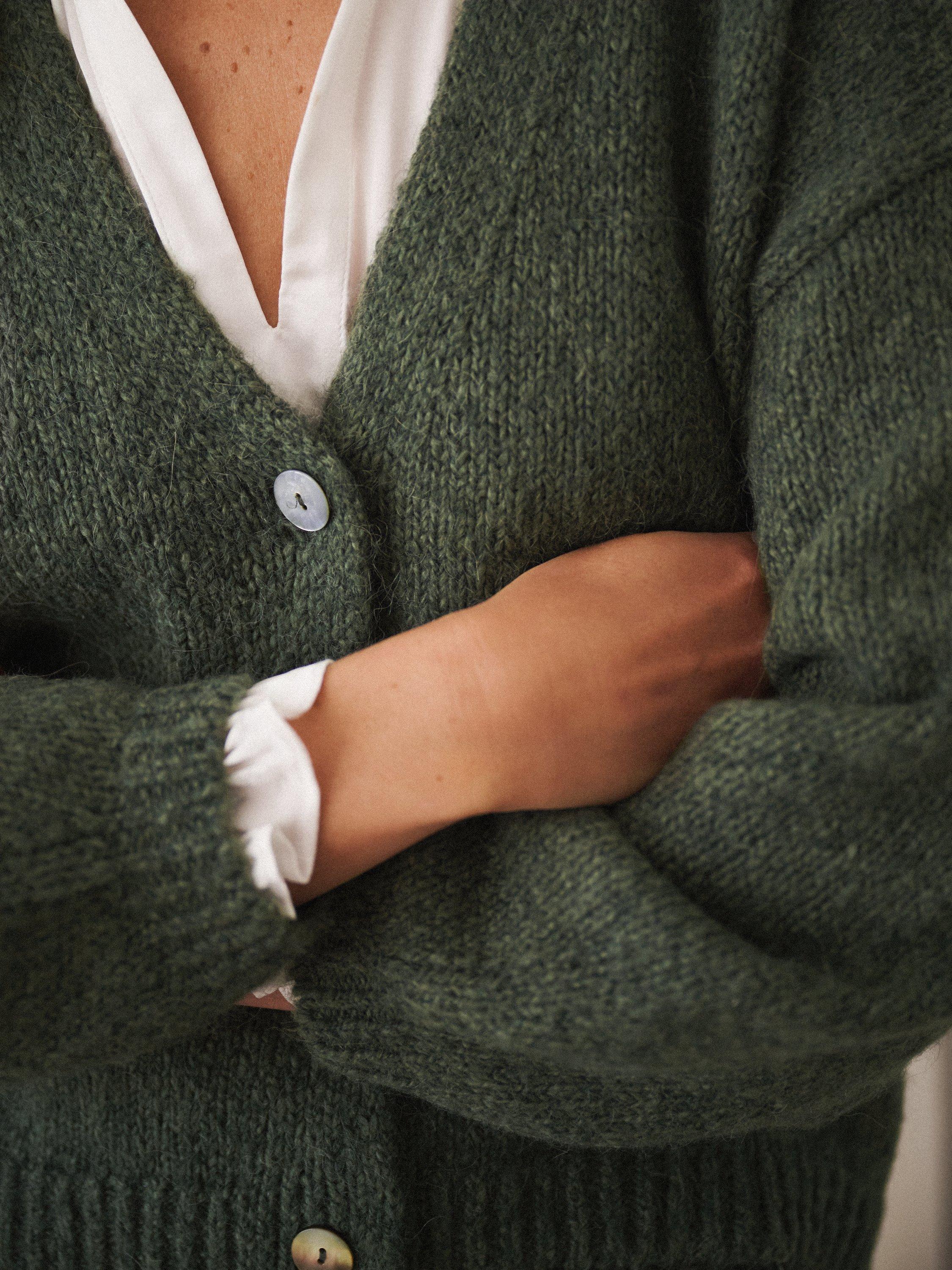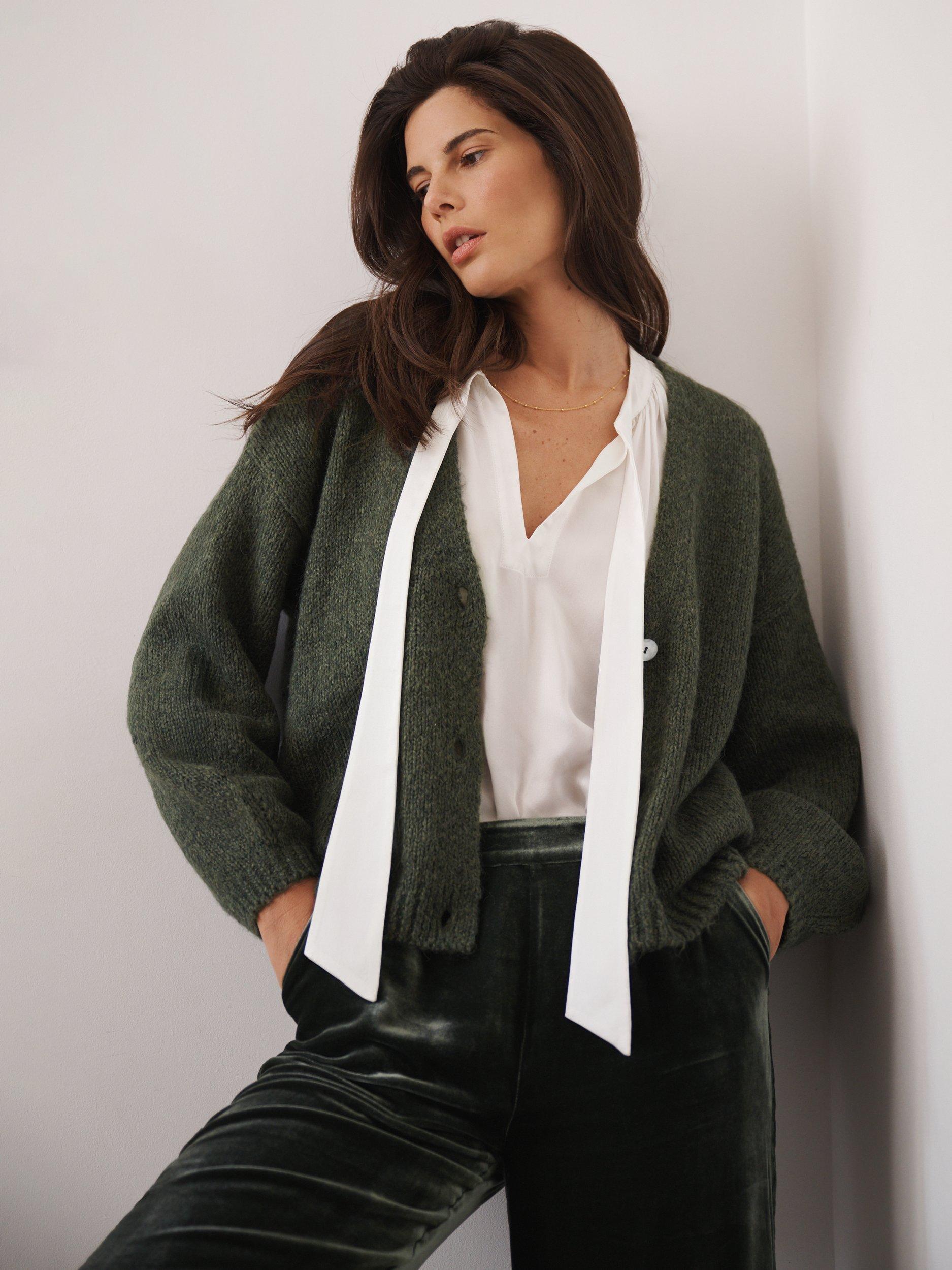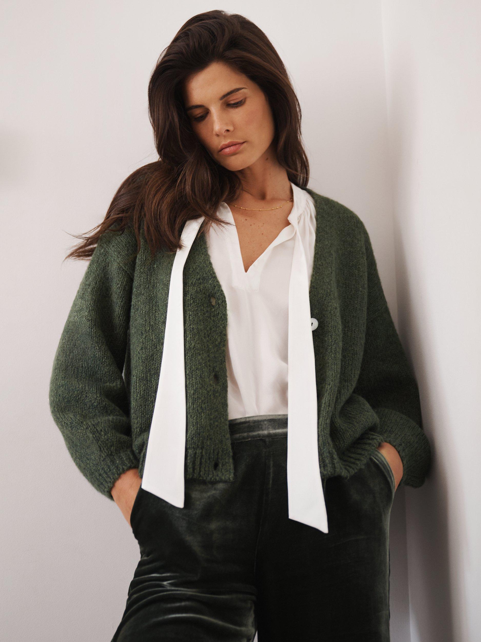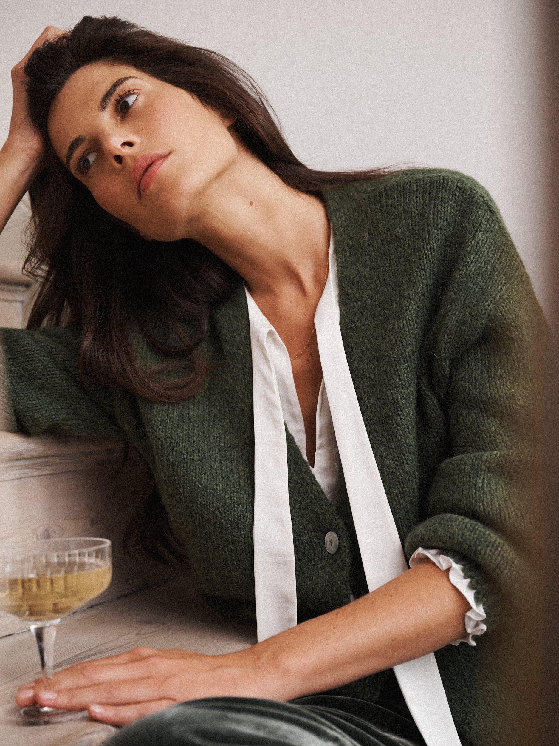 With its soft hand-knit feel and cosy knit blend, this cardigan is made for wrapping up in style. Featuring gently ballooned sleeves, ribbed trims, and delicate shell buttons, it’s comfort and charm in one. Wear it layered over your favourite silk pieces, or simply throw on with jeans for everyday ease.