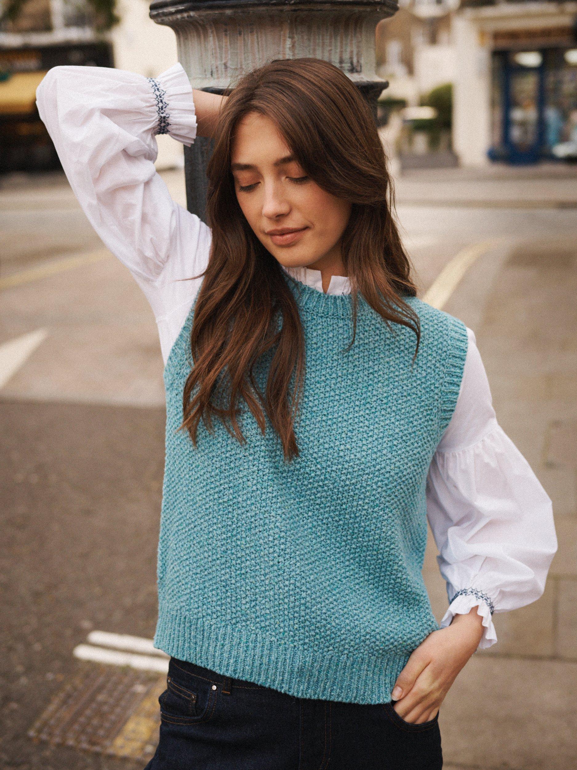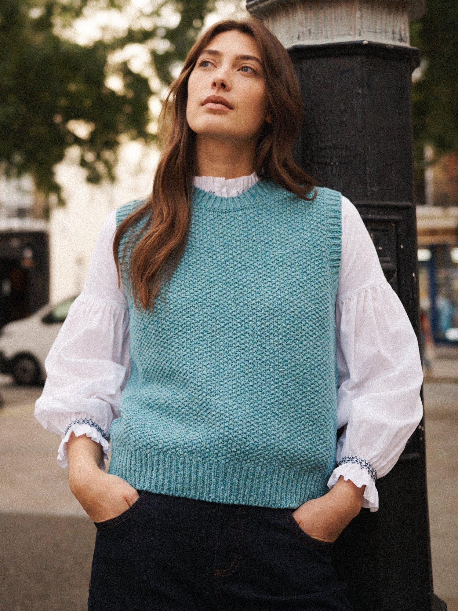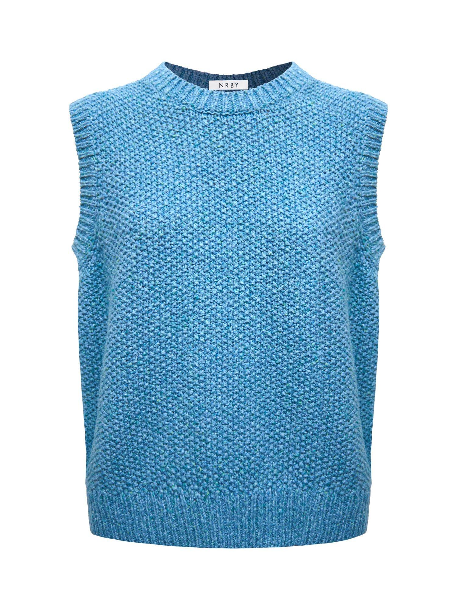 Introducing Morgan. Your new spring favourite. This tank showcases a new moss stitched knit, giving it a charming hand-knit feel. Crafted from a soft cotton, linen and silk noil blend, its chunky knit detailing, ribbed neckline, cuffs, and hem add a cosy feel. Perfect for layering, pair it with a classic NRBY shirt and jeans for a stylish Spring look.