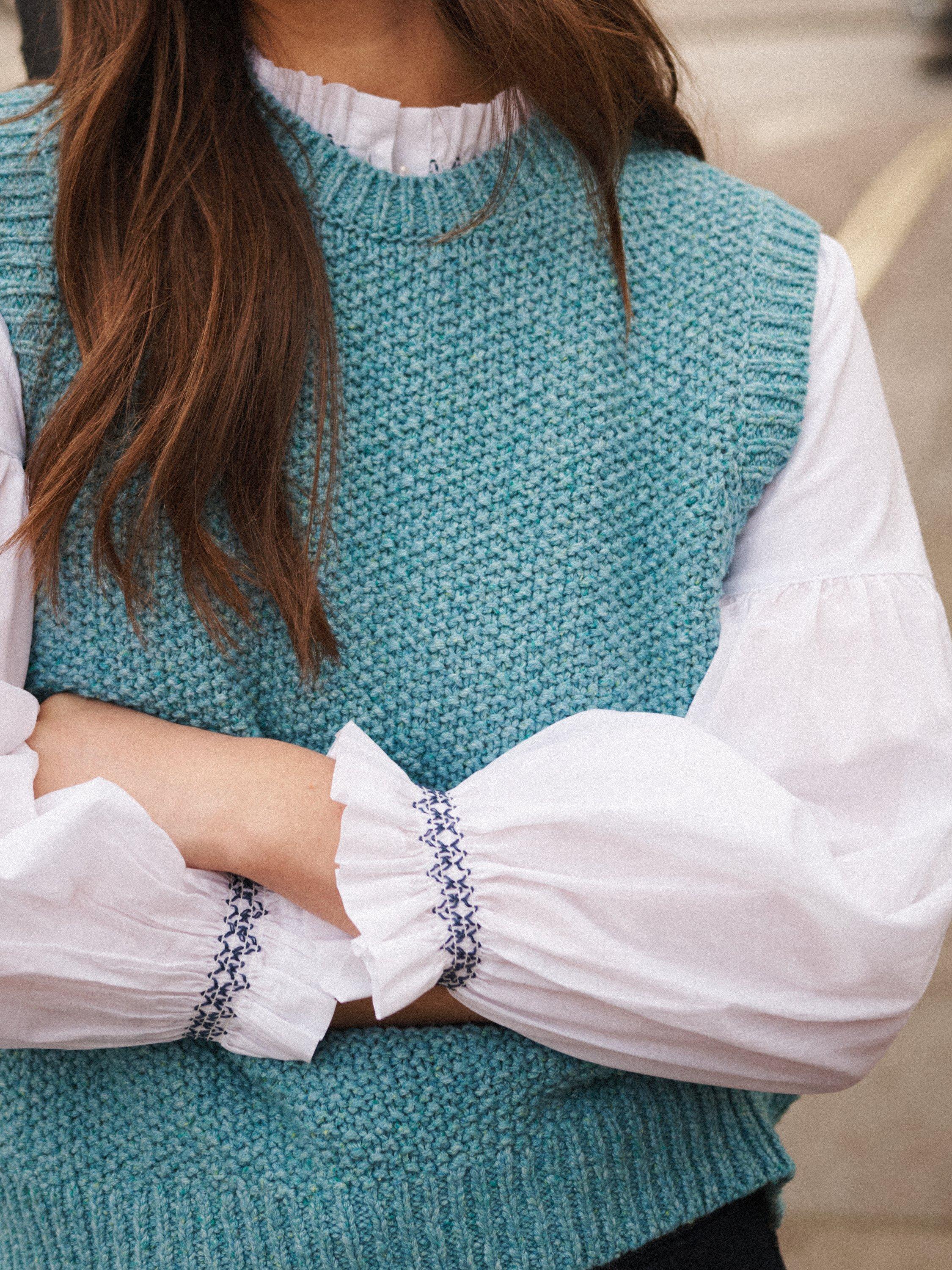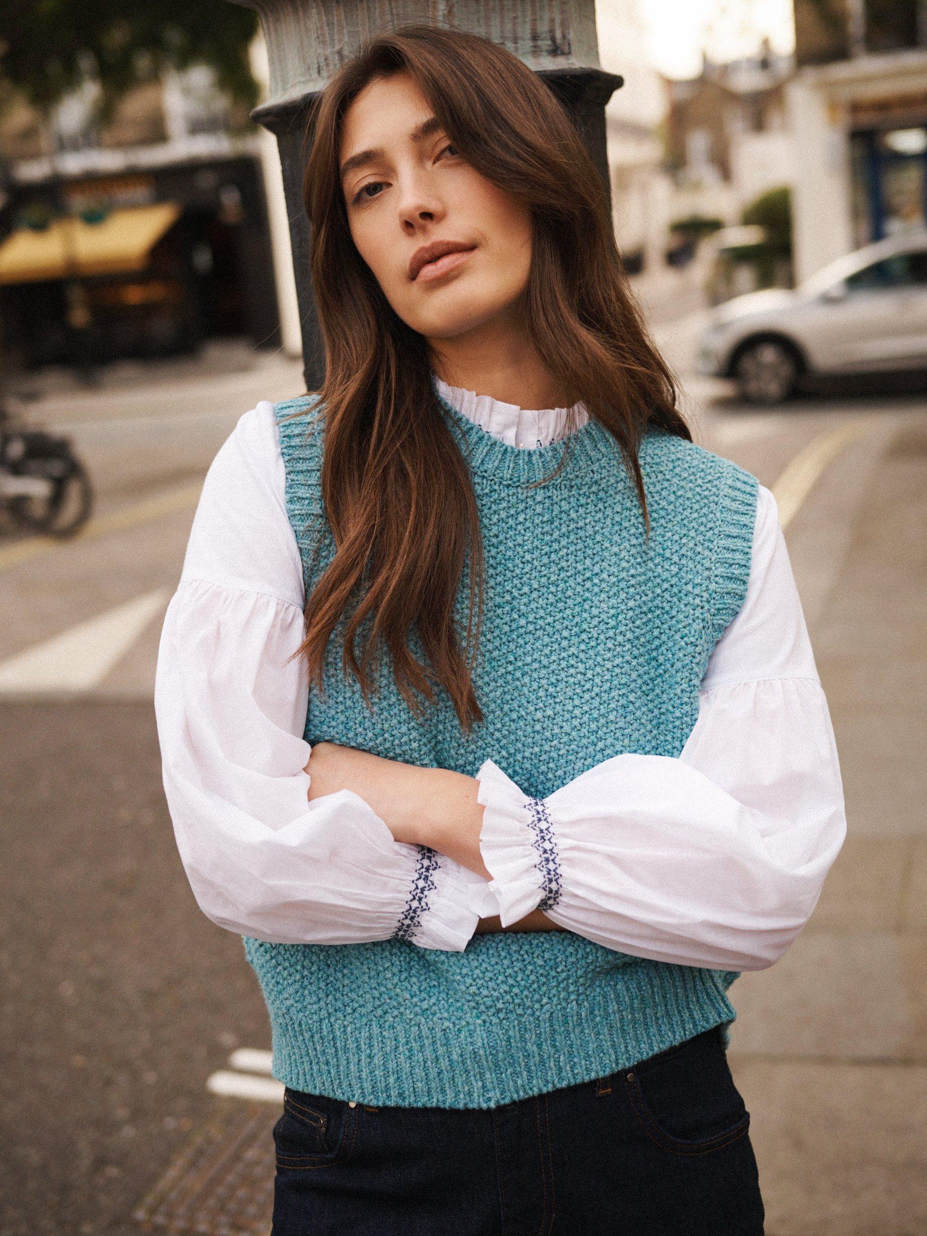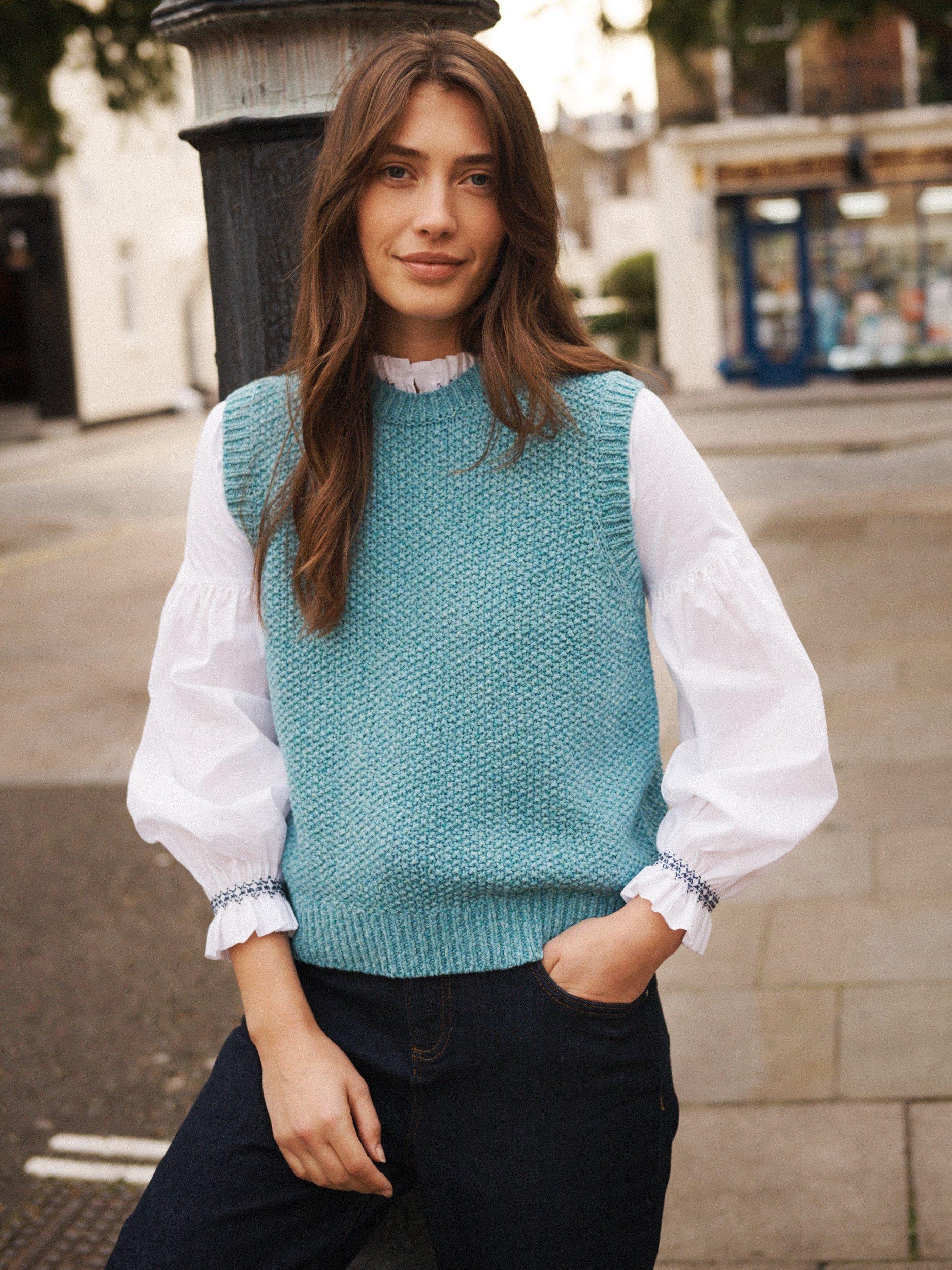Introducing Morgan. Your new spring favourite. This tank showcases a new moss stitched knit, giving it a charming hand-knit feel. Crafted from a soft cotton, linen and silk noil blend, its chunky knit detailing, ribbed neckline, cuffs, and hem add a cosy feel. Perfect for layering, pair it with a classic NRBY shirt and jeans for a stylish Spring look.