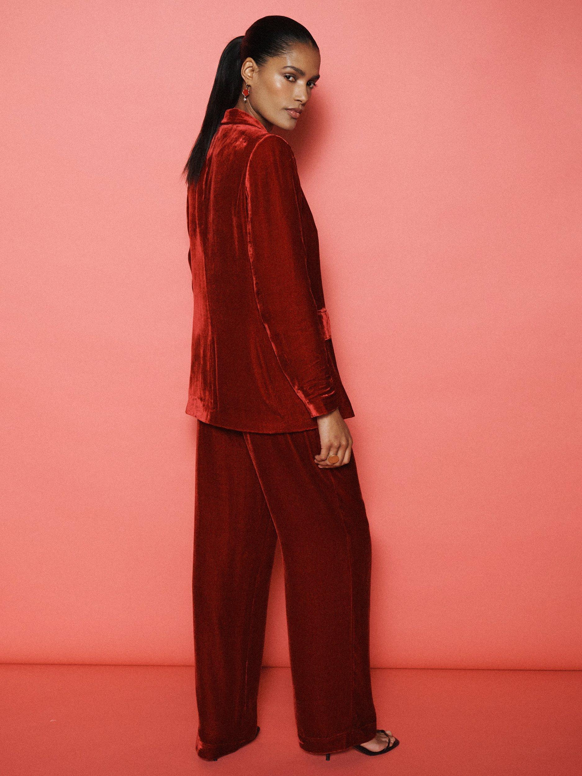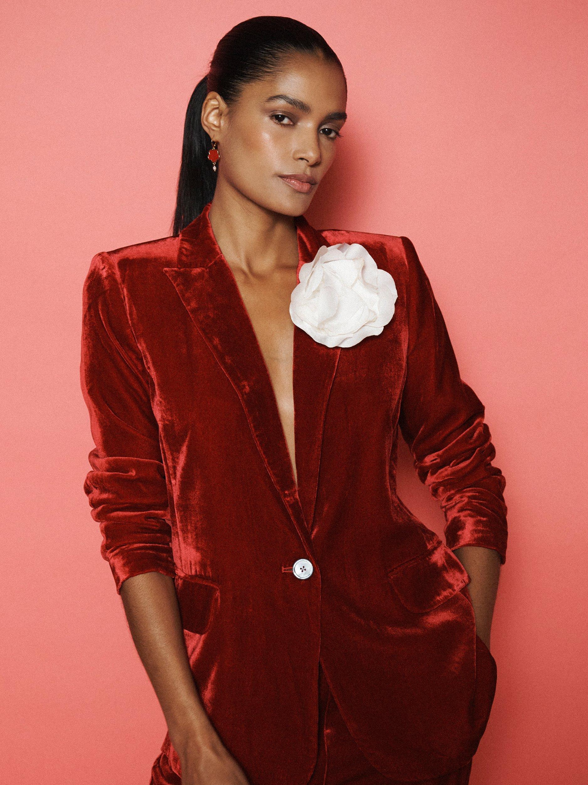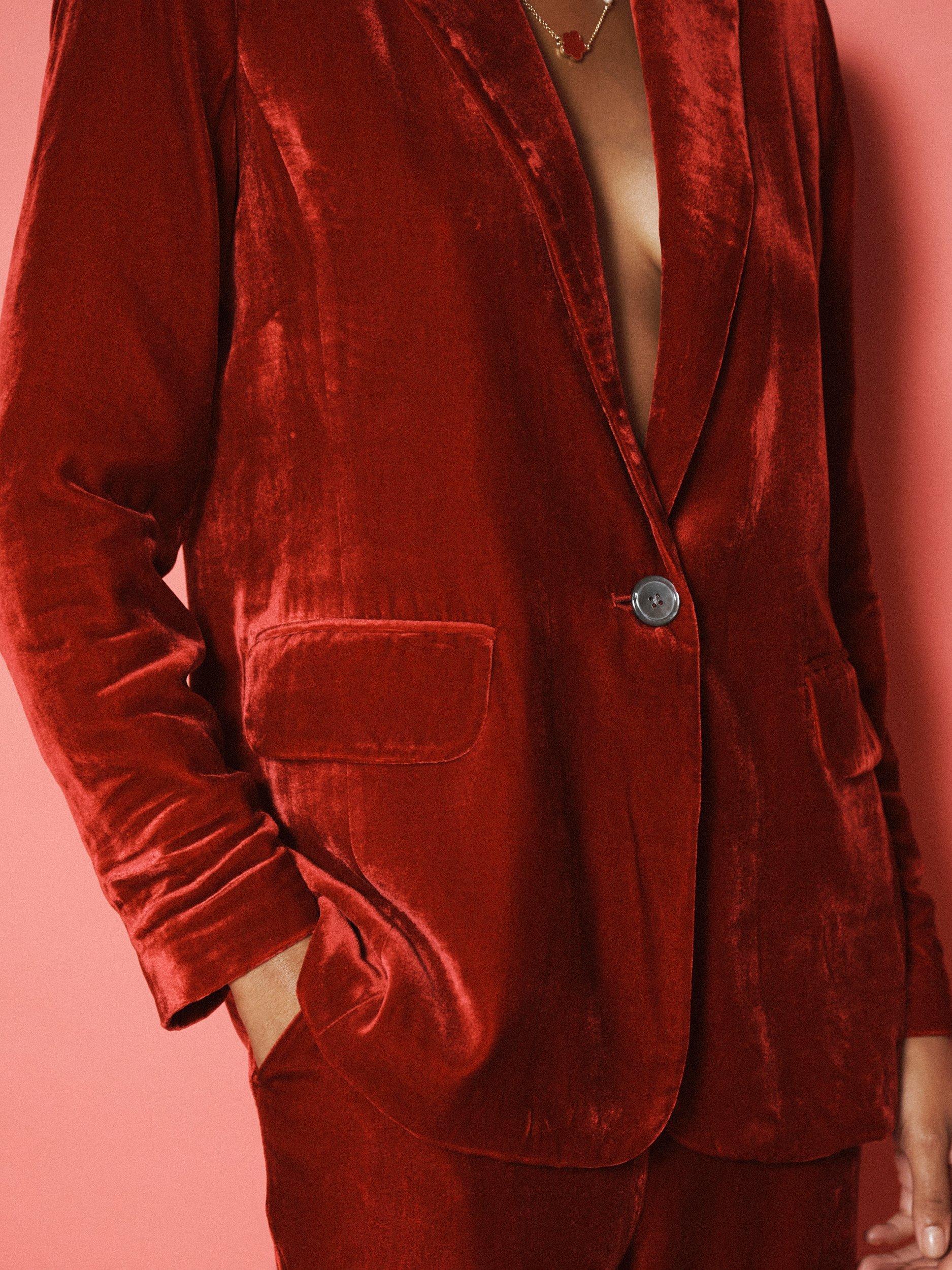 Say hello to the May velvet blazer. In a sumptuous silk-velvet mix, May is cut to a relaxed-fit silhouette with peak lapels and a single-breasted front that opens to a satin-lined interior.