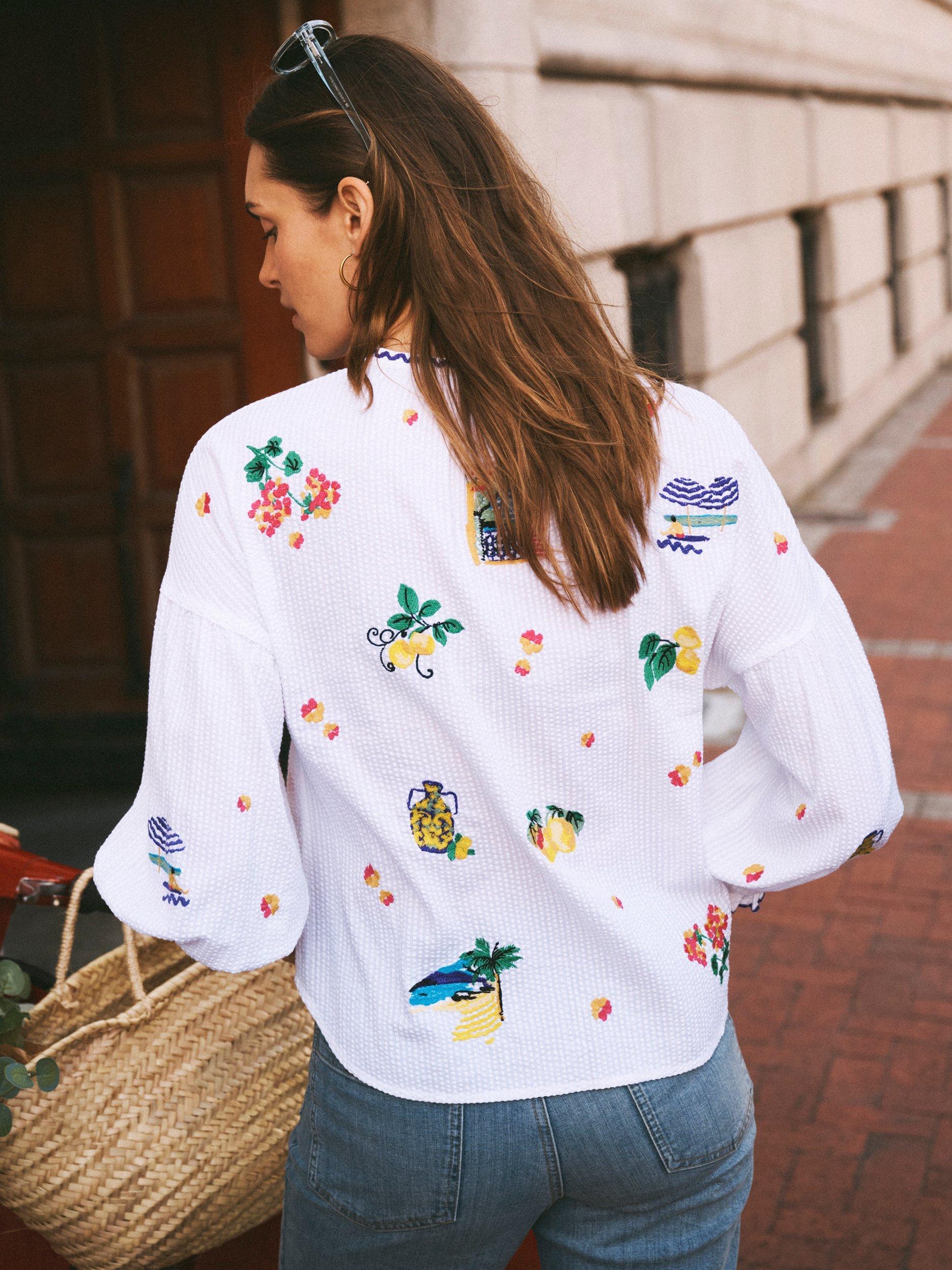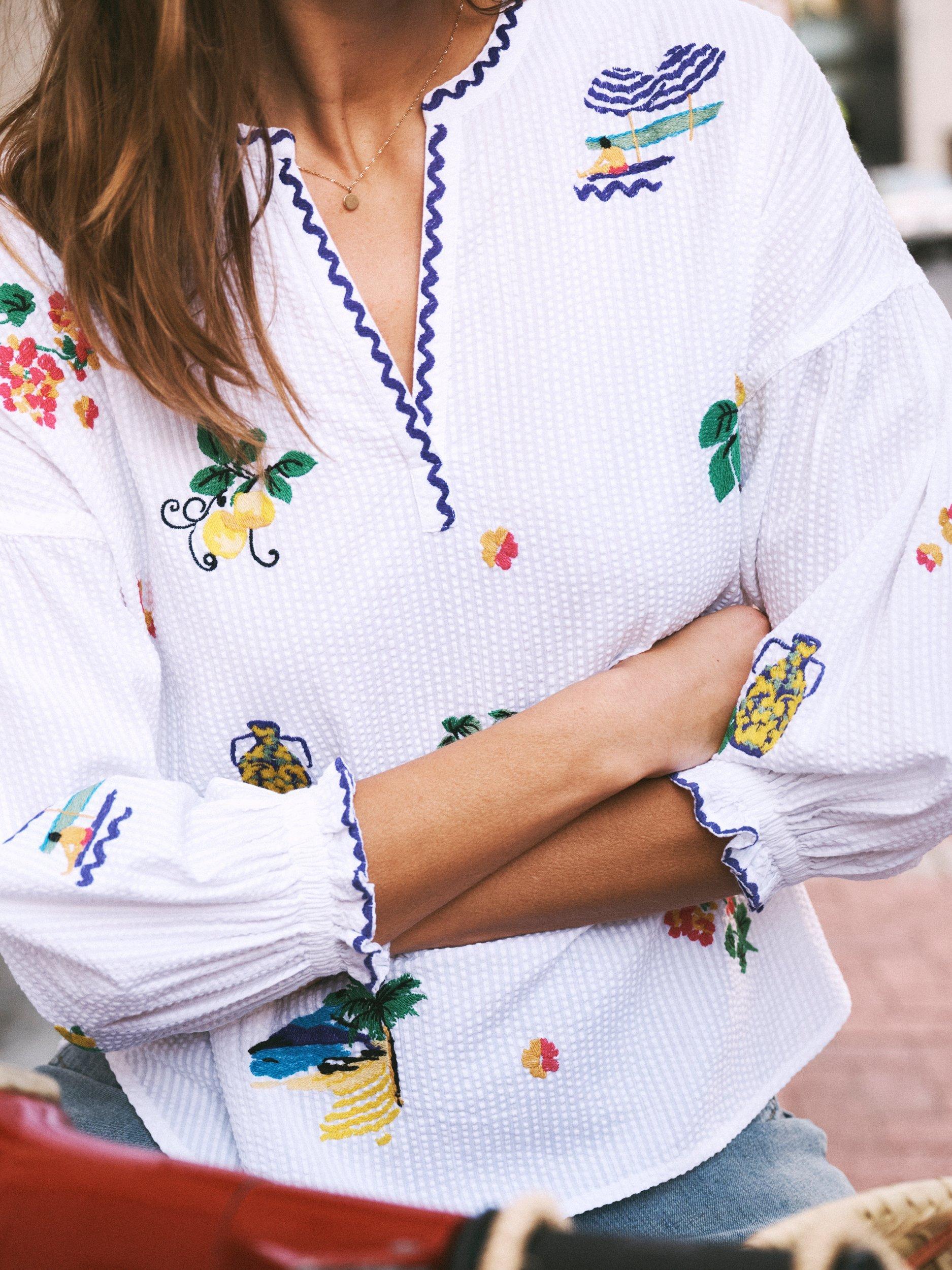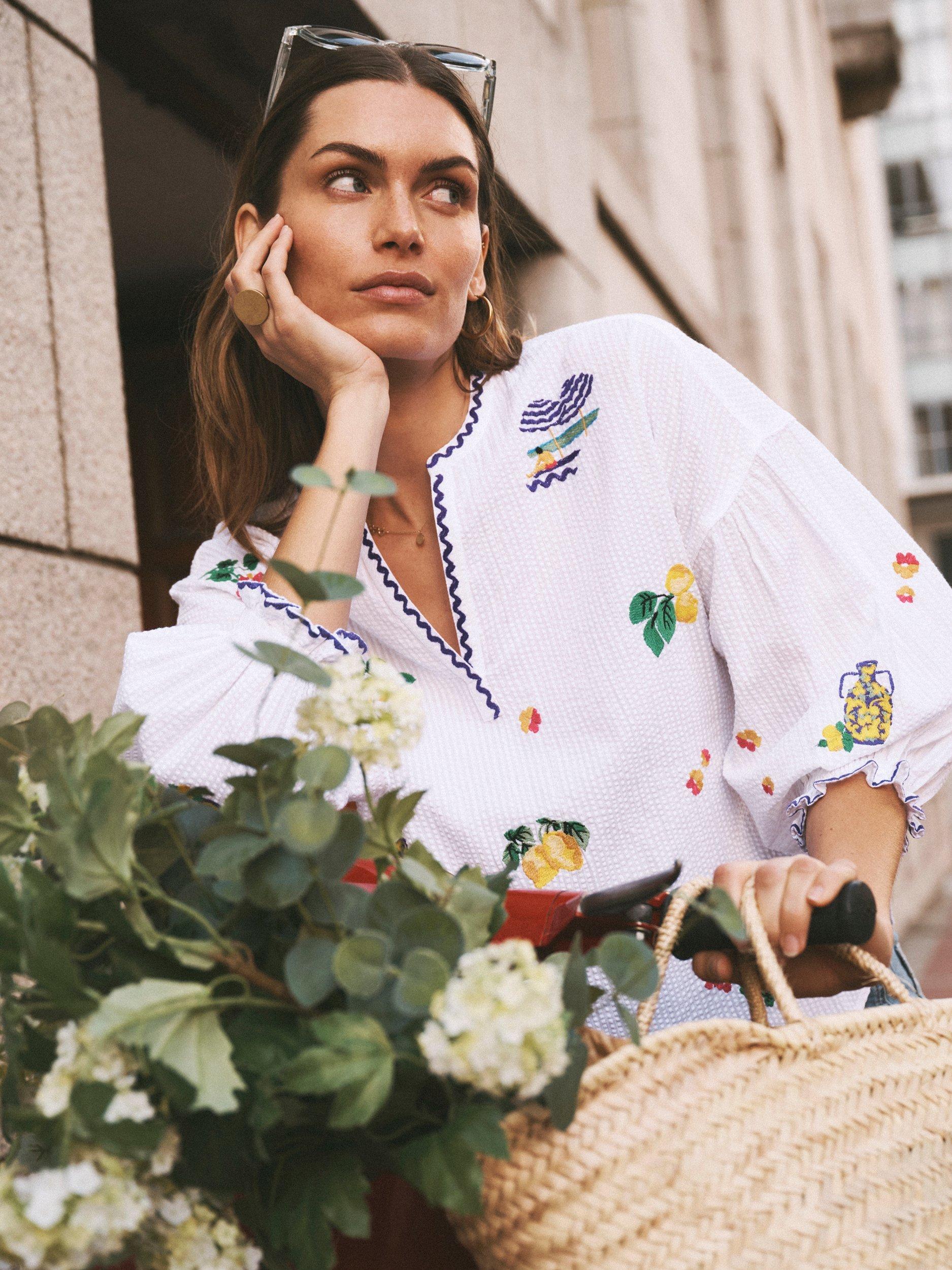 Crafted from 100% cotton for a luxuriously comfortable feel, this embroidered shirt features detailed hand and machine embroidery and a flattering neckline for a chic and stylish look. Lantern sleeves, ruched elasticated cuffs and charming fruit and floral motif embroidery makes this a perfect piece for all occasions.