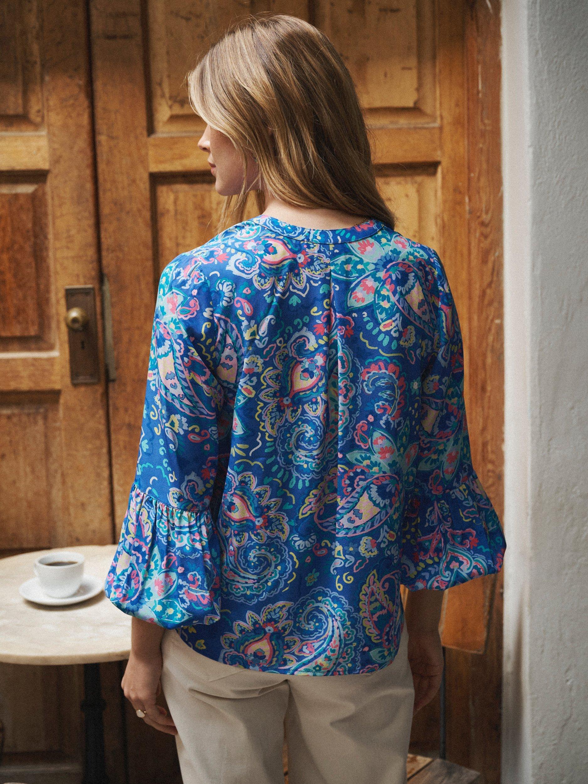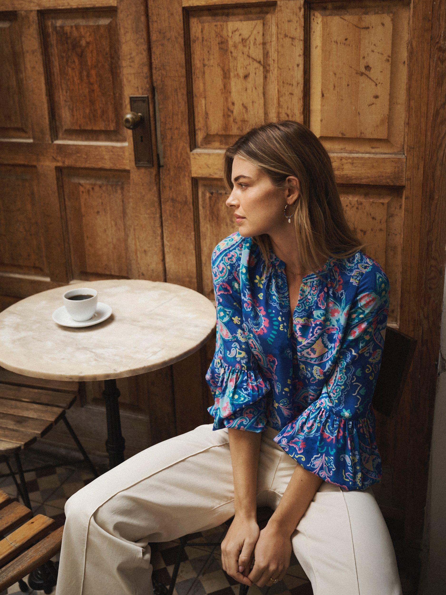 Meet Oleta, a statement shirt in NRBY's exclusive painterly paisley print. Crafted from 100% silk, Oleta features a relaxed silhouette with elegant balloon sleeves, gathered cuffs, and a flattering V-neckline. The curved hem adds ease and flow, while the orchid placement print brings a pop of colour to your everyday.