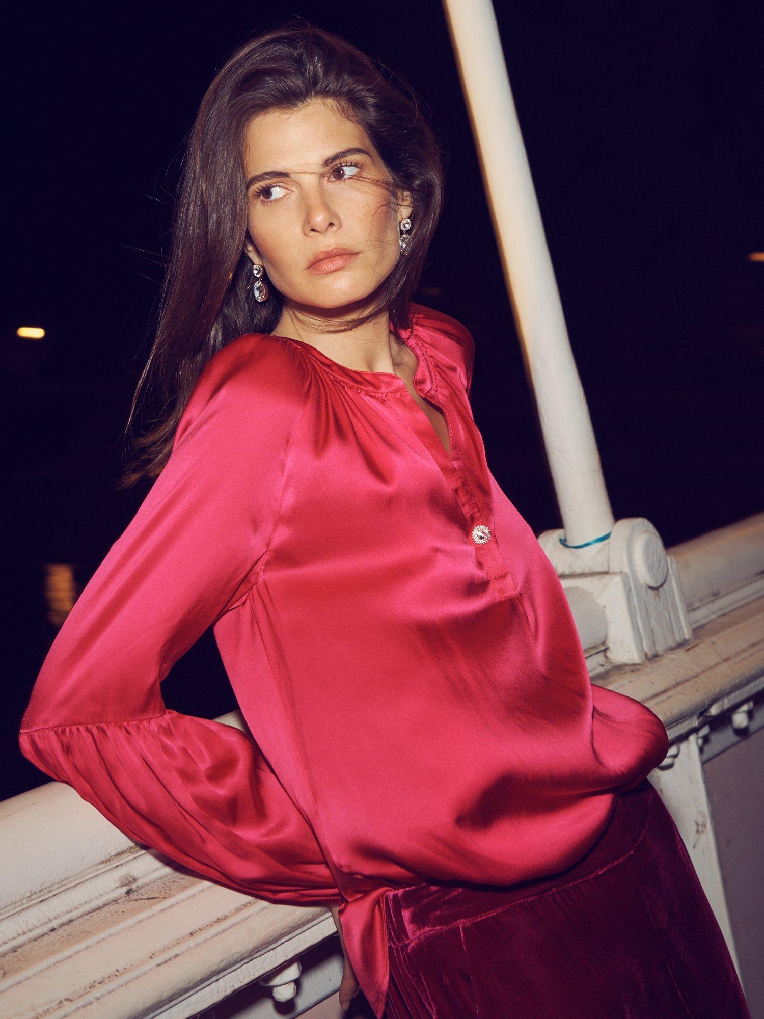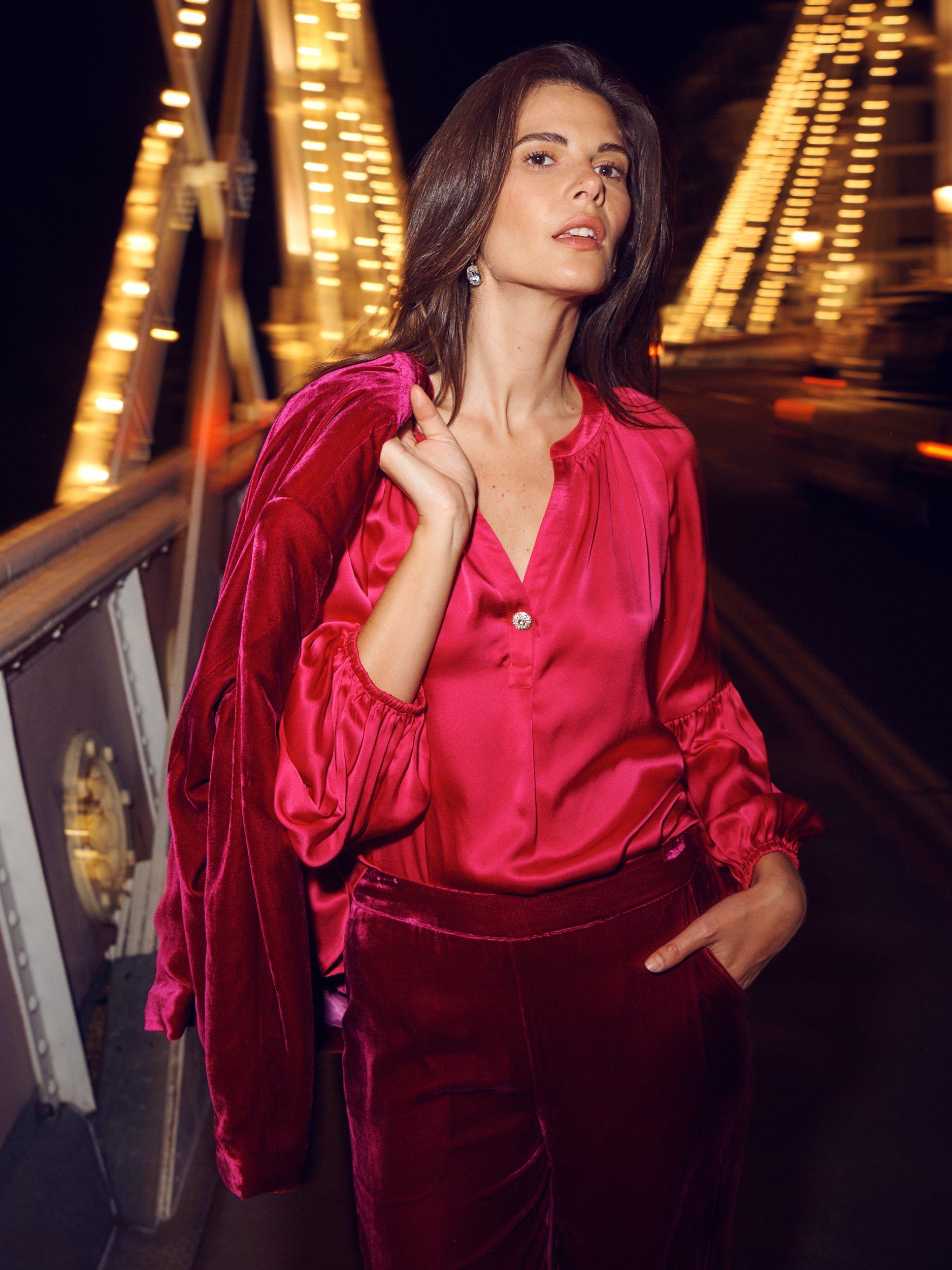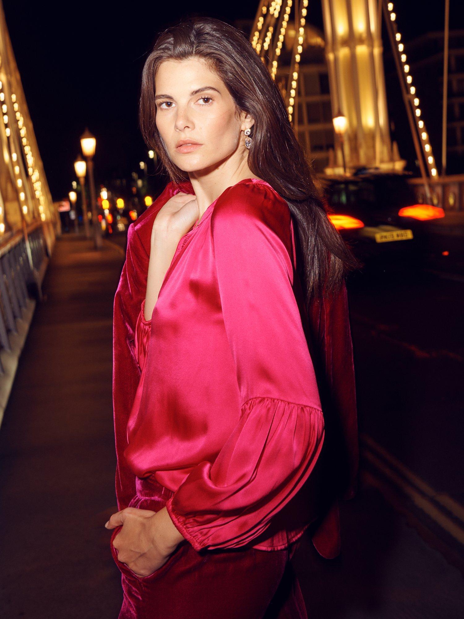Style and comfort combined, Ophelia is an easy silhouette with a flattering v-neckline, cut in a soft washed silk. Simple, but with spectacular gathered sleeves. Push the easy elasticated cuff up to your elbows for a fluted sleeve look. Loose fitting, whether worn tucked in or tunic style - ready to be styled up or down whatever the moment.
