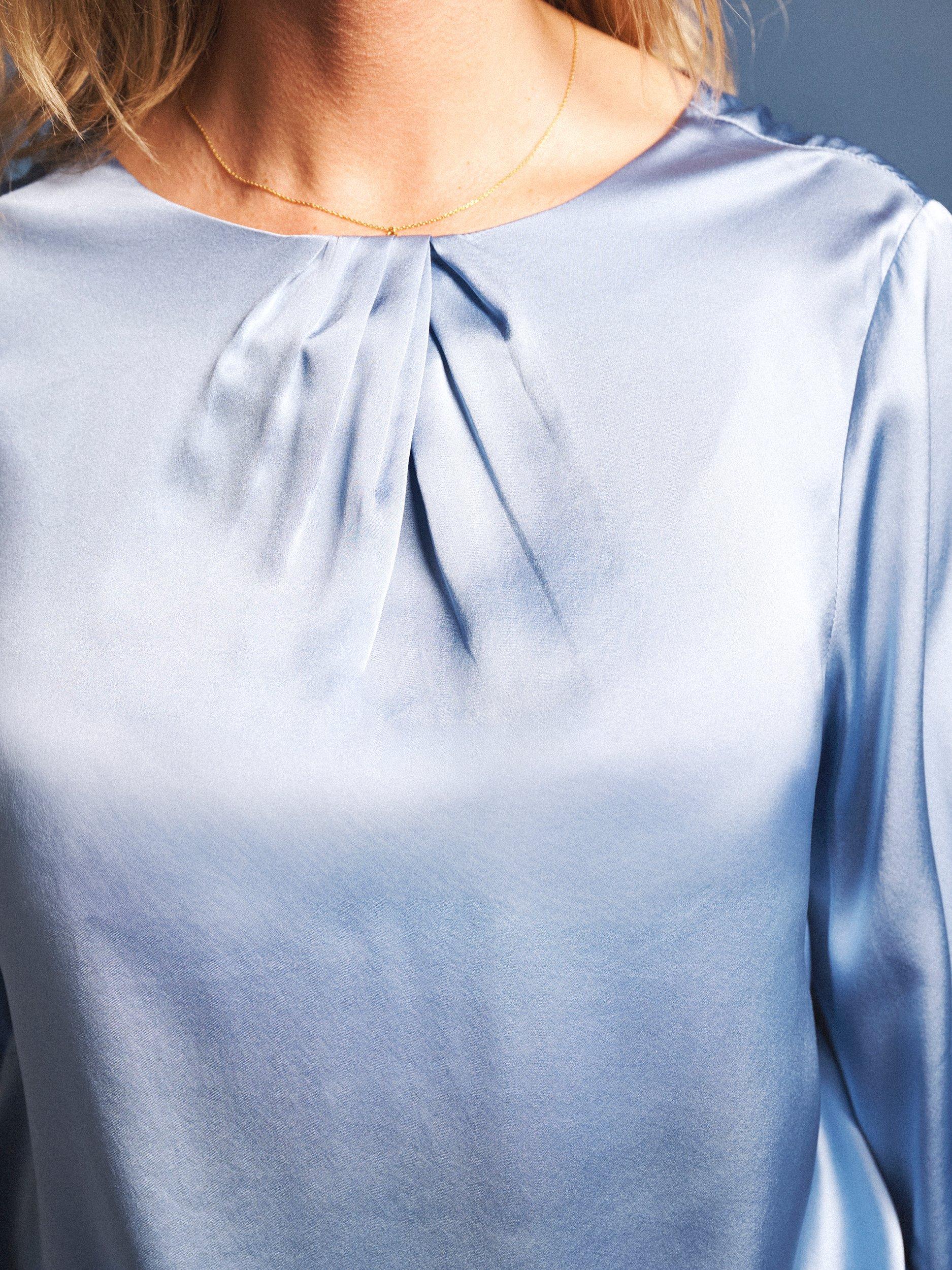 Patsy brings subtle polish to everyday dressing. Featuring a neat round neckline with delicate pleat detail, and subtle back opening, all in 100% silk for a soft drape. Tuck into velvet trousers or wear loose and floaty.