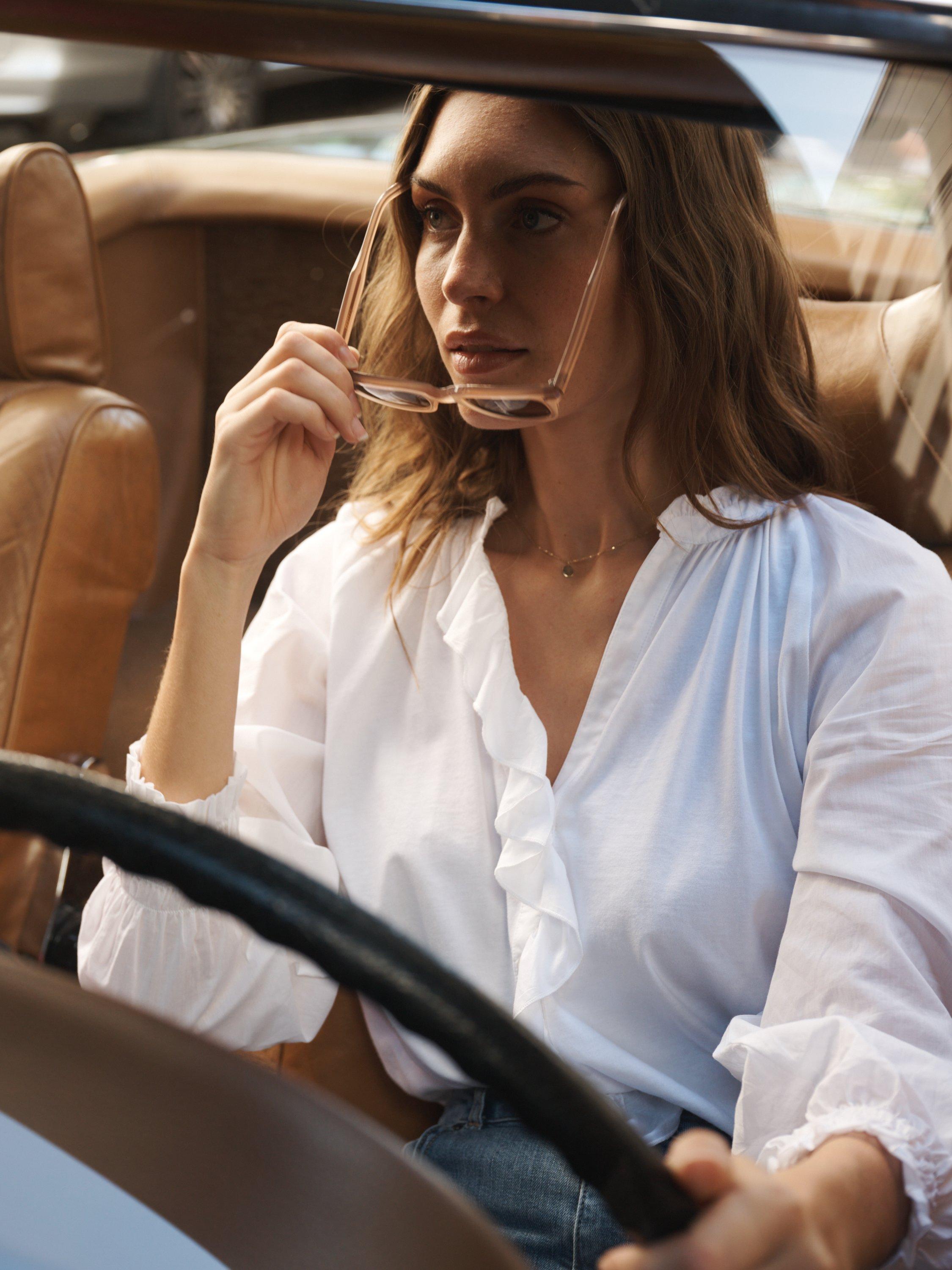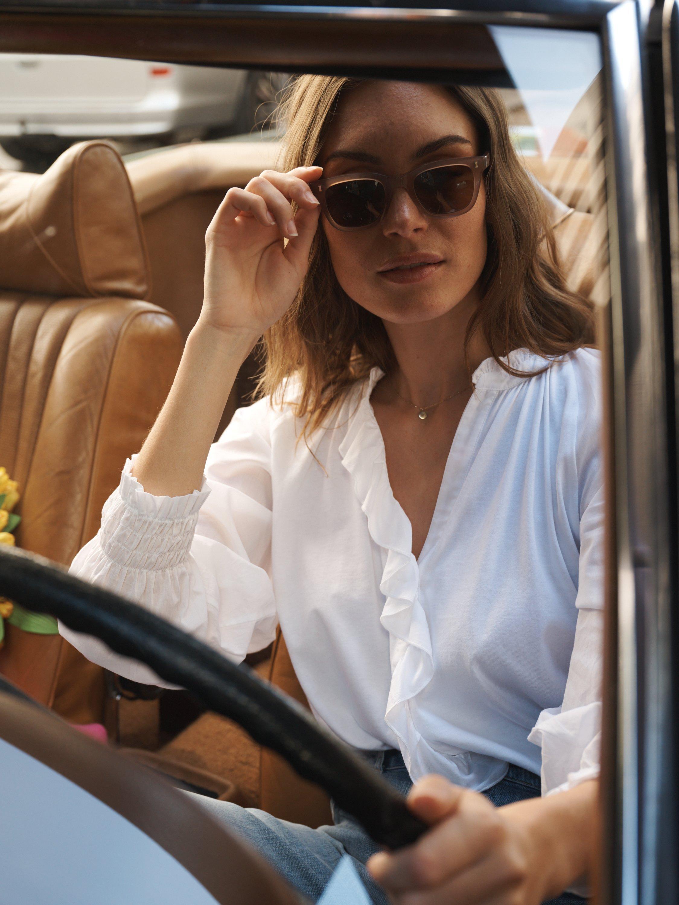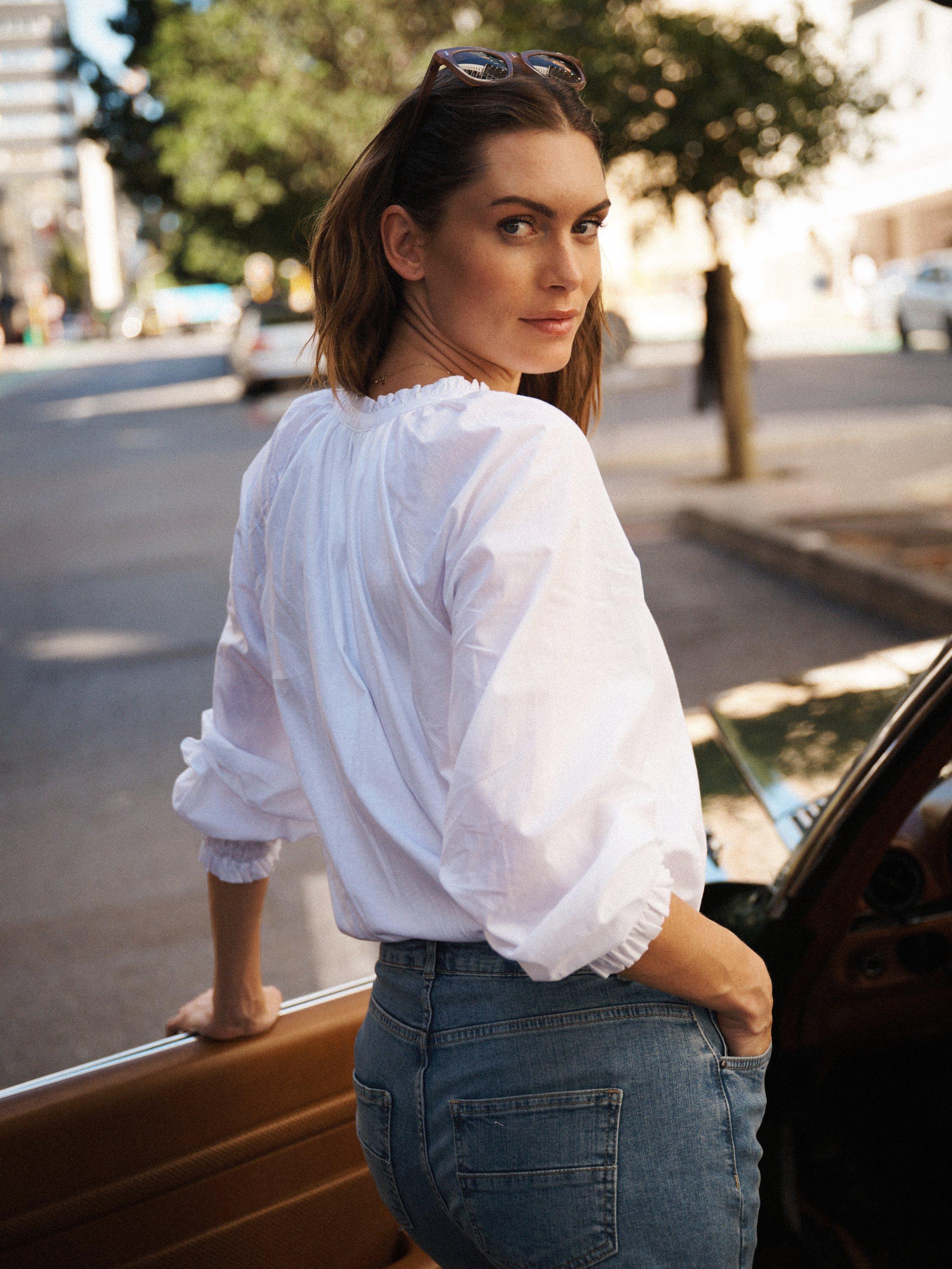 The Stevie shirt is all about effortless elegance. The jersey body is paired with woven cotton sleeves and finished with softly shirred elasticated cuffs. A delicate frill collar and button-through design enhance its charm, while soft gathers at the neck and a relaxed fit ensure it's as comfortable as it is chic. Stevie has everything you need in a shirt.