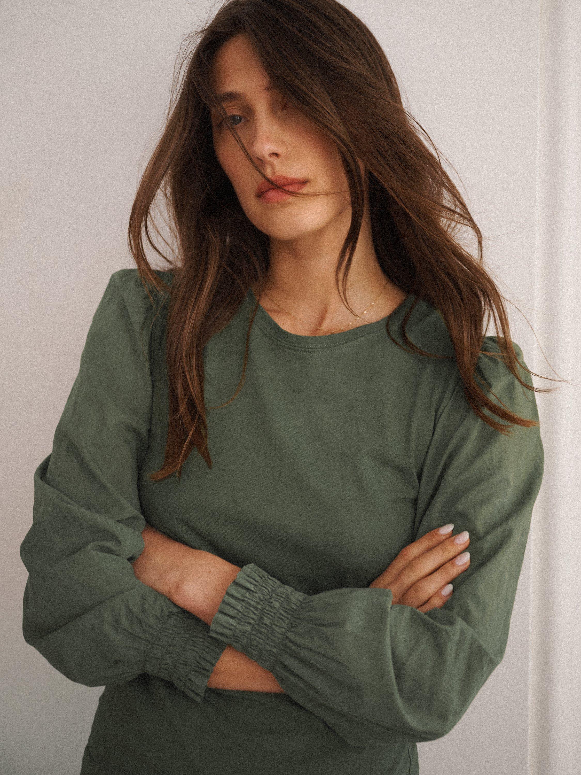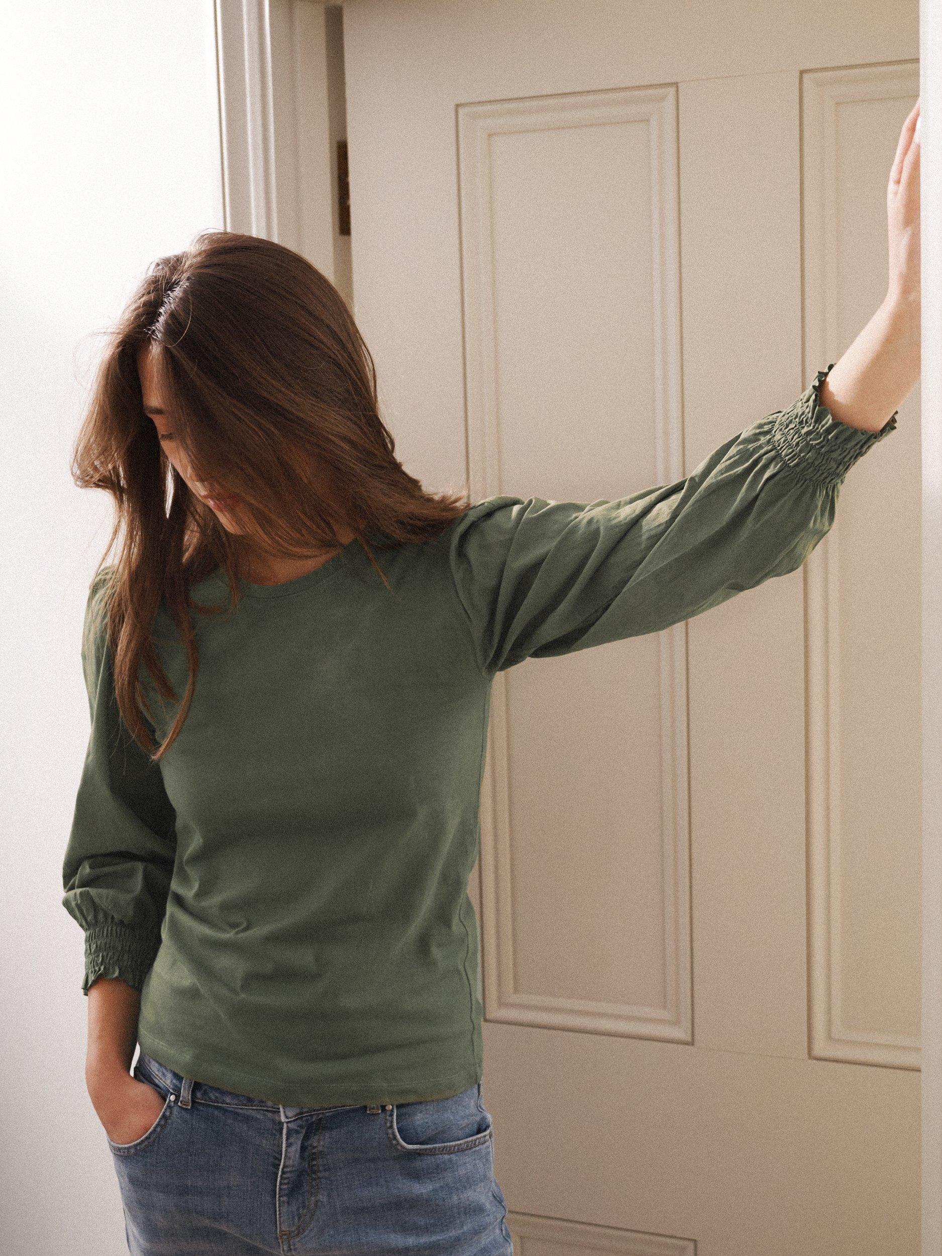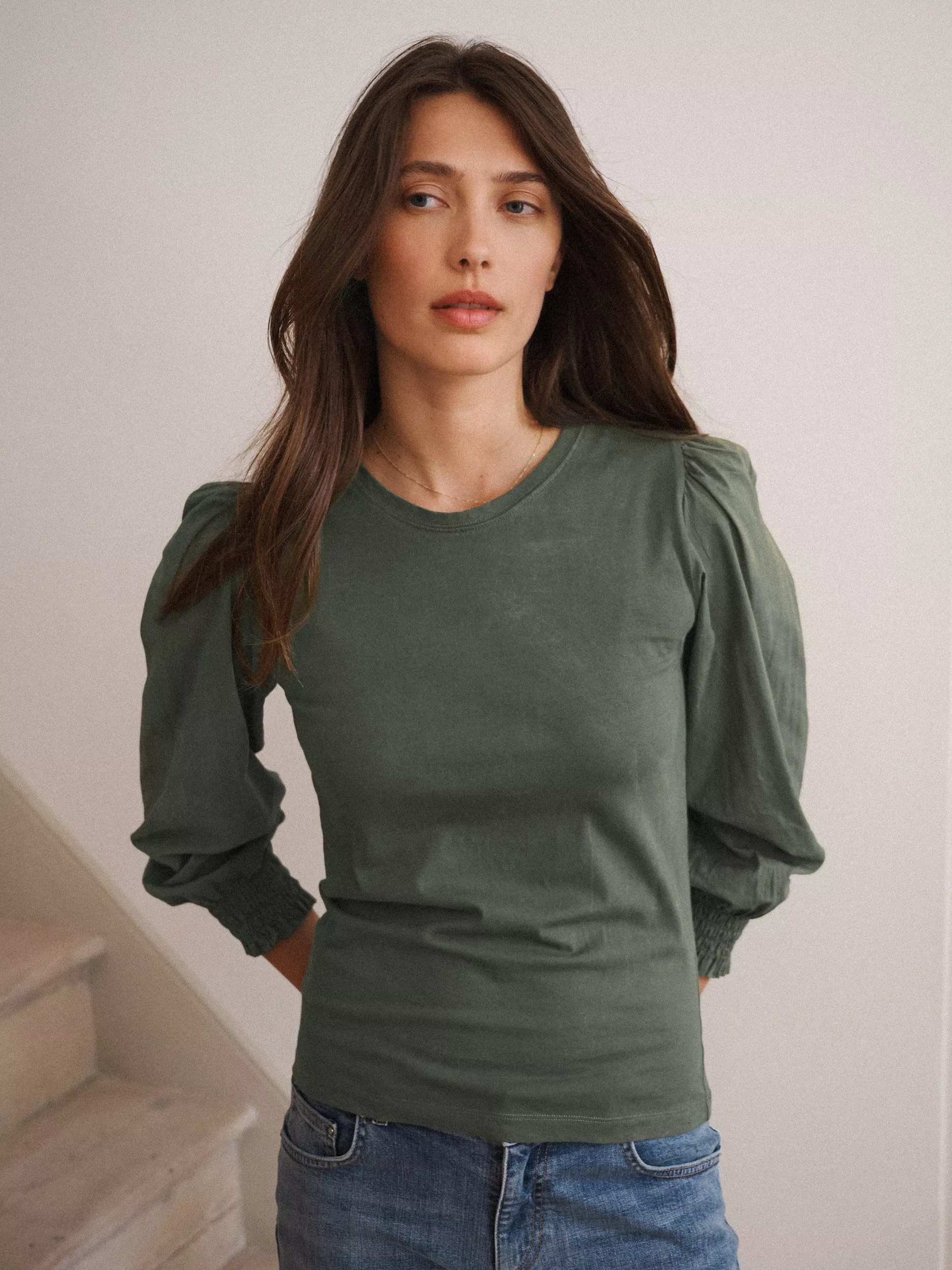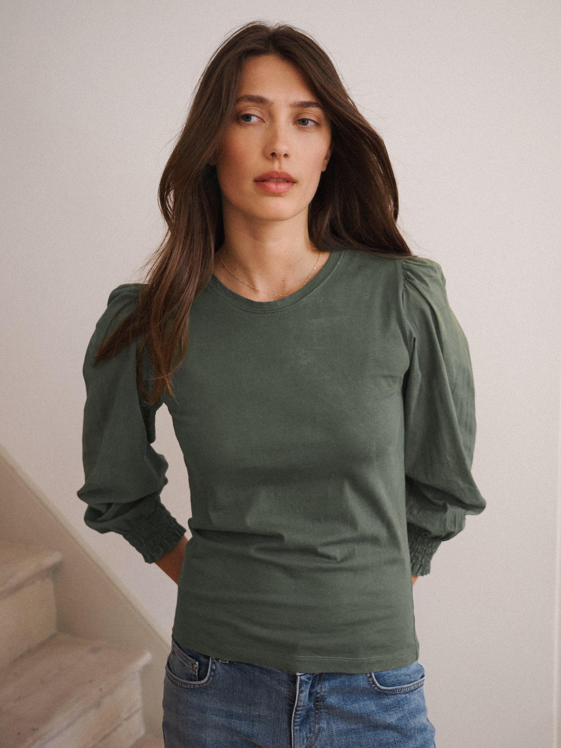 Carved with a crew neck and long puffy sleeves, it is light and breathable in cotton and is an easy daytime option.
