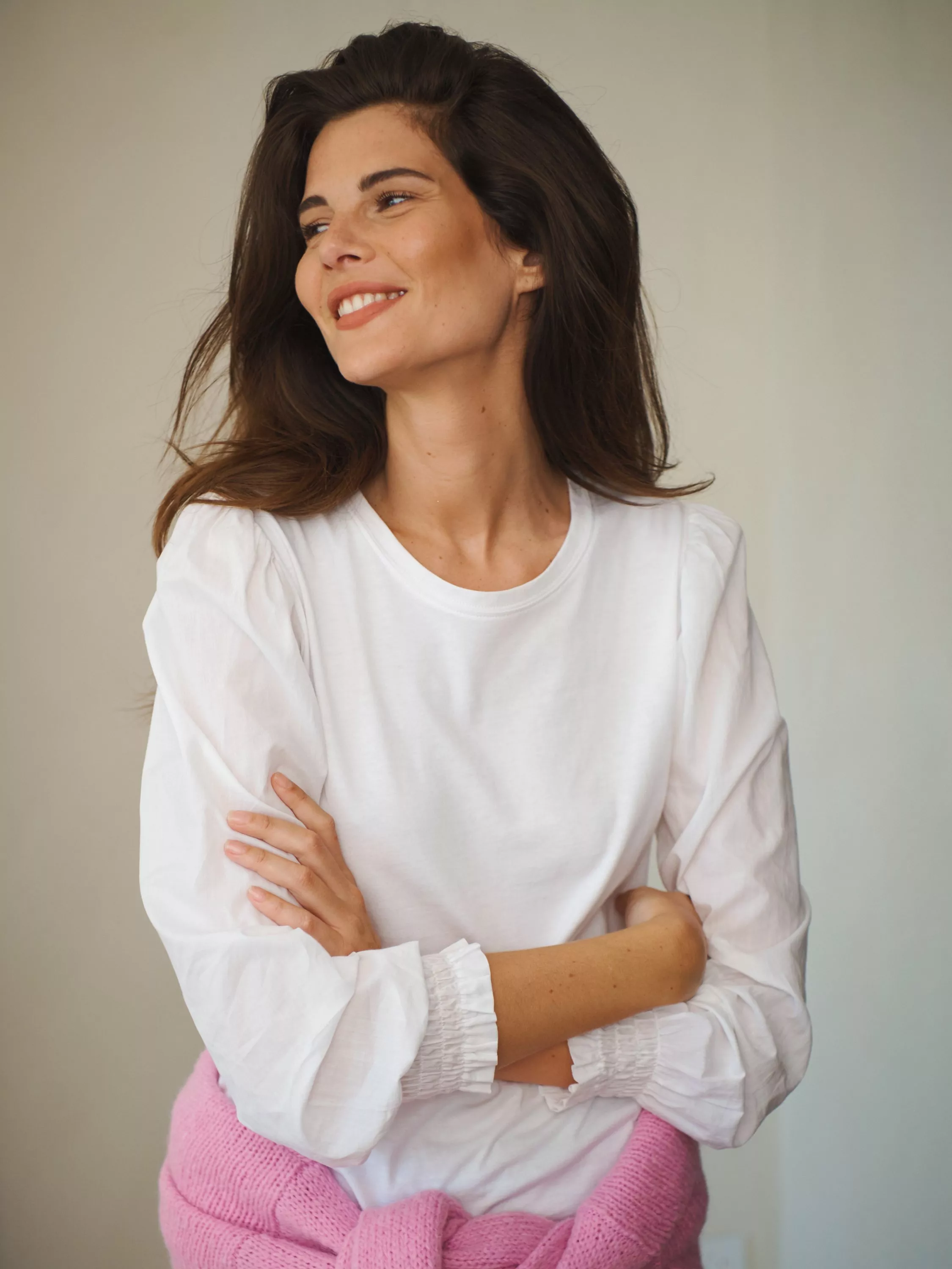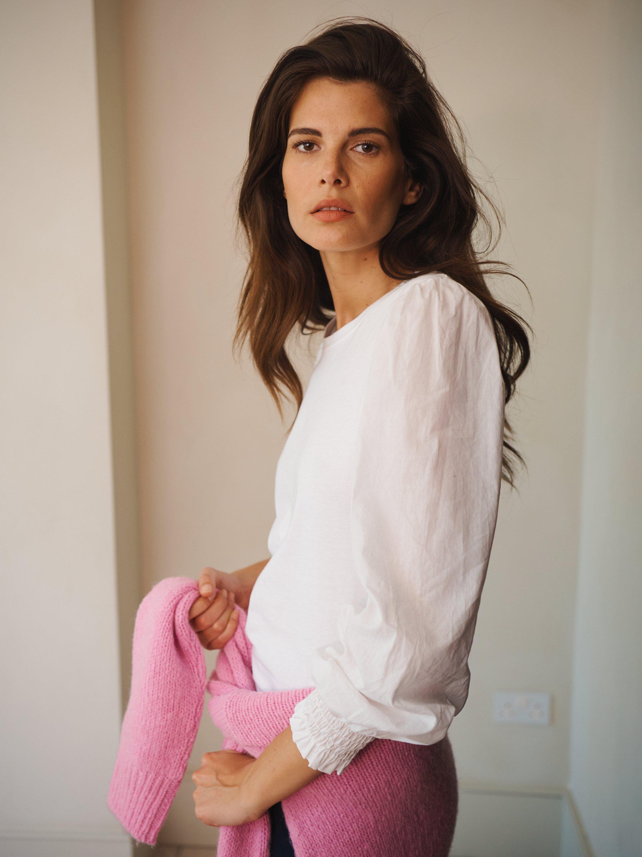 Carved with a crew neck and long puffy sleeves, it is light and breathable in cotton and is an easy daytime option.