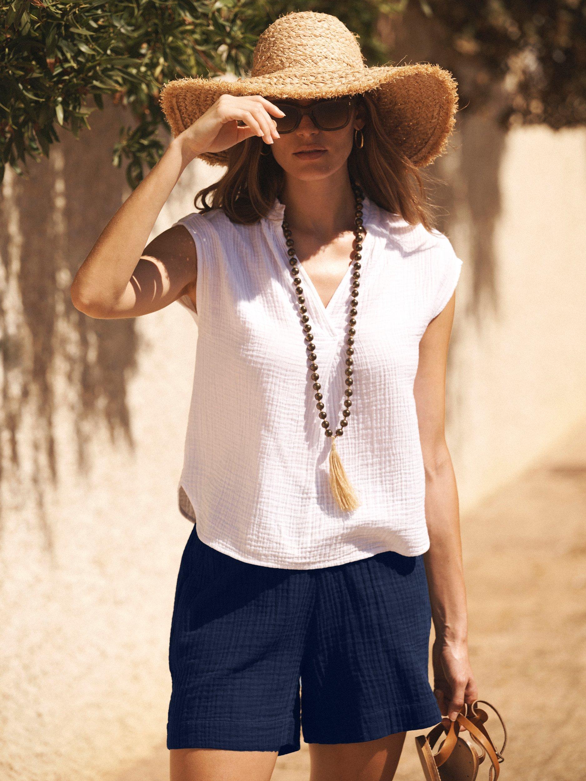 Anywhere and everywhere shorts. Tia is made in the softest cotton double cloth. Featuring a flattering flat front, an elasticated back for the perfect fit, and practical side seam pockets, these shorts are a versatile summer essential.