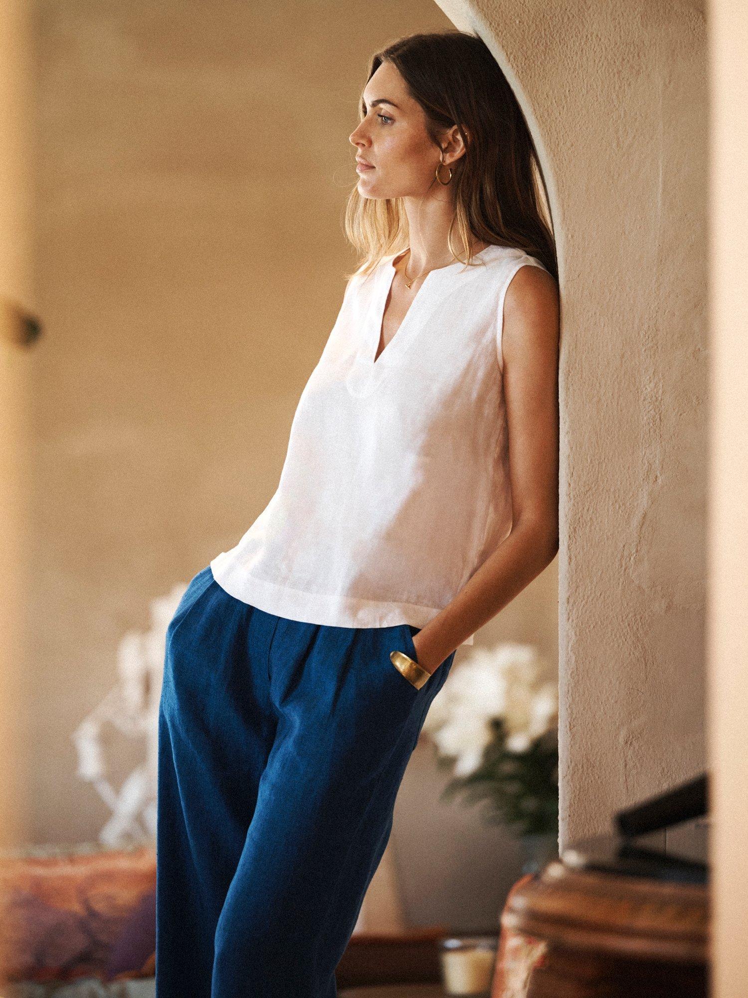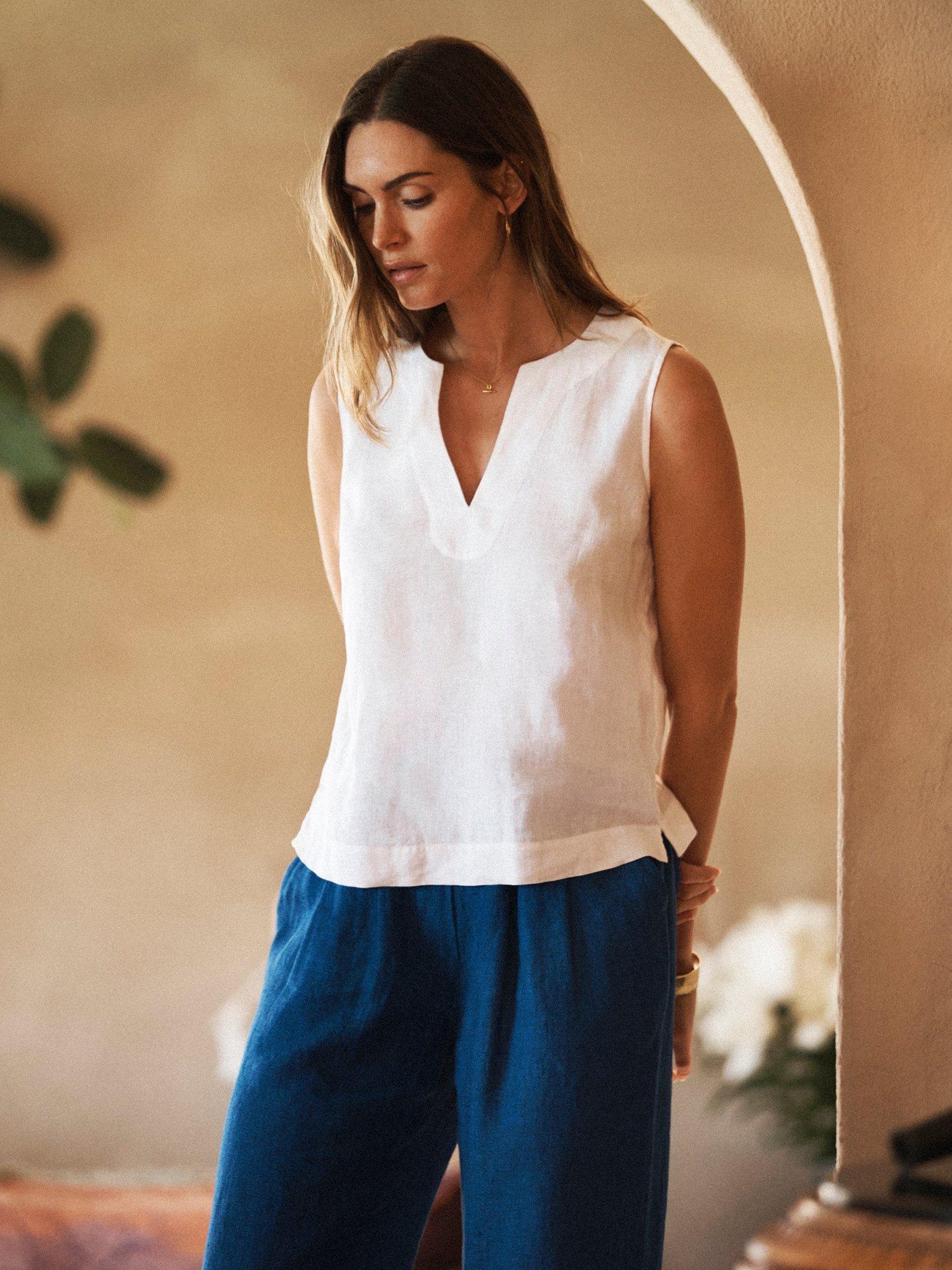 Introducing Toni, the relaxed linen top designed for warm-weather ease. Cut in a sleeveless vest shape with a soft notch neckline, this is a simple, versatile piece that layers beautifully or stands alone on warmer days.