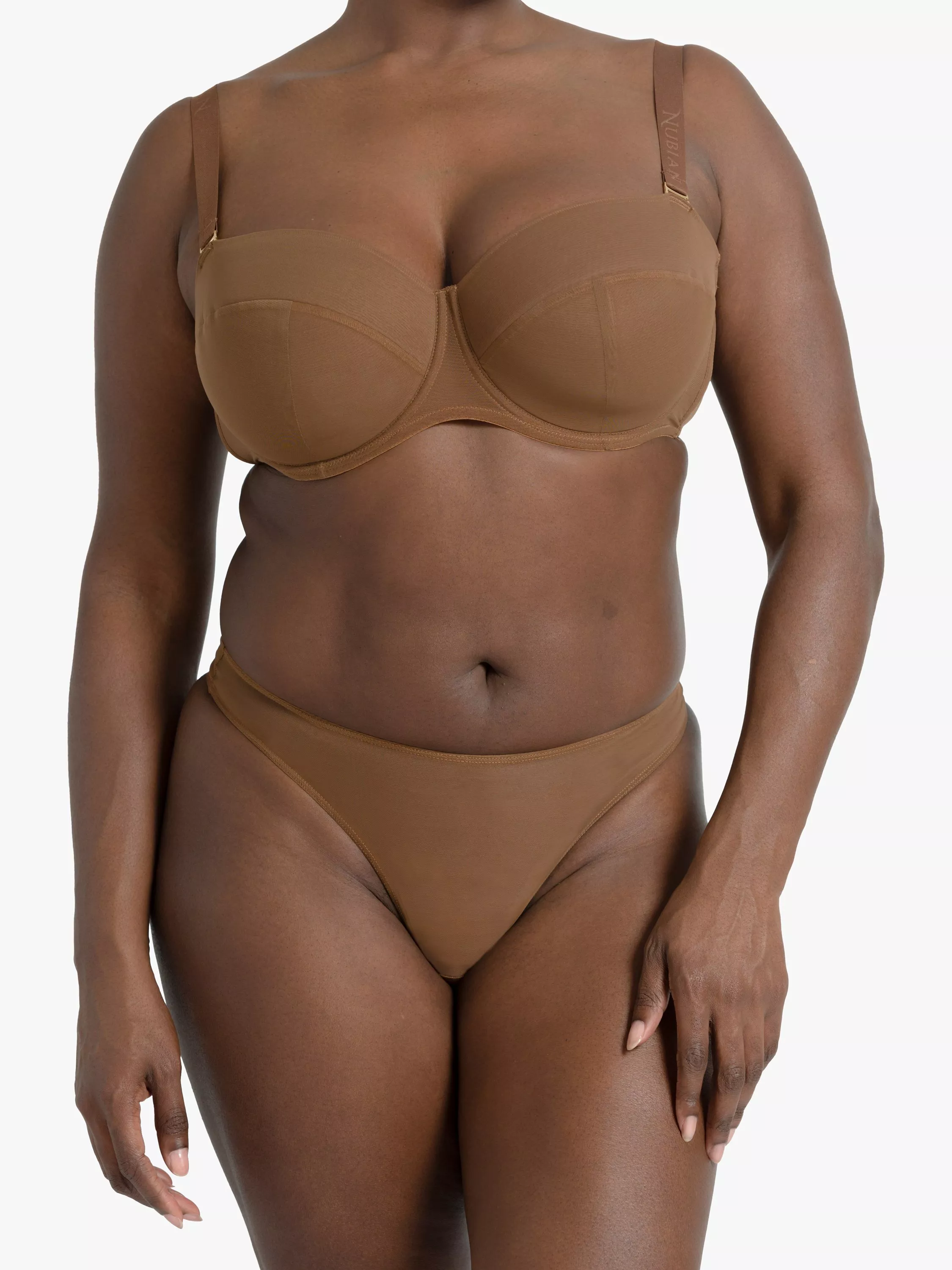 The Nubian Skin mesh multiway bra is built to support your shape and skin-tone. This bra features a light foam lining and a three-part cup with adjustable straps and hook-and-eye closures. The band is lined with silicon strips to provide a secure fit, particularly when worn as a strapless. So comfortable you'll want to wear it every day. Pair with your choice of matching briefs from the collection.