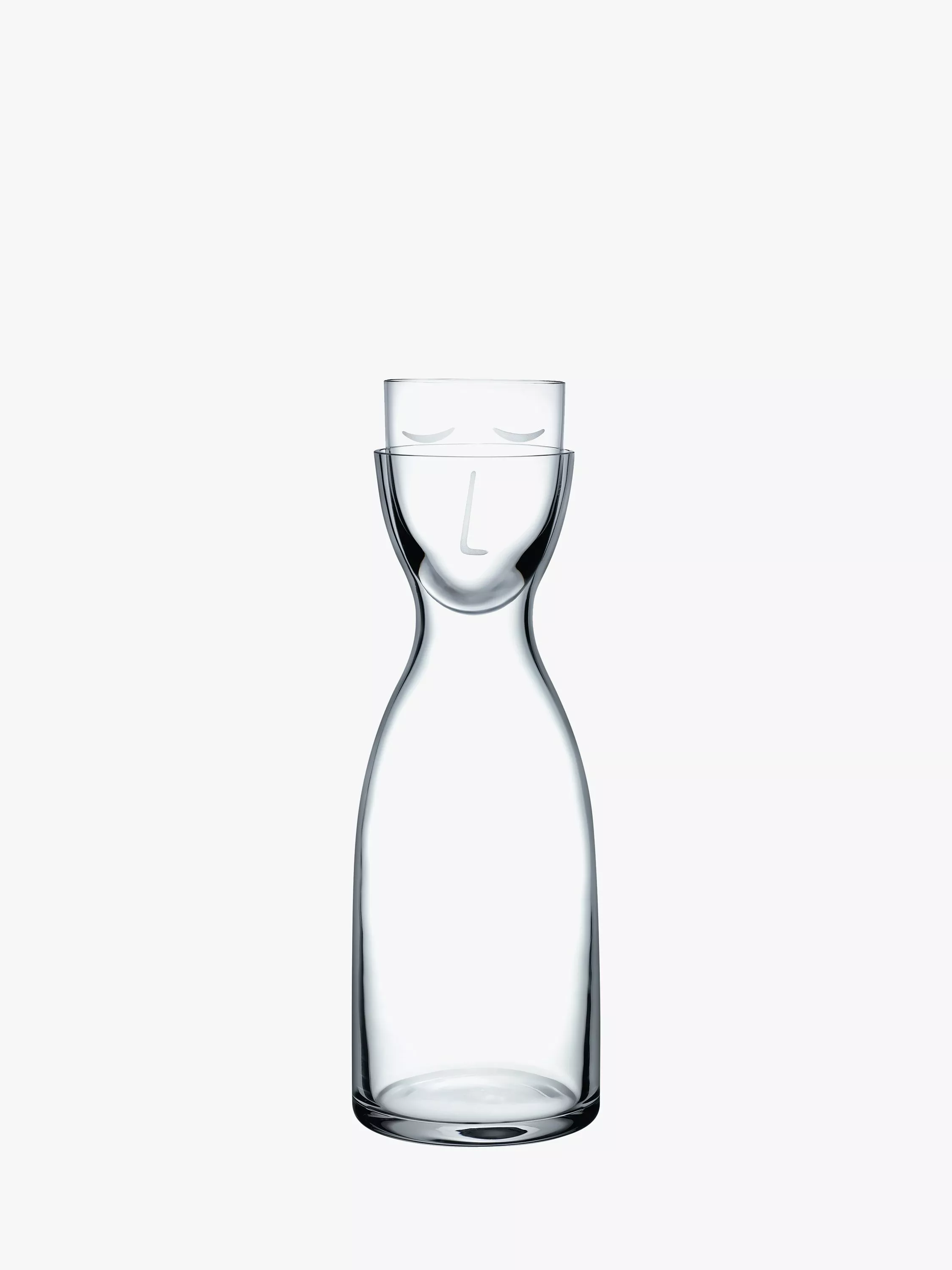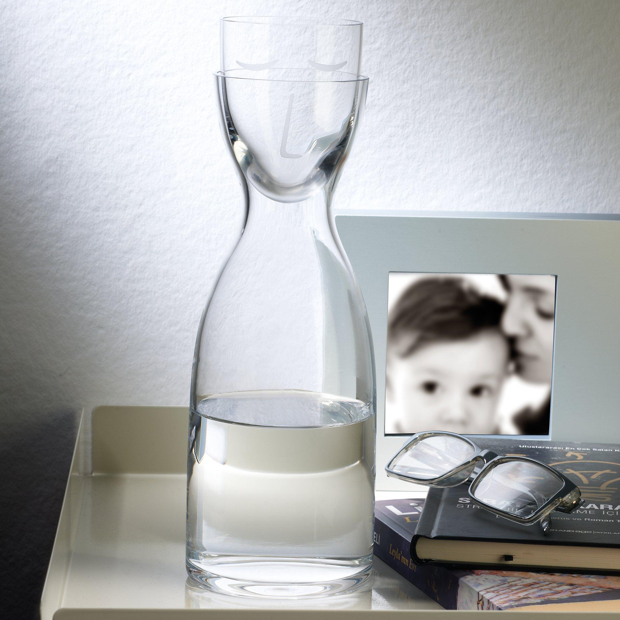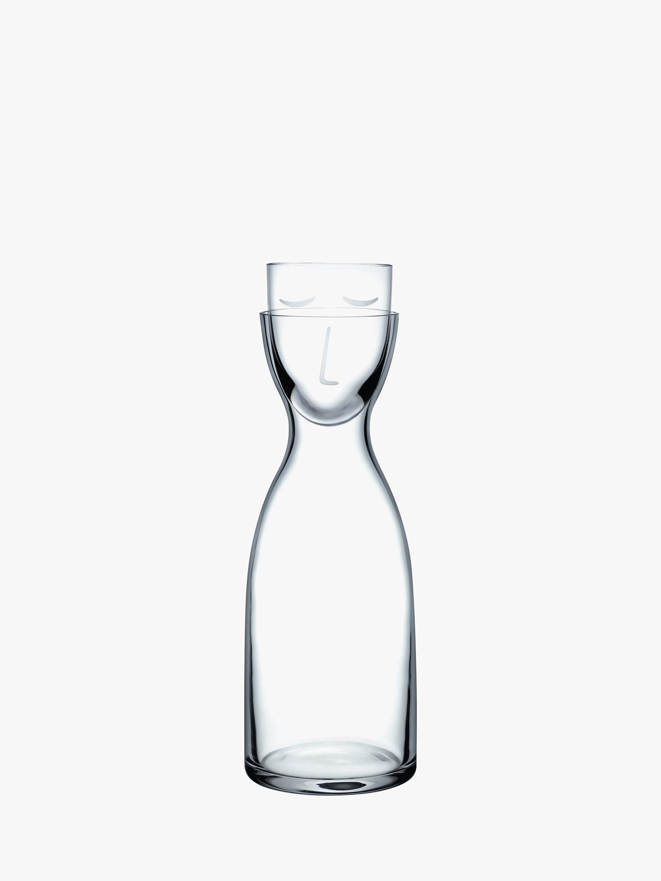 An amusing water jug with integrated mouth-blown lead-free crystal glass cup.