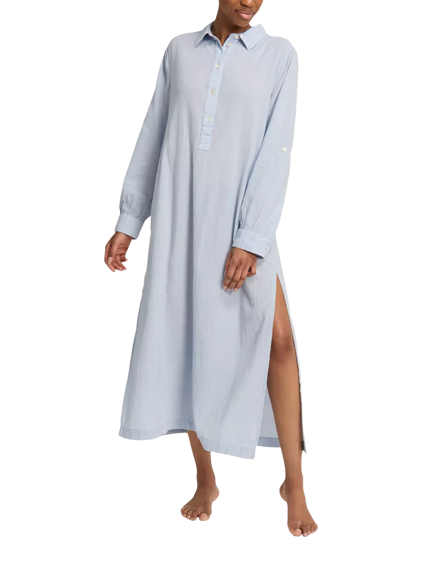 Full-length 100% cotton shirt. Adorned with signature Nudea detailing, mother-of-pearl buttons and thigh-high side slits.