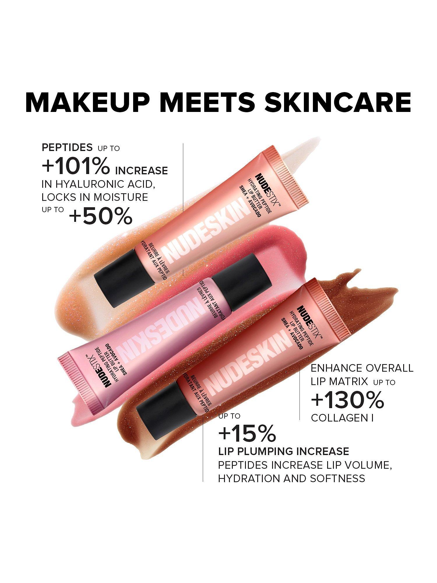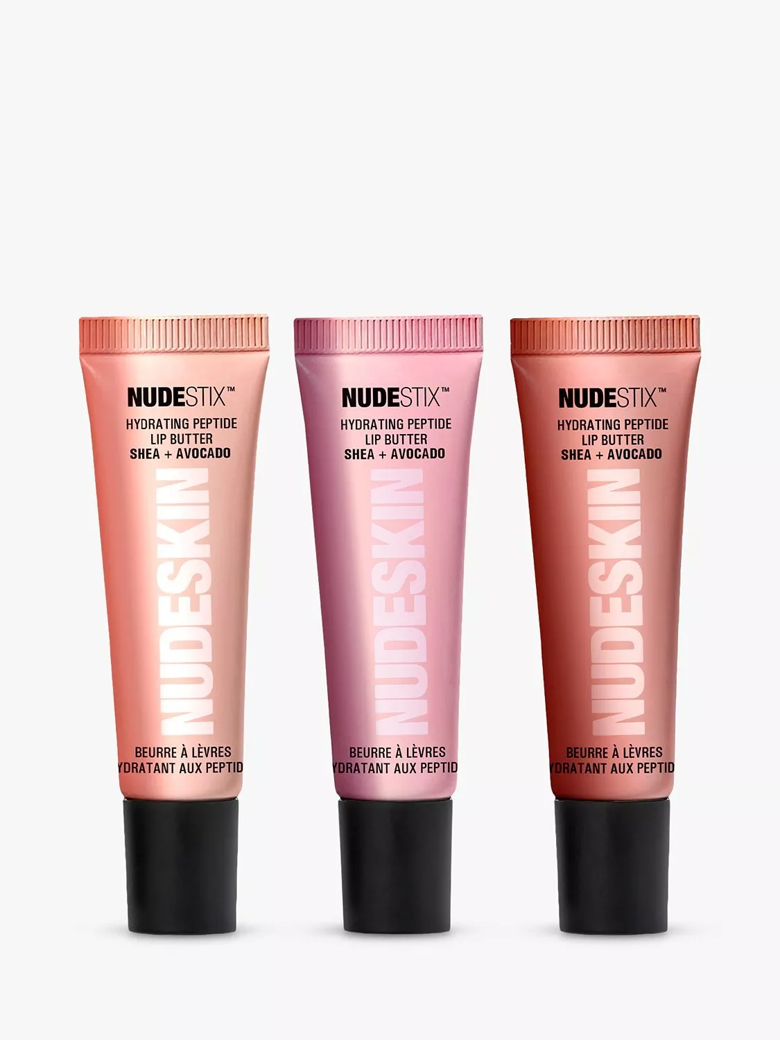 A limited edition, 3-piece lip shimmer set featuring NUDESKIN hero product, HYDRATING PEPTIDE LIP BUTTER in 3 glossy, sparkly, universal tints and natural flavours.