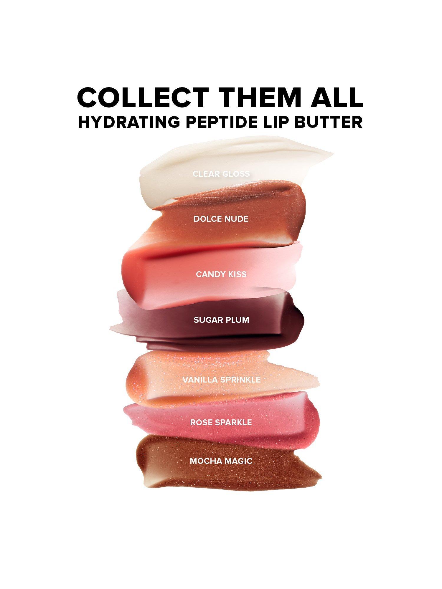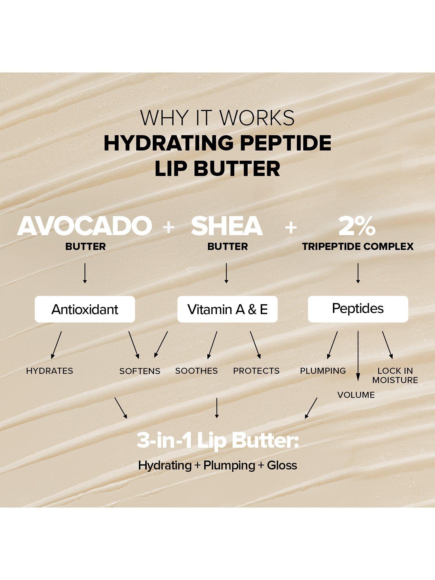Ripe avocado and shea butters melt to instantly soften the lip texture and lock in moisture for all-day glossy hydration. 2% Tripeptide Complex plumps, nourishes and hydrates lips with daily use. Lips feel soft and juicy and look plump and contoured, while tasting fresh and yummy with every daily dose of Hydrating Peptide Lip Butter.