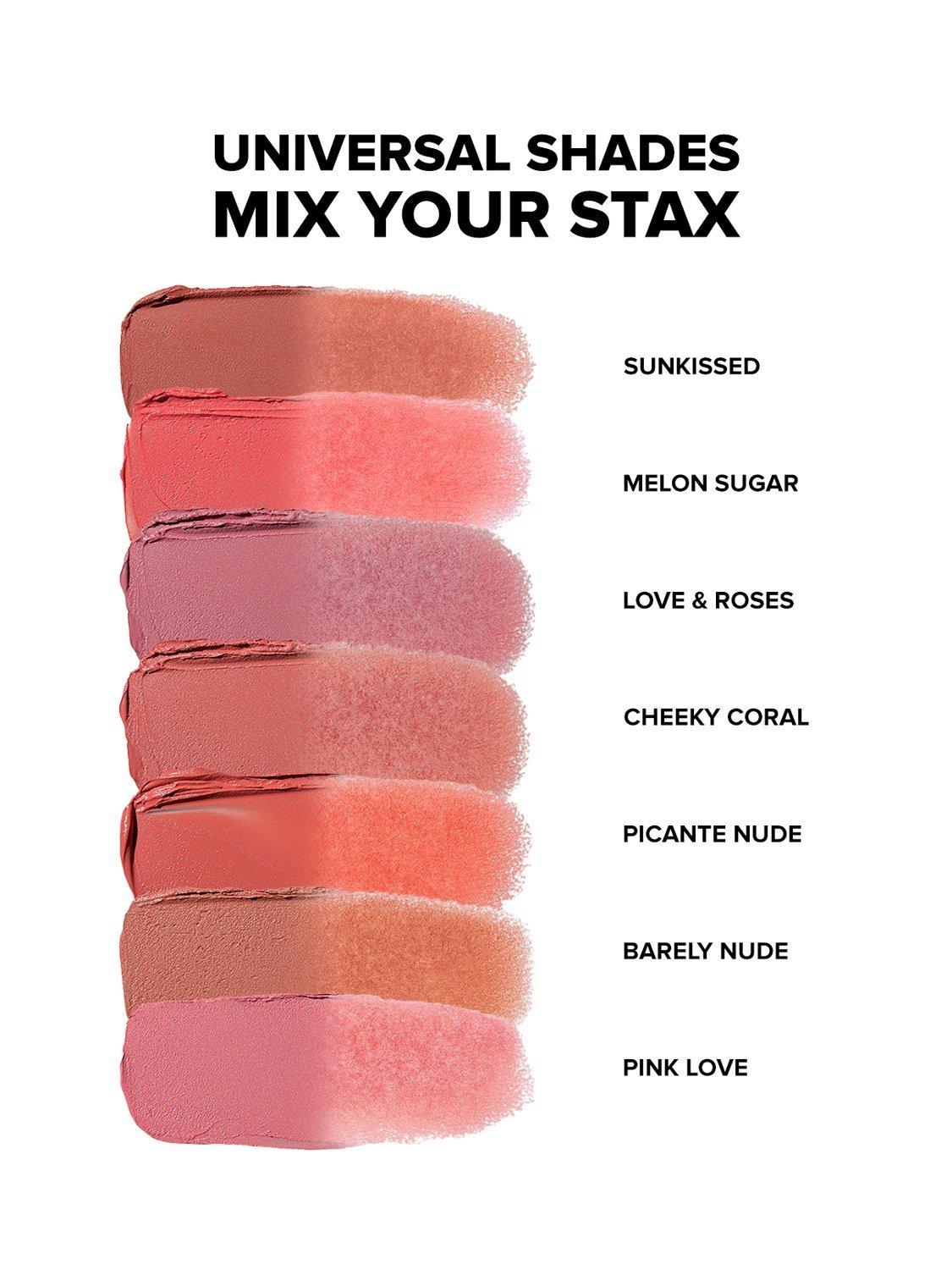 This monochromatic blush cream-to-powder formula applies with the dream of a cream and the long wear of a soft matte powder to create a nude cloud-cushion colour that's so easy. Bounce with your finger and swipe on cheeks, eyes and lips for a soft flush of colour. Collect, click and STAX!
