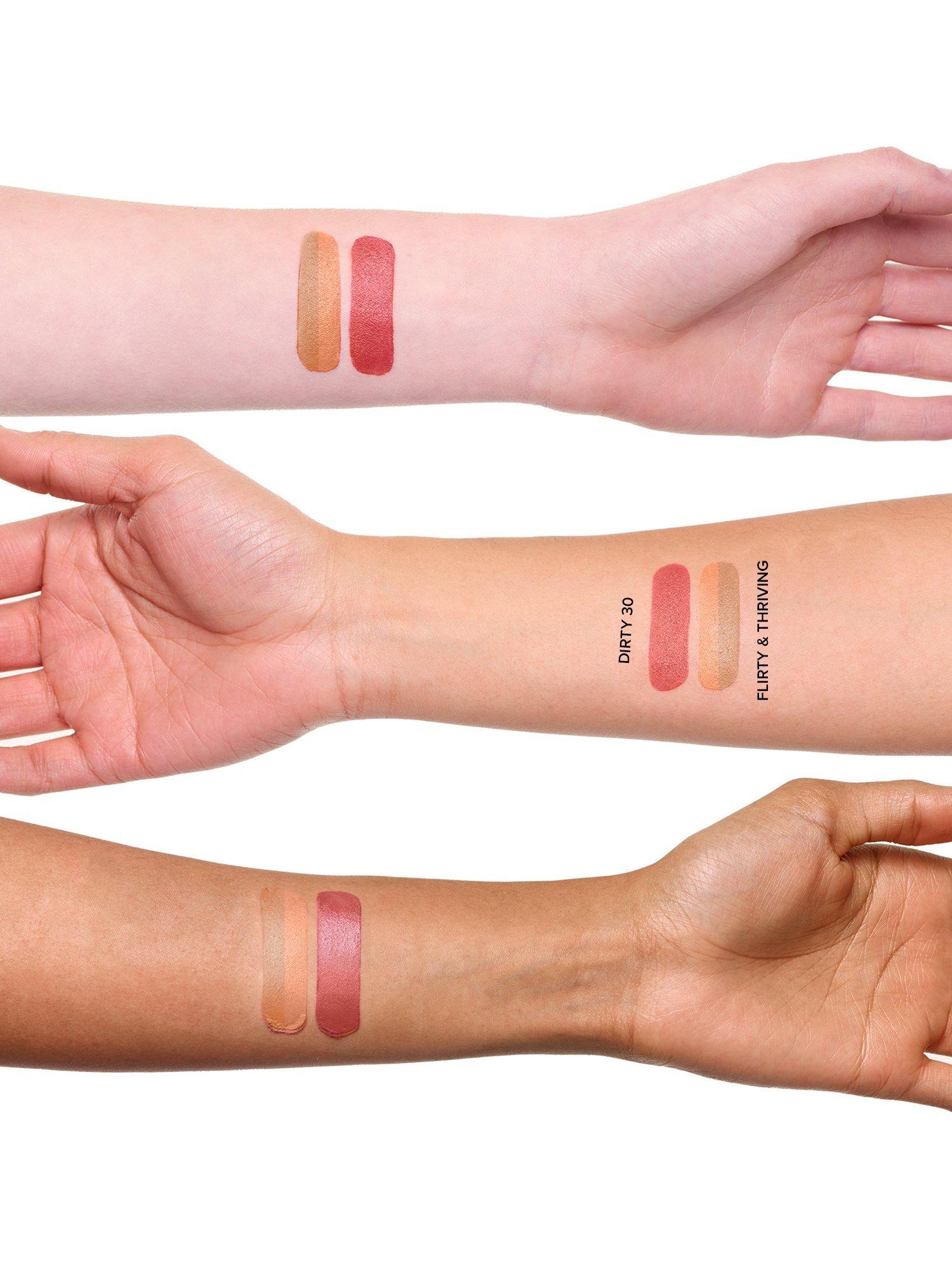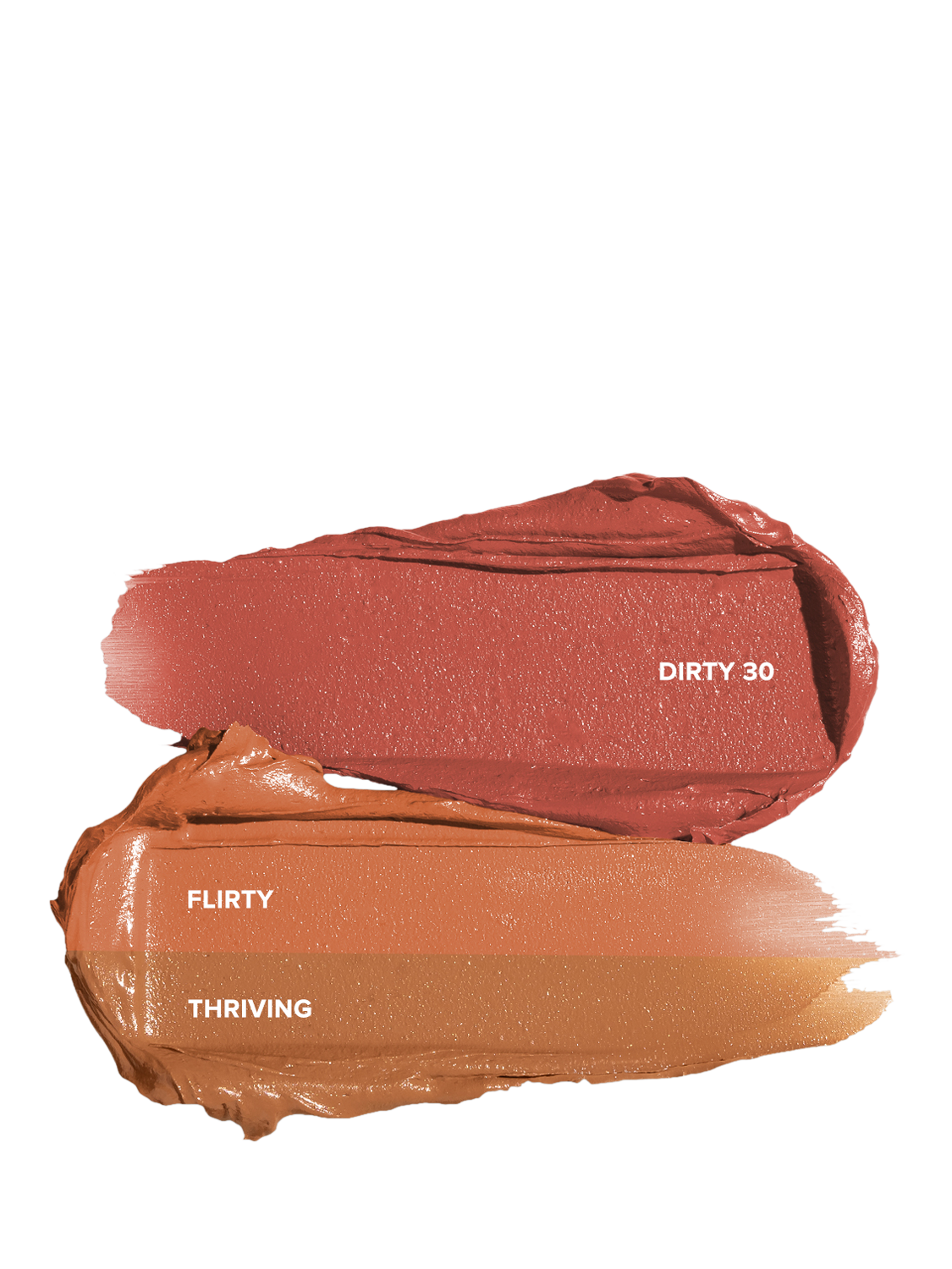 Apply each colour separately on cheeks, *eyes and lips to create multiple monochromatic looks. Stack your blush for the ultimate ‘Dirty Thirty, Flirty & Thriving’ Look. Apply DIRTY THIRTY on the front of the cheeks. Add THRIVING directly behind DIRTY THIRTY and blend towards the temples. Blend THRIVING & DIRTY THIRTY together and add along forehead close to hairline then blend. Swipe FLIRTY across the bridge of the nose and press onto the lips.