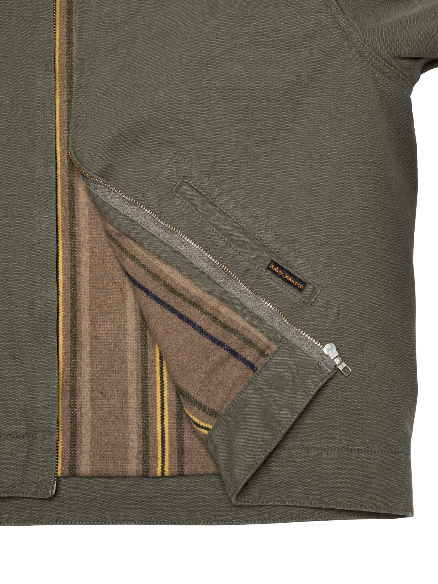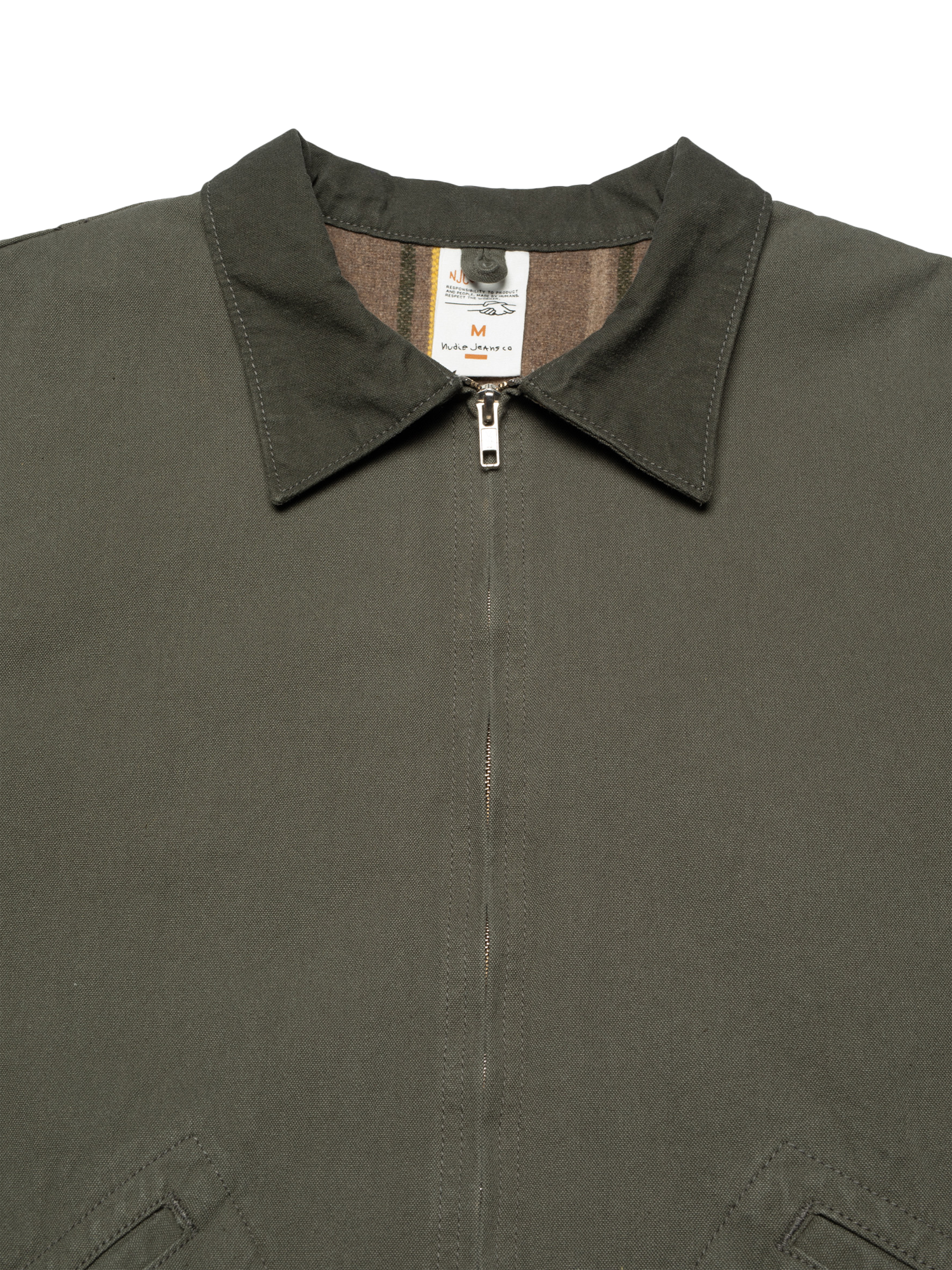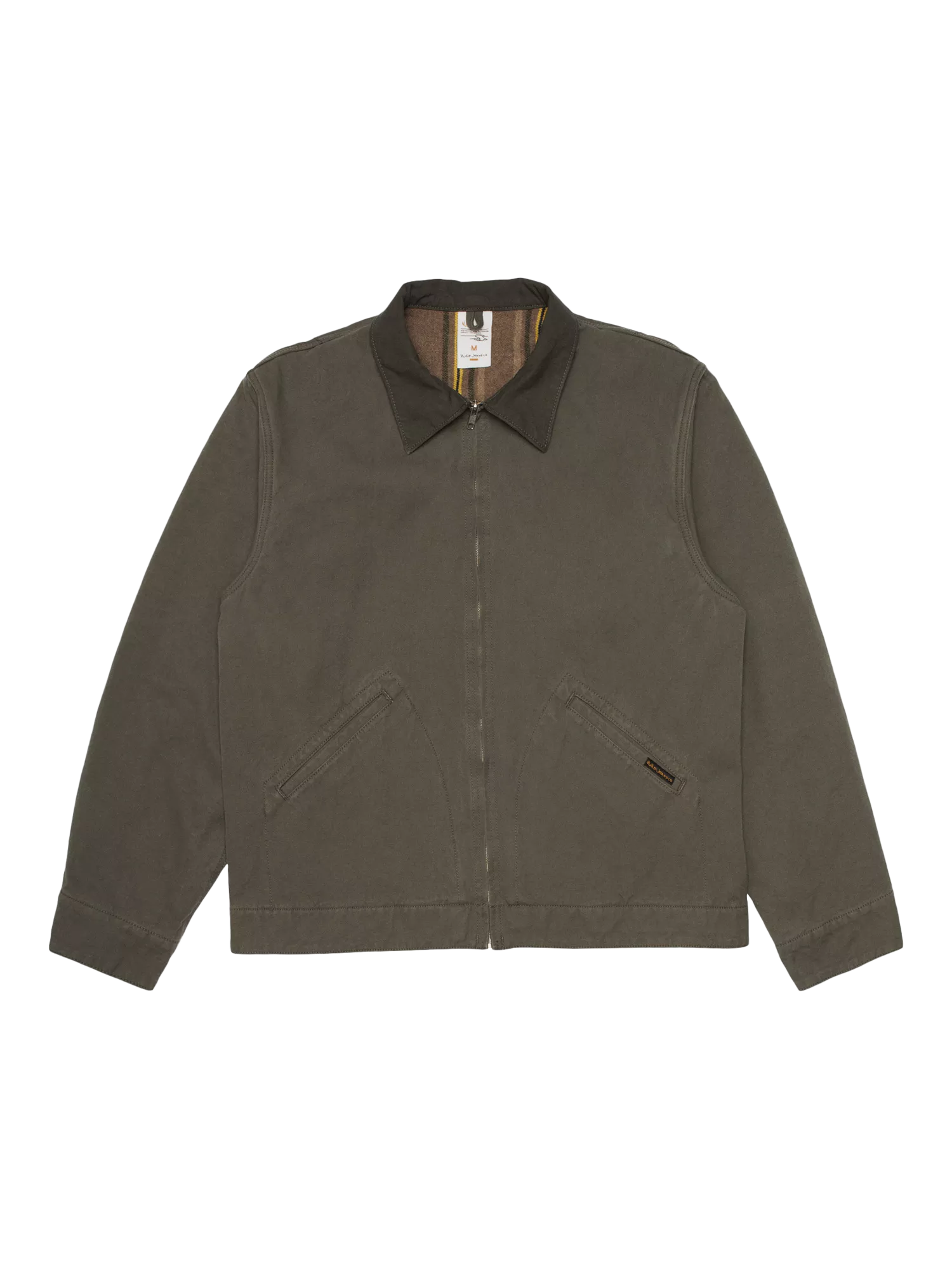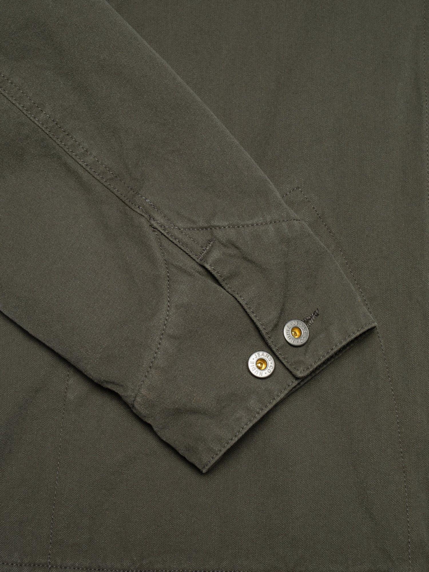 The Blake jacket features a regular fit with a short, boxy silhouette, staying true to the essence of a classic worker jacket. Designed for warmth and mobility, the body is lined with a wool-mix blanket, while the sleeves are lined with a blend of cotton and recycled polyamide for ease of movement. The collar, crafted from the same Duck Canvas in a deeper shade of green, provides a subtle tonal contrast, enhancing its workwear aesthetic. Detailed with tonal stitching and curved welt pocket stitching, this jacket masterfully blends vintage inspiration with practical functionality.
