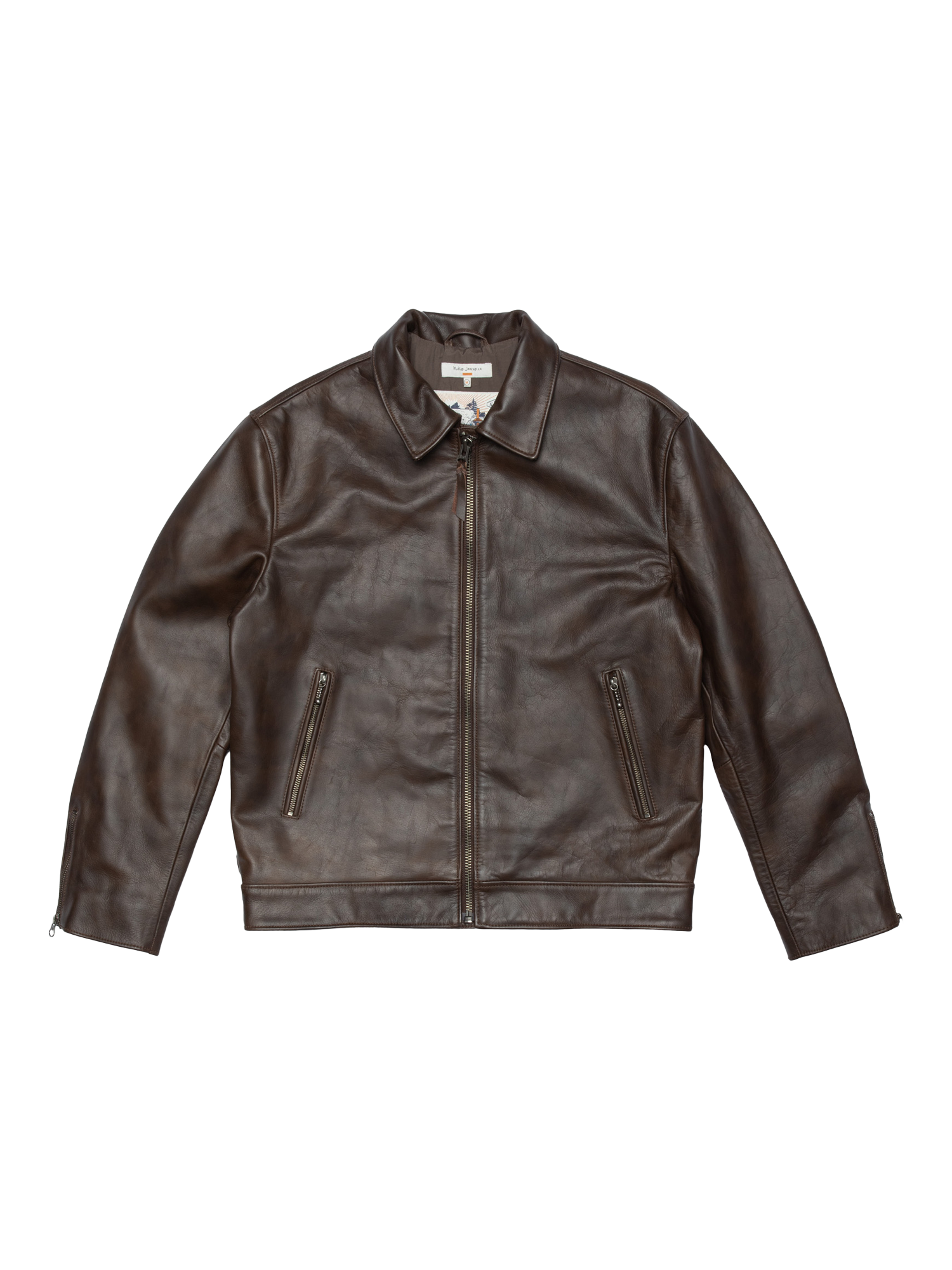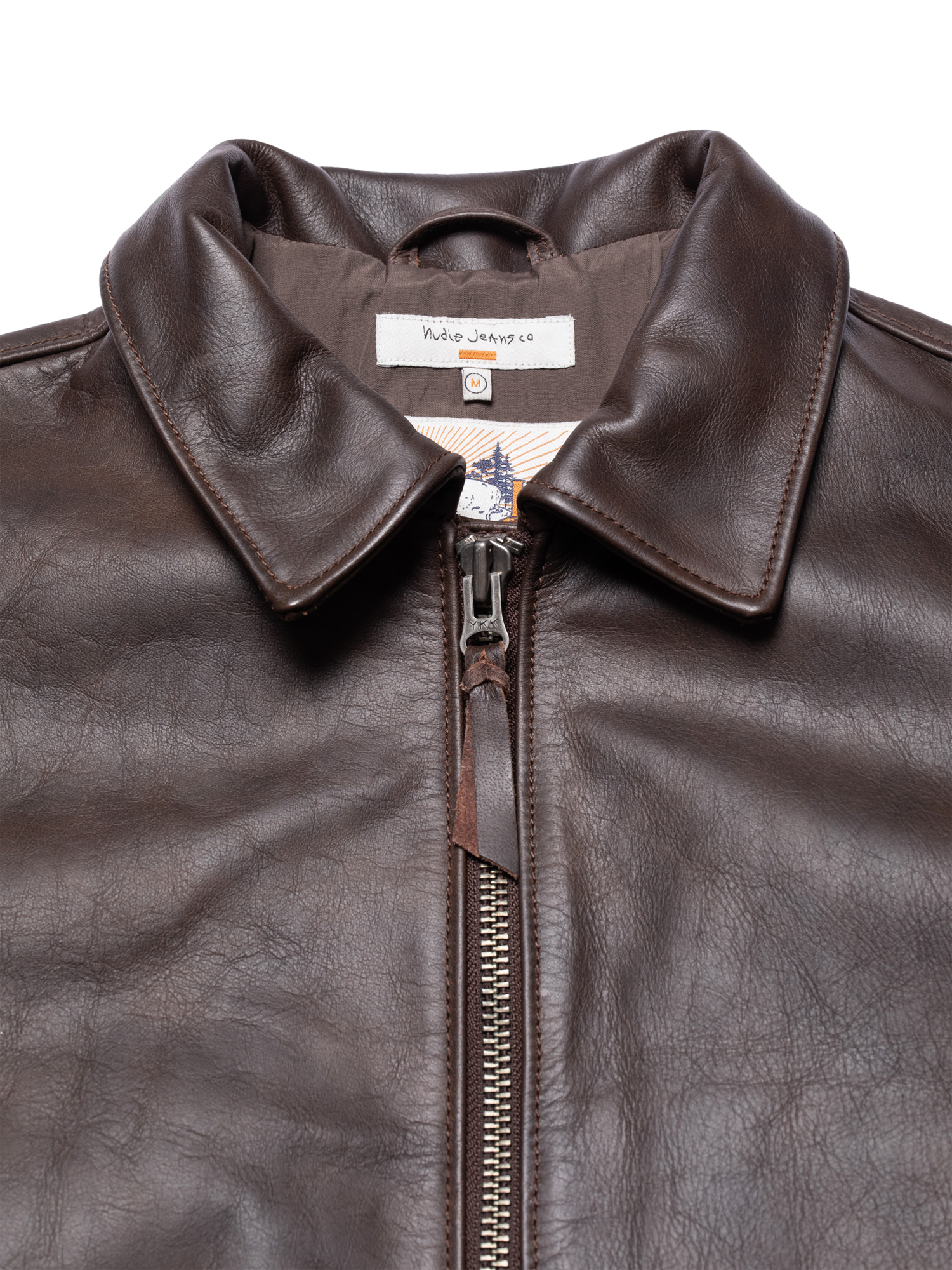 A Nudie Jeans jacket crafted in sturdy buffalo leather. It's made in a retro-inspired silhouette with a point collar and zipped side pockets. The body and sleeves are lined with a fabric that mixes organic cotton and recycled polyamide. Inside, you also find two pockets to store small personal belongings. It also has zipped sleeves and buckled side tabs for a custom fit.