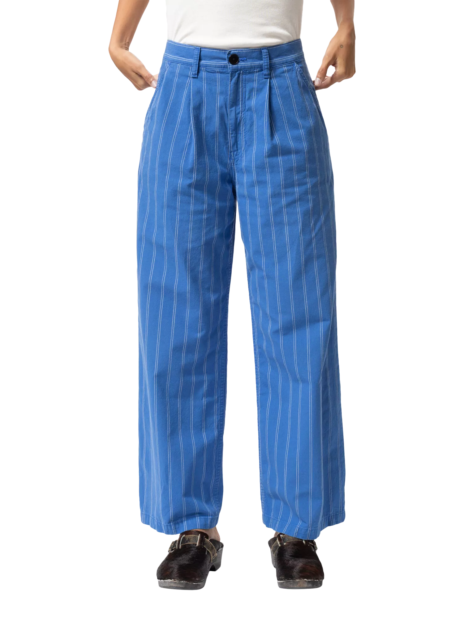 Introducing Gullan, a pleated loose-fit pant in a light stripe. Designed with a mid waist and wide leg, these pants are effortlessly elegant. Crafted from a wonderful striped plain weave with a dry, textural crispiness, Gullan strikes the perfect balance between lightweight and sturdy. The plain weave is constructed from irregular ring-spun yarn-dyed yarns, giving Gullan its unique touch and look. Thanks to the patented dyeing process, Gullan will age similarly to an indigo garment, slowly brightening in tone and enhancing the fabric's texture. Gullan is exceptional from the start and will become even more beautiful with wear and washing. A garment perfectly suited for tomorrow's vintage.