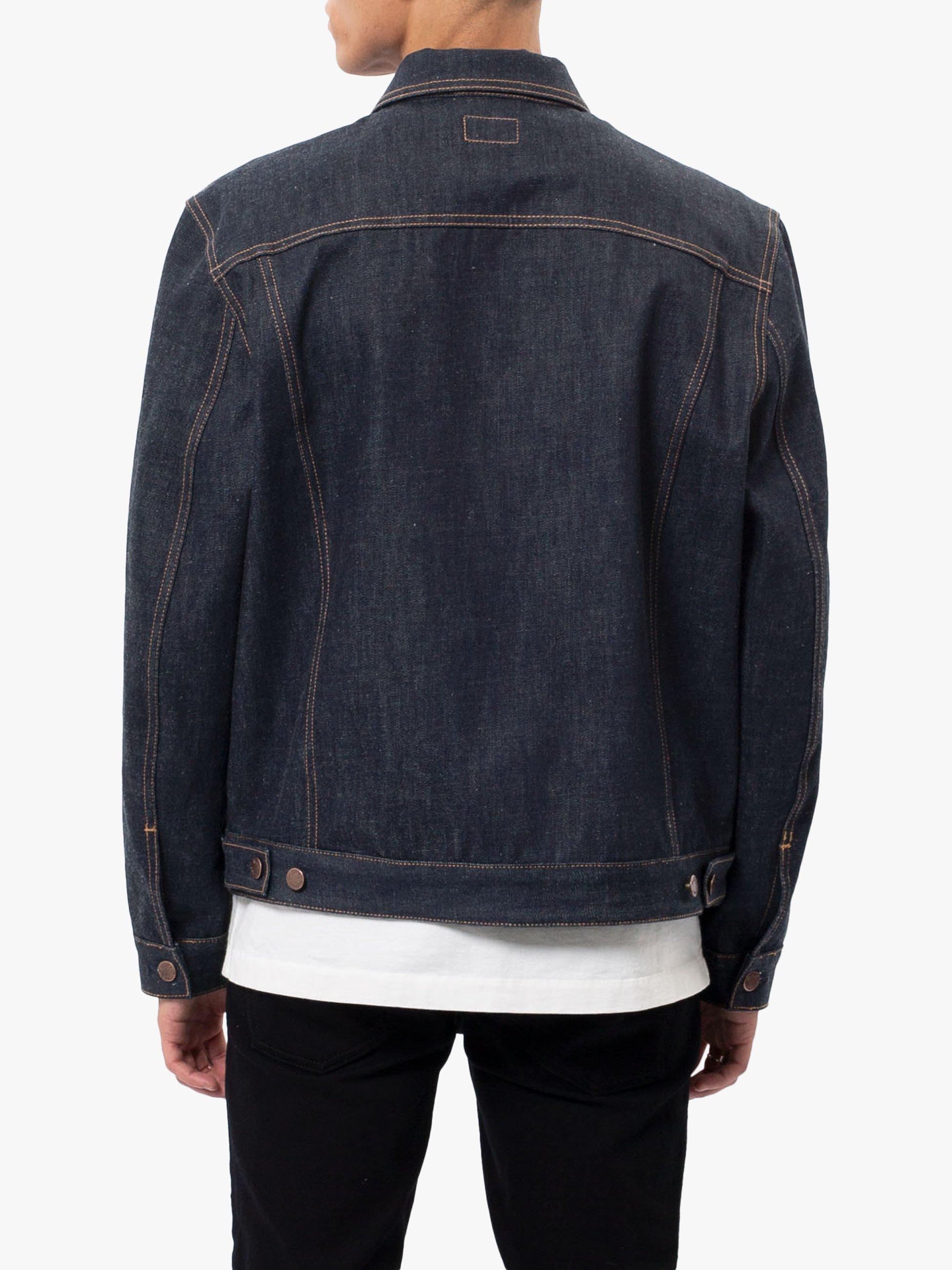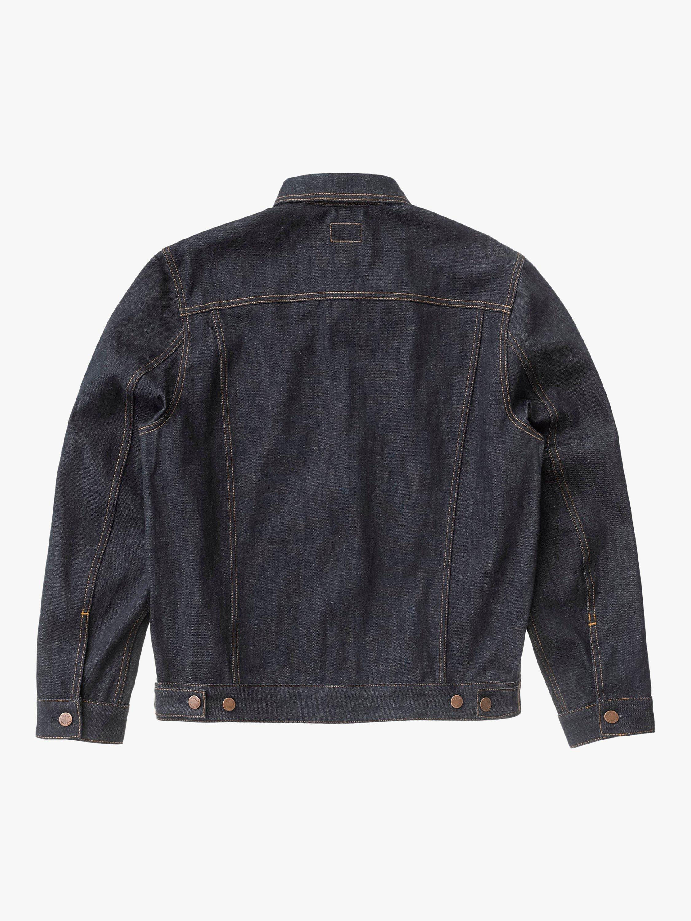 Distressed just enough to look like a pre-loved piece, it's only when it's treated to a dark and slightly warm wash Jerry shows its full potential. The denim fabrics coarse and open structure gives the piece a vintage feel and handle, with the twin needle felled seam construction helping create a beautiful contrast from dark to light, warmly tinted, indigo.