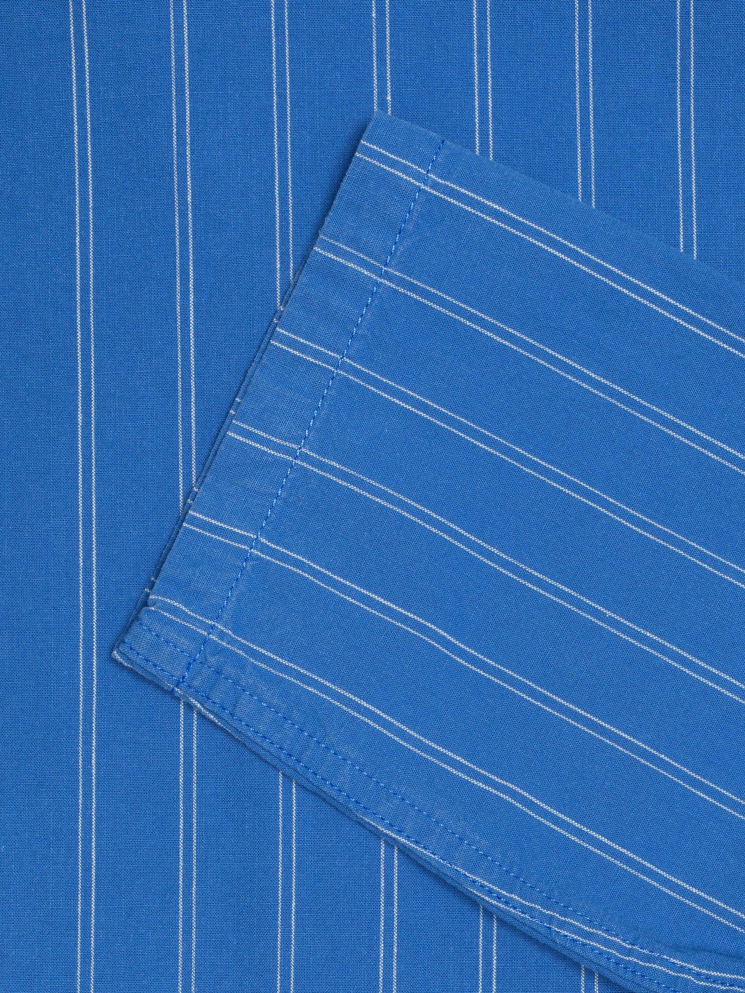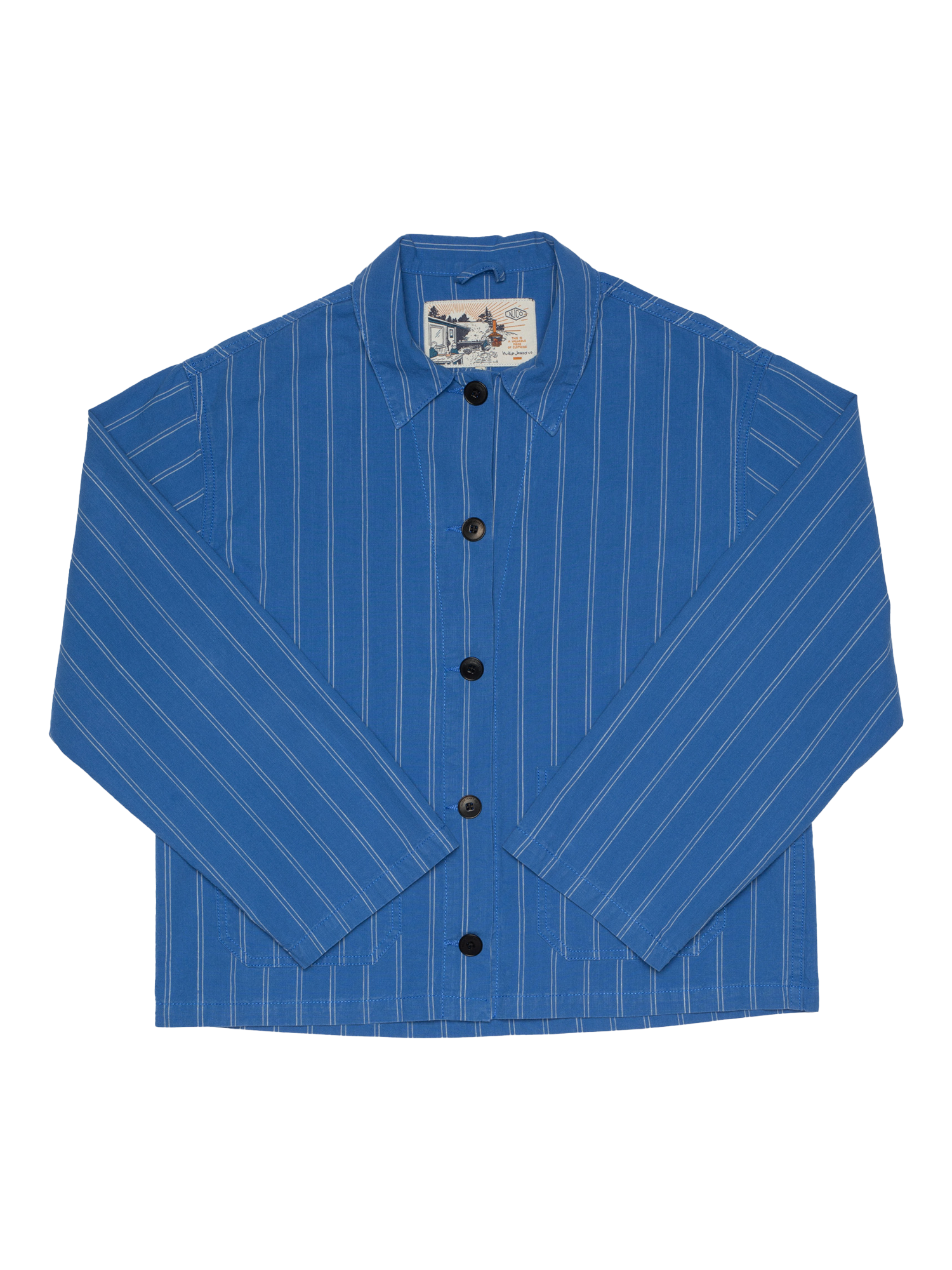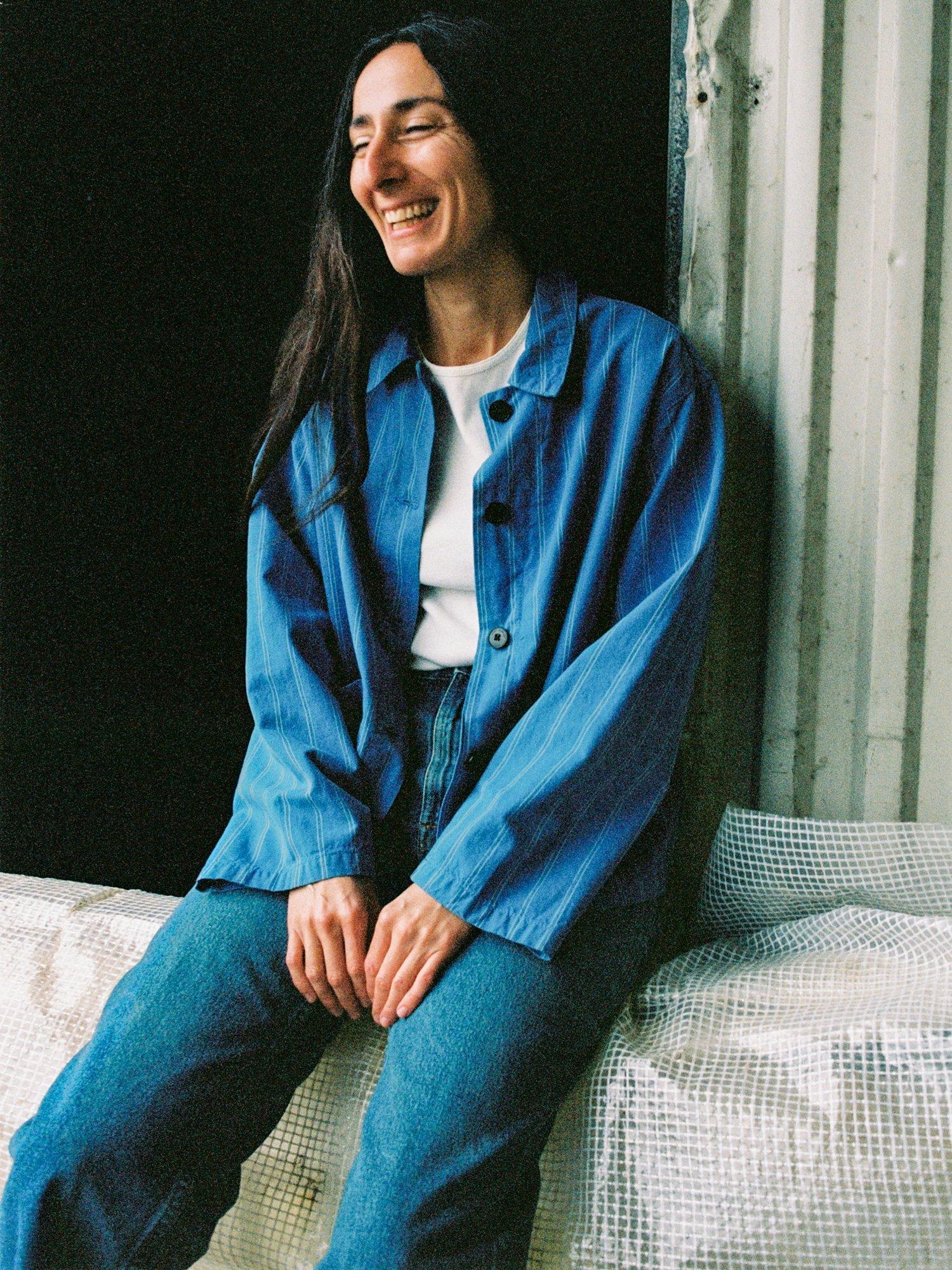 Introducing Kicki - a lightweight workwear-inspired jacket with a regular fit and two patch-on pockets. Crafted from a wonderful striped plain weave with dry, textural crispiness, Kicki strikes the perfect balance between lightweight and sturdy. The plain weave is constructed from irregular ring-spun yarn-dyed threads, giving Kicki its unique touch and look. Thanks to the patented dyeing process from our supplier, Kicki will age similarly to an indigo garment slowly brightening in tone and enhancing the fabric's texture. Kicki is exceptional from the start and will become even more beautiful with wear and washing. A garment perfectly suited for tomorrow's vintage.