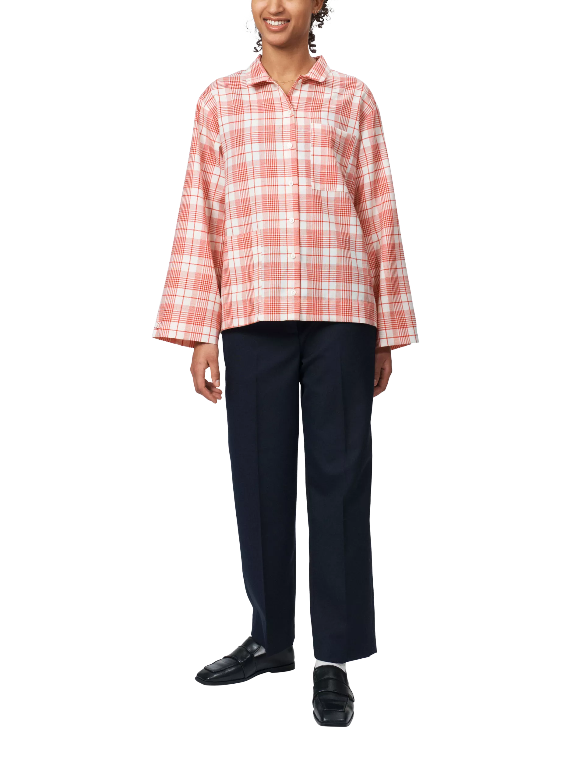 Mid waist trousers with straight legs and slightly cropped. Slanted pockets at front and welt pockets at the back.
