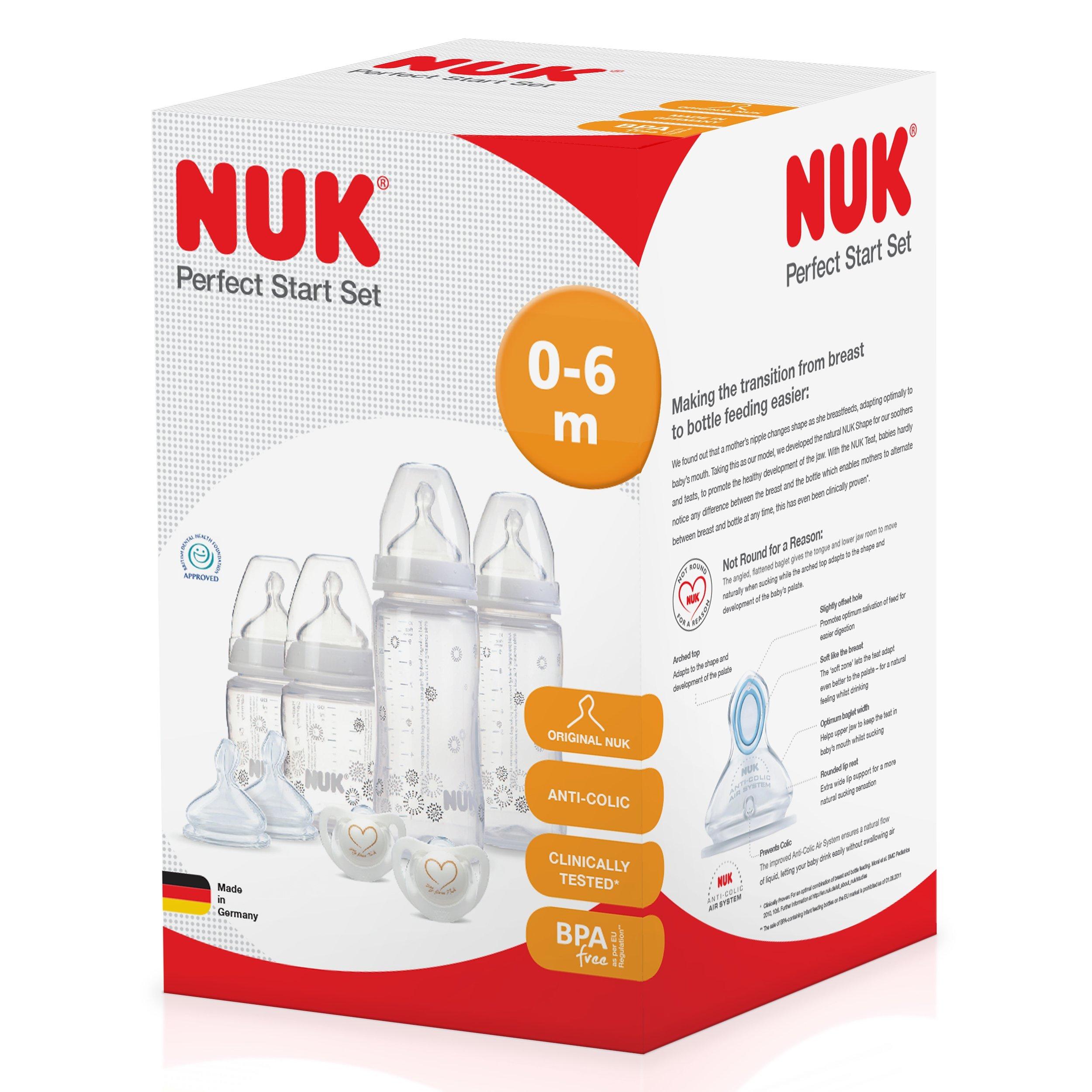 The NUK First Choice Starter Set includes all the essential items that new parents need. Included in the pack are two 150ml bottles and two NUK First Choice + Baby Bottles that are clinically proven for optimal combination of breast and bottle feeding.