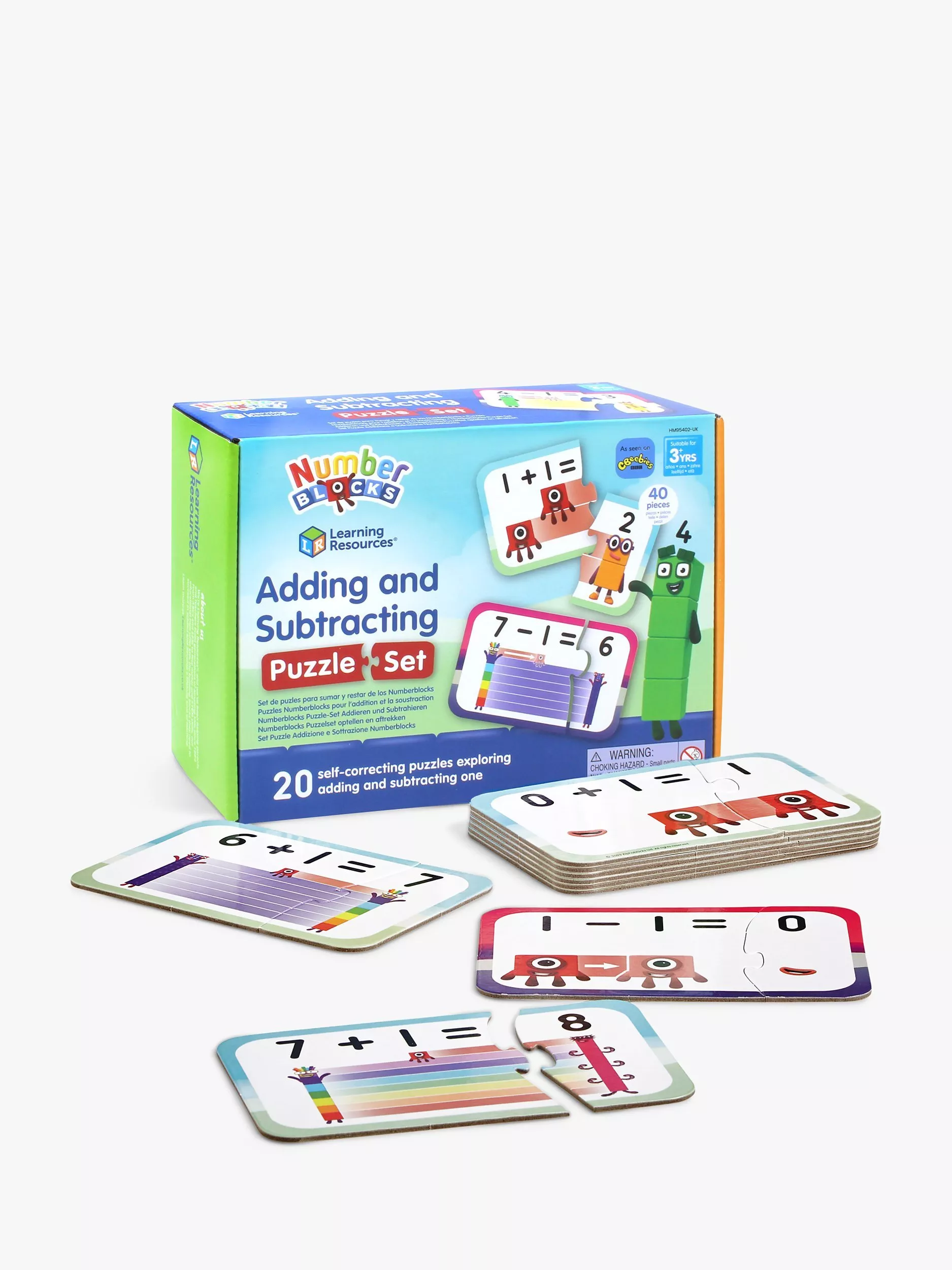 This puzzle set helps children explore the number magic that happens when they add or subtract. There are 10 addition puzzles and 10 subtraction puzzles featuring Numberblocks Zero to Ten. Each puzzle fits together in a unique way so there's only one correct answer, which allows children to puzzle out the answers themselves and learn independently. Made from durable card, the puzzles pieces store in the reusable box.