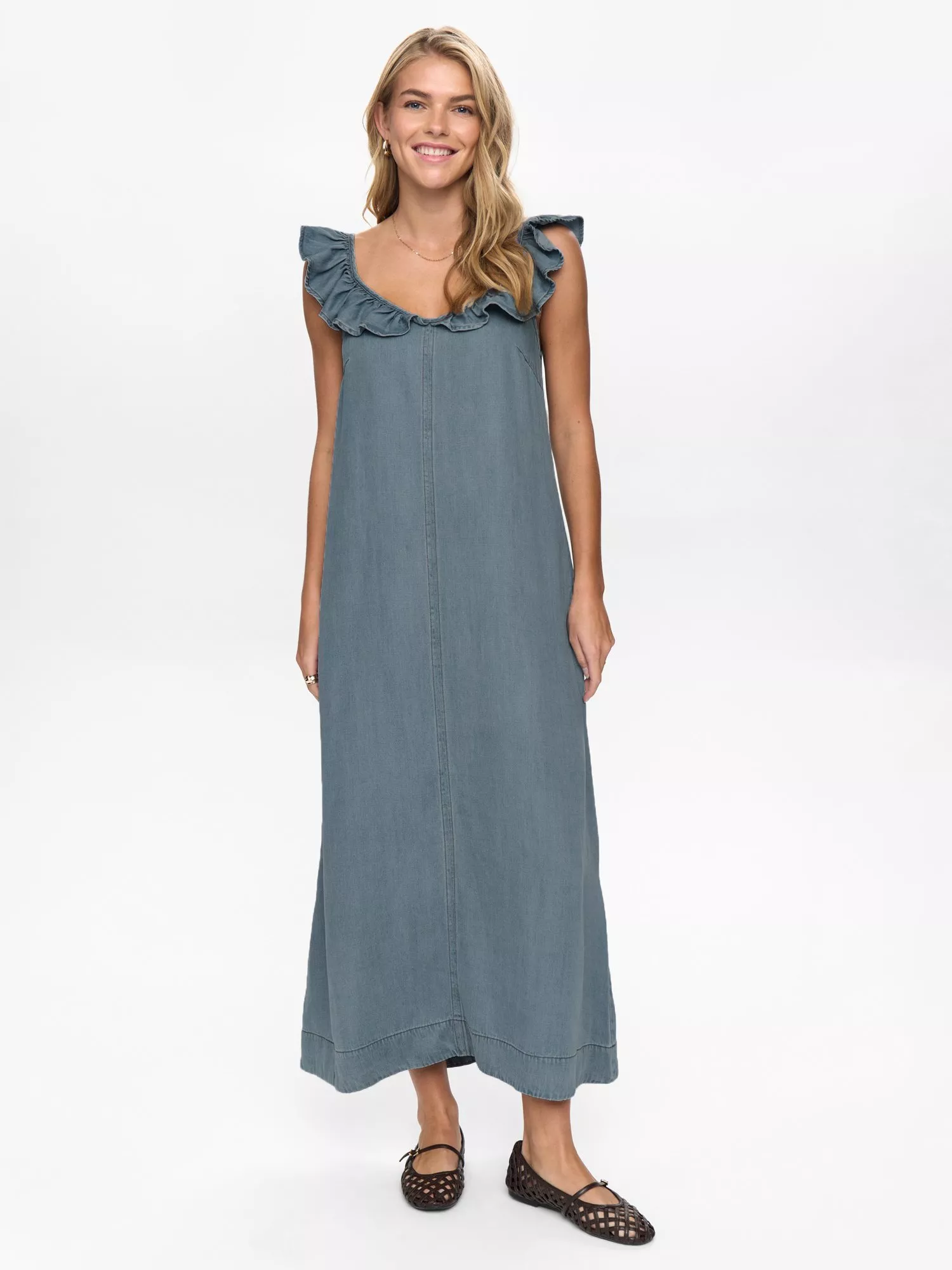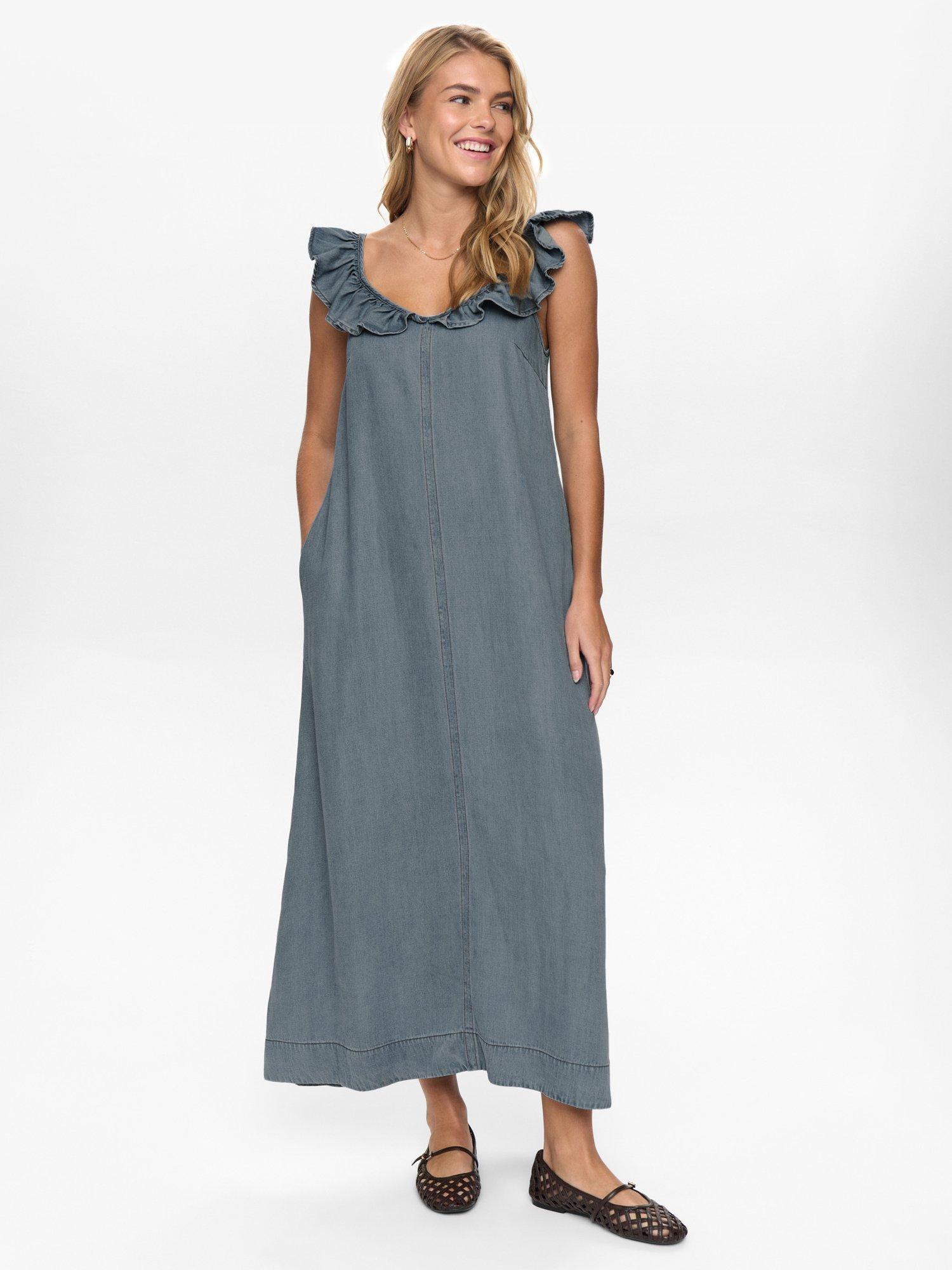 Proof a sheath silhouette is as timeless as ever. This sleeveless midi dress from Numph features a scoop and is finished with ruffles.