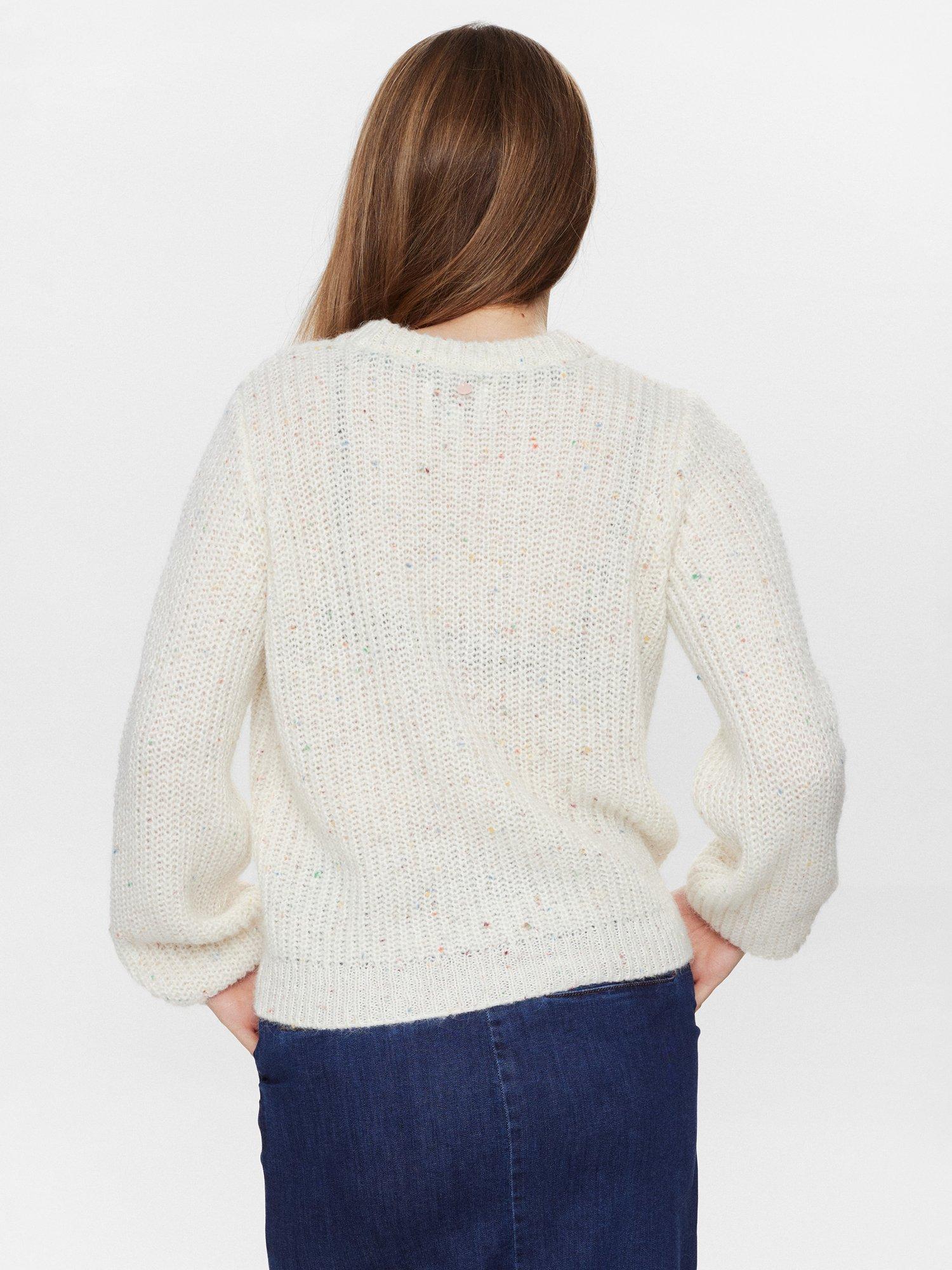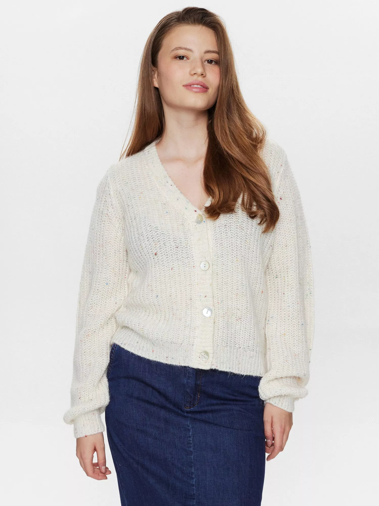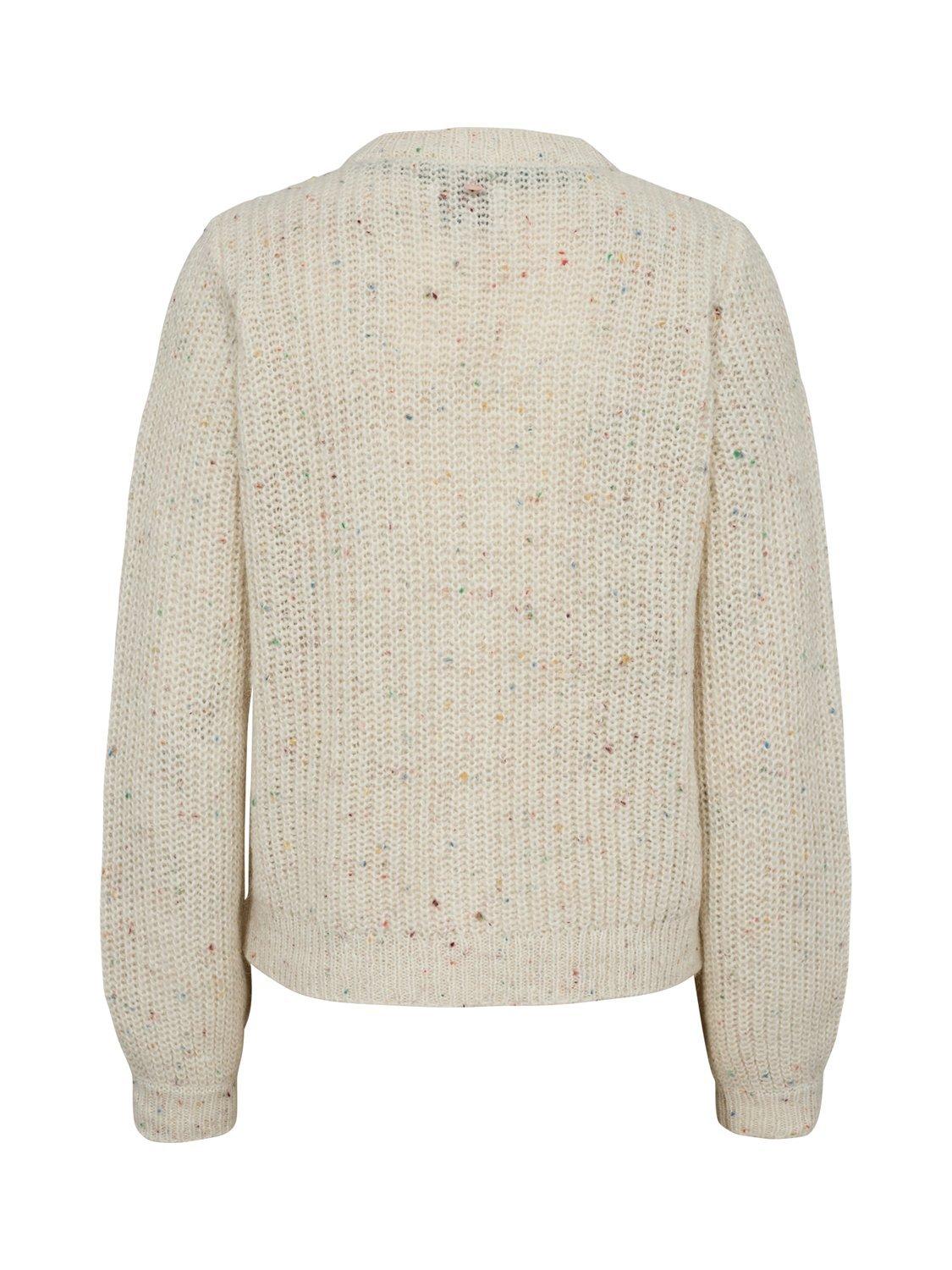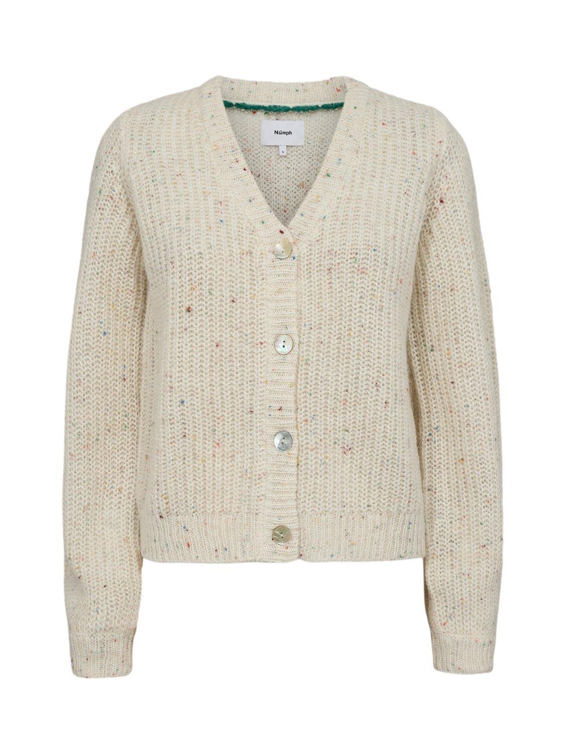 V-neckline cardigan with a flecked pattern made from soft blend that includes wool and a touch of alpaca for extra warmth and softness.